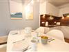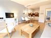 Wohn- und Esszimmer in warmen Erdtönen mit blauen Akzenten und offener Küche mit großzügigem Essplatz für 4 Personen, gemütliche Sitzgarnitur mit Blick auf die kleine Terrasse, voll ausgestattete Küche mit Kaffeemaschine, Toaster, Geschirrspüler, Herd, Back-/Grillkombination und Mikrowelle, gemütliches Schlafzimmer mit Doppelbett, Badezimmer mit Dusche, WC, Waschtisch und Föhn