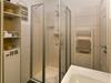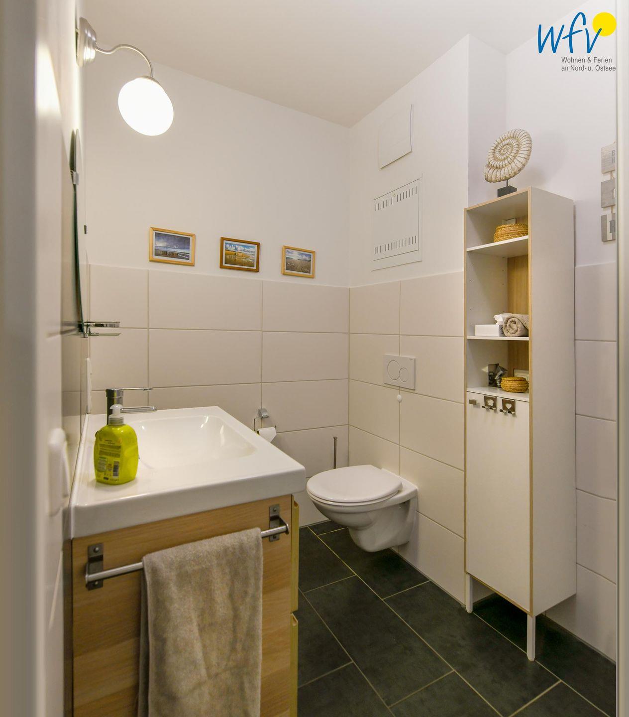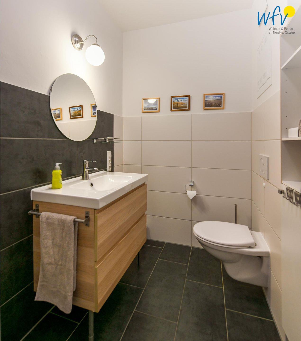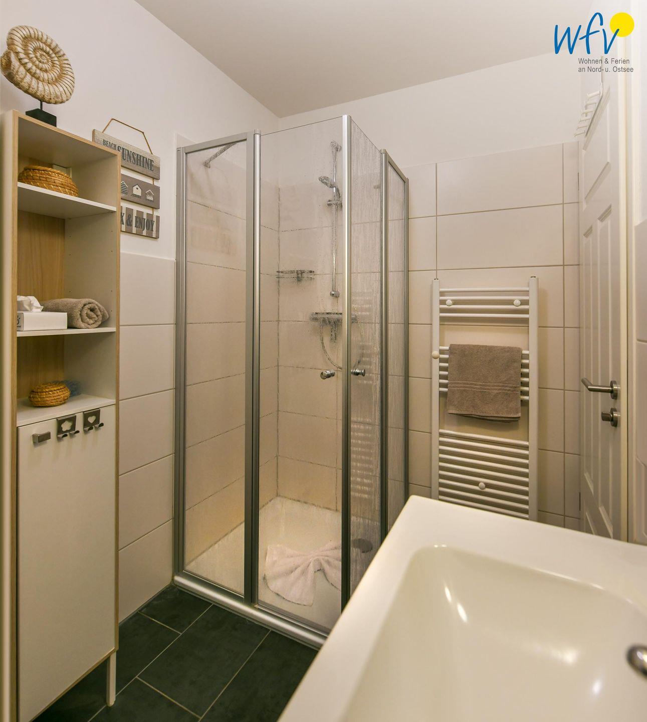 Das geschmackvoll eingerichtete Bad mit Fußbodenheizung und Dusche mit niedrigem Einstieg sorgt für weiteren Wohnkomfort. Zudem ist das Bad mit ausreichend Ablageflächen, Schubladen und Haken für vier Personen sowie einem Föhn und einem Kosmetikspiegel ausgestattet.