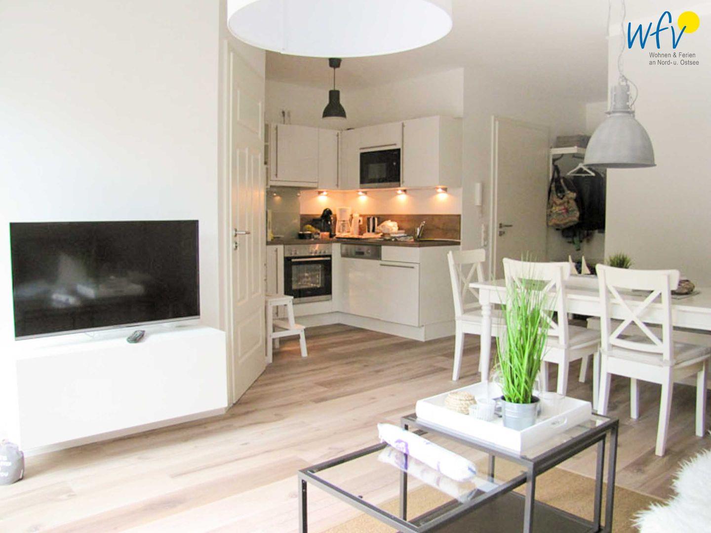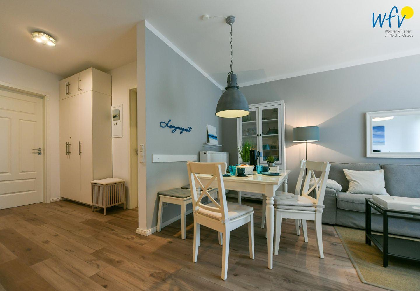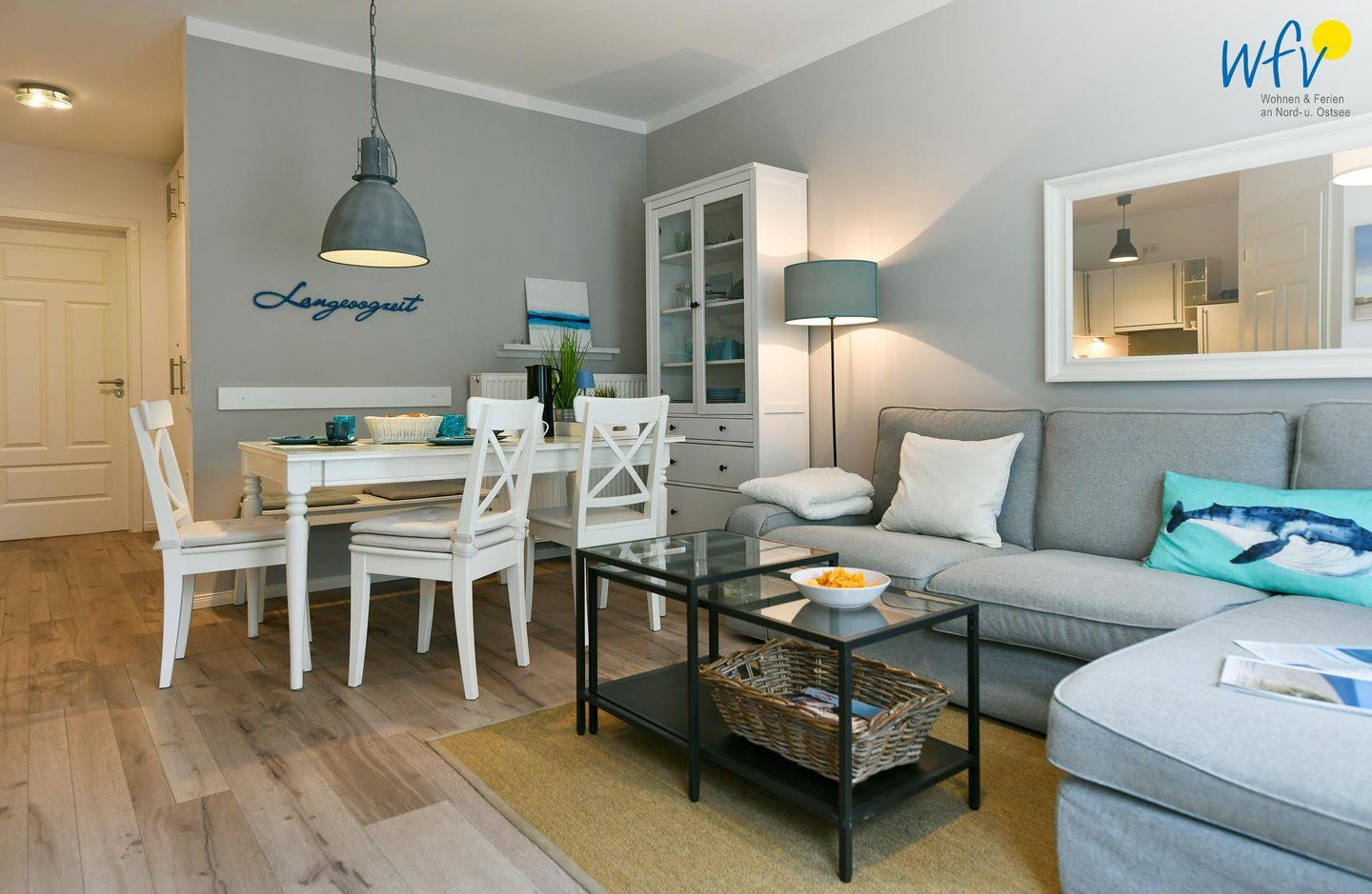 Der helle Wohnbereich ist mit ist Couch, Flachbildschirm, Musikanlage und WLAN ausgestattet. Ein großer Esstisch bietet bspw. genügend Platz zum Spielen und Basteln. Die gemütliche Atmosphäre lädt auch bei schlechtem Wetter zum Verweilen ein und auf dem Sofa mit Récamiere haben Sie ausreichend Platz für ein gemütliches Beisammensein. Gesellschaftsspiele und Bücher sind vorhanden.