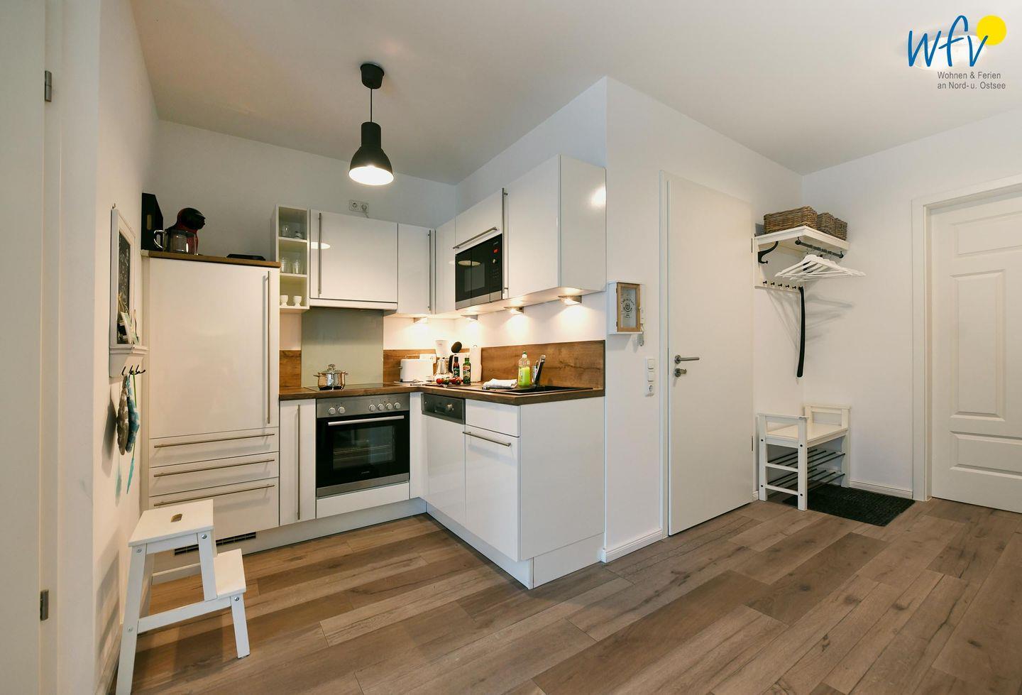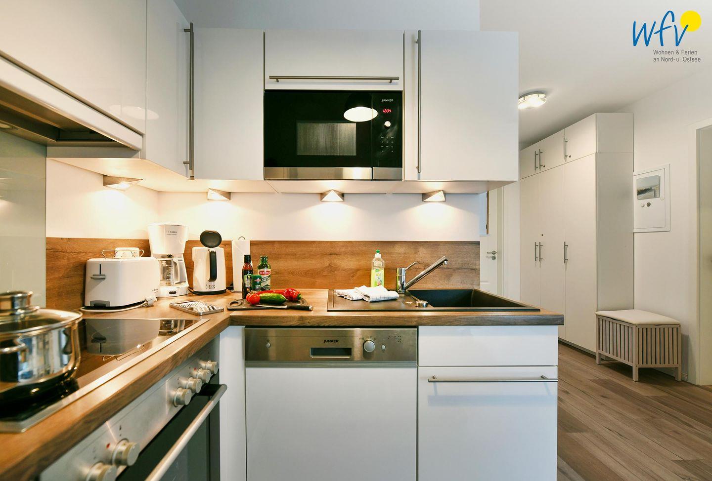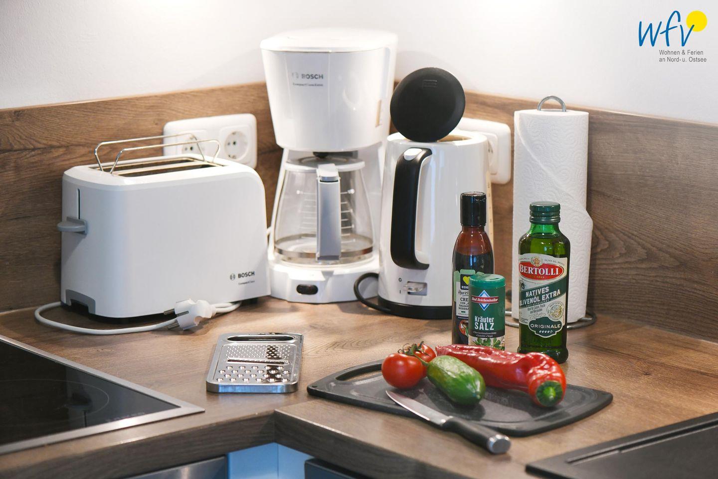 Snacks für den Ausflug oder das Dinner am Abend lassen sich schnell und bequem in der hochwertigen und modernen Hochglanzküche zubereiten. Sie verfügt u.a. über Ceranfeld, Backofen, Spülmaschine, Kühlschrank mit Gefrierfach, und Einbaumikrowelle sowie über Wasserkocher, Toaster, Kapselmaschine (Dolce Gusto), Kaffeemaschine und Radio.
