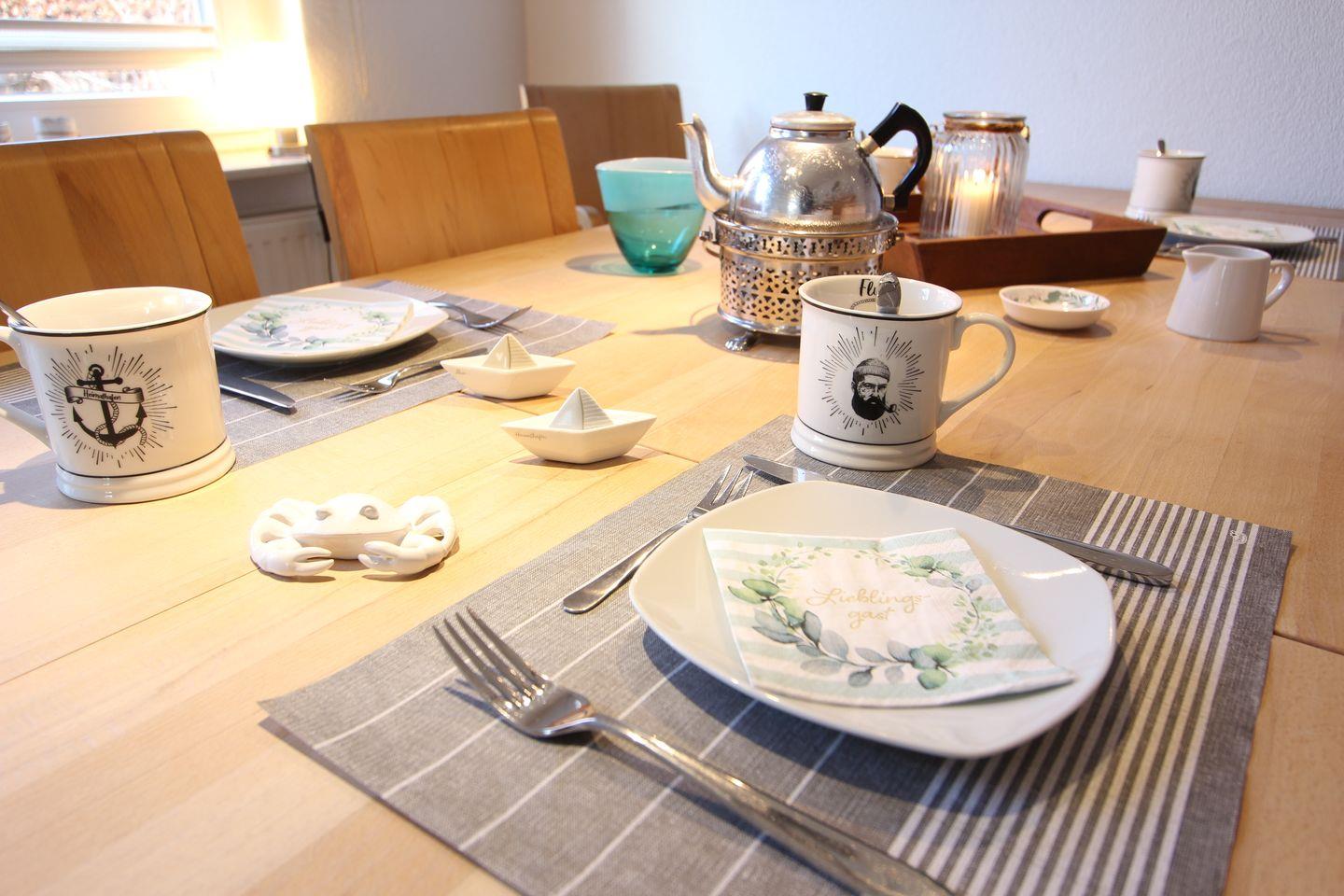 Zur Ausstattung gehören selbstverständlich Handtücher, Bettwäsche, Föhn, Staubsauger, Waschmaschine und Spülmaschine. Für unsere kleinen Seefahrer stehen zudem ein Reisebett und ein Hochstuhl bereit.