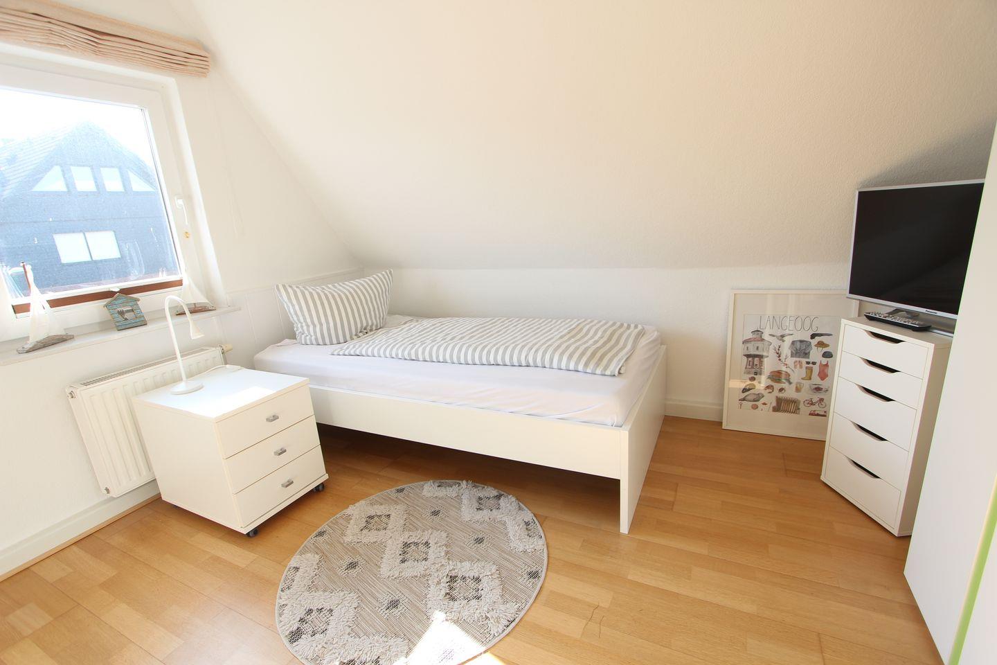 Im Obergeschoss befinden sich drei gemütliche Schlafzimmer mit einem Doppelbett, einem Etagenbett sowie zwei Einzelbetten. Das großzügige Bad mit Wanne und Dusche sorgt nach einem langen Strandspaziergang für wohltuende Entspannung. Auf der Dachterrasse lassen sich die letzten Sonnenstrahlen genießen – vielleicht mit einem Sundowner in der Hand und dem Blick in den weiten Inselhimmel.