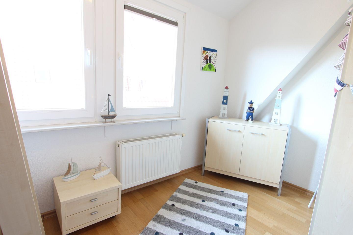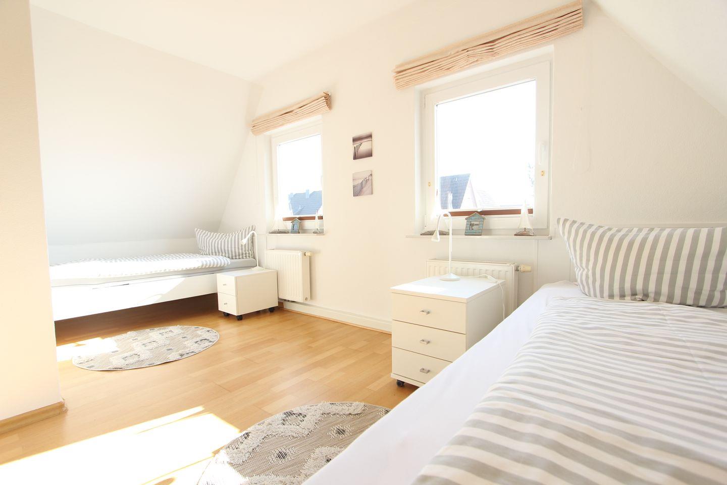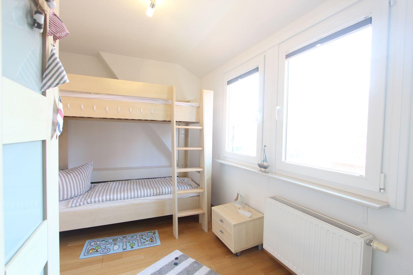 OG: drei gemütliche Schlafzimmer mit einem Doppelbett, einem Etagenbett sowie zwei Einzelbetten, Duschbad, Dachterrasse