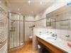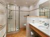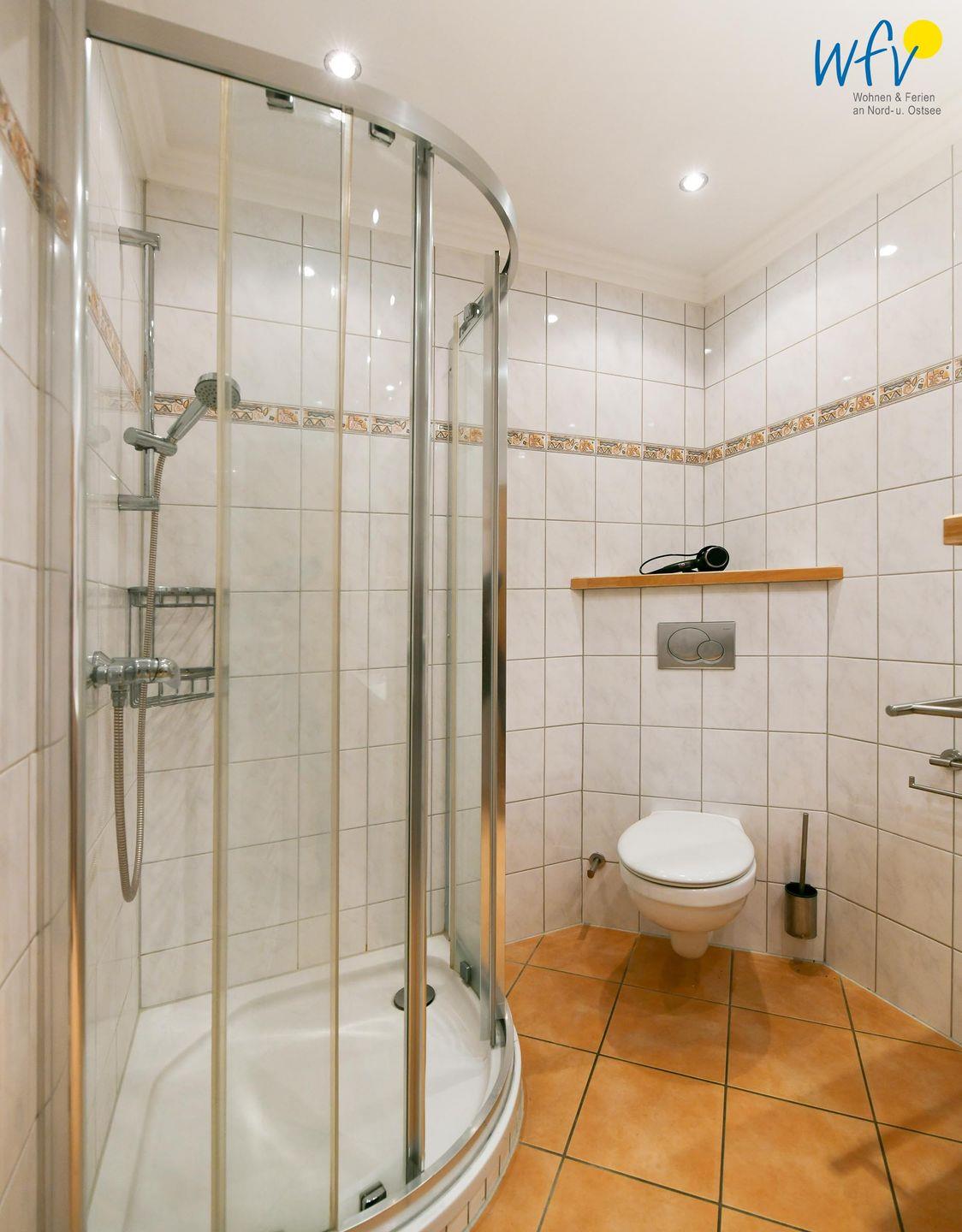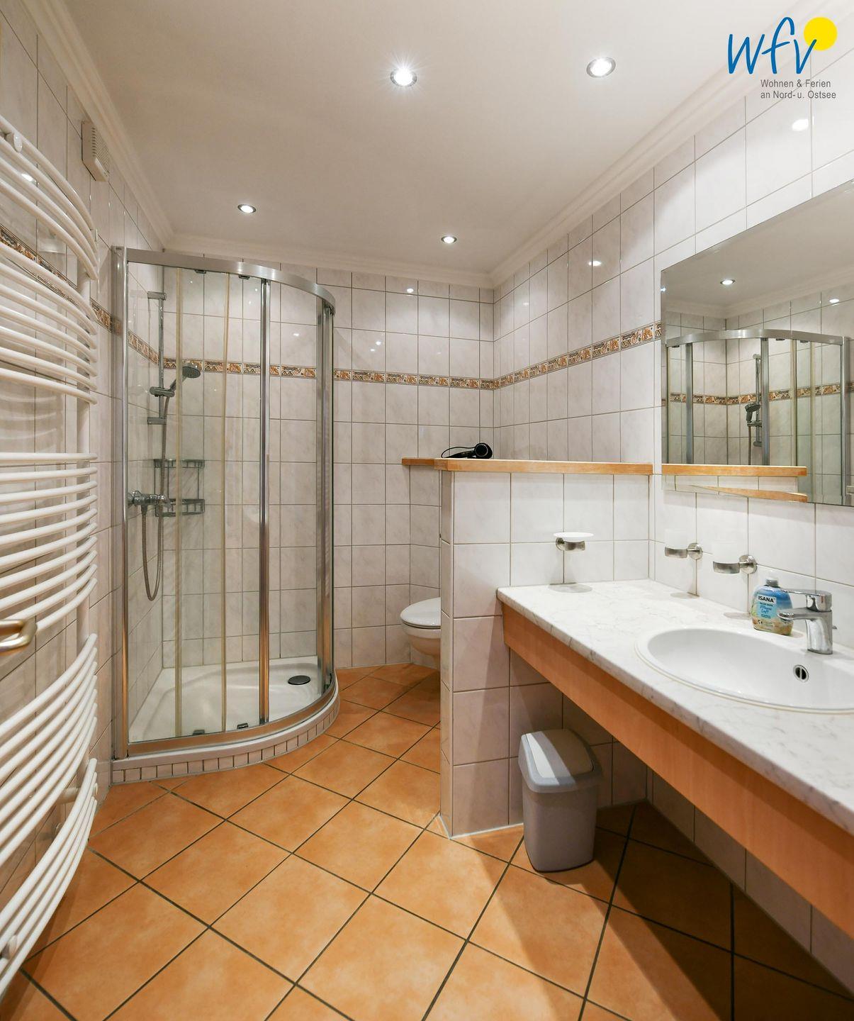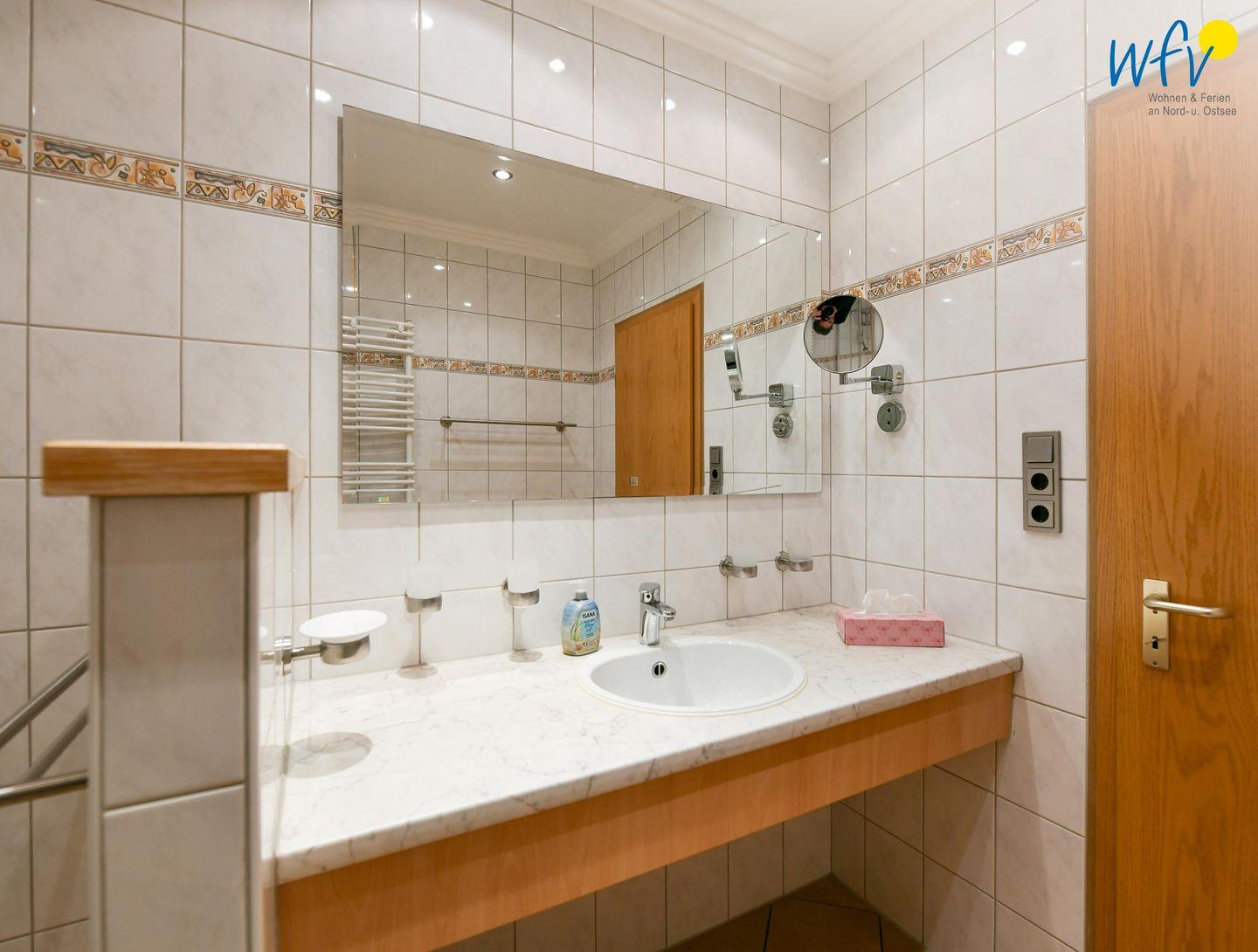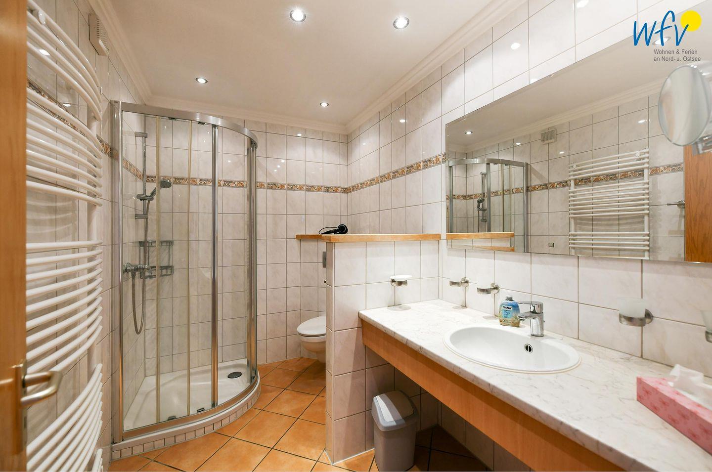 Das große moderne Badezimmer mit breitem Waschtisch, Dusche und WC sowie großem Spiegel, Handtuchheizkörper und Föhn sorgt für weiteren Wohnkomfort.