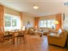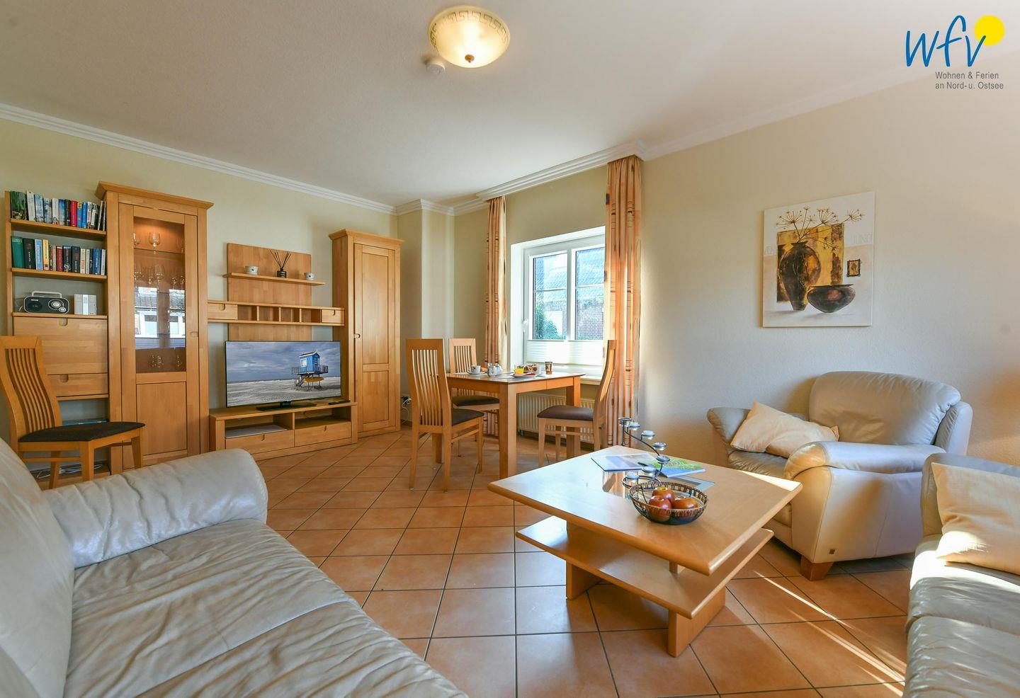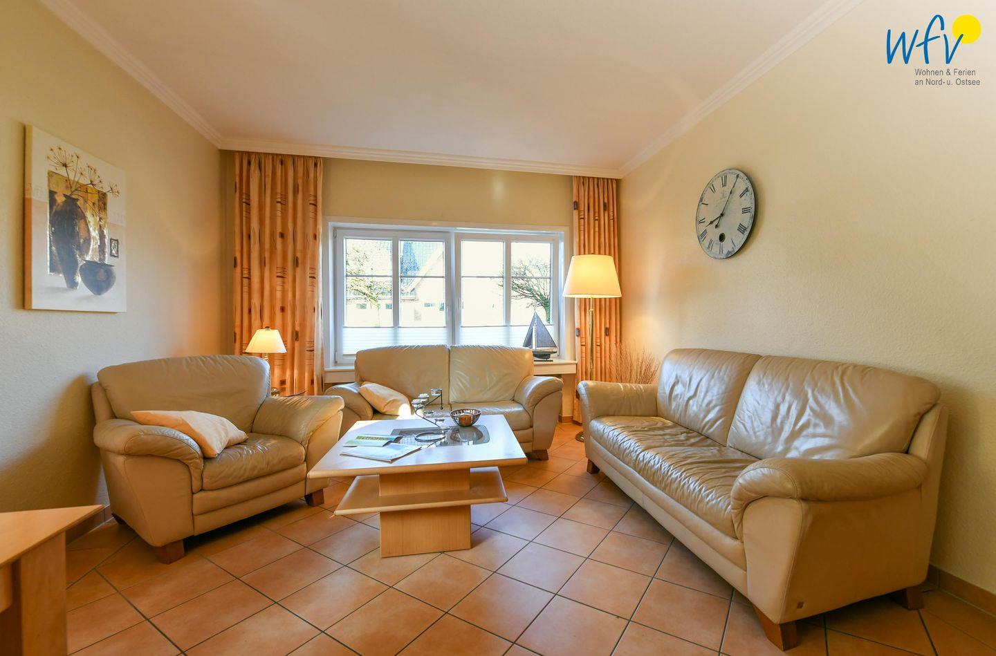 Nach der Fahrradtour oder dem Strandtag lädt der lichtdurchflutete Wohnbereich mit Couch, Sessel und Essecke zu gemütlichen Stunden mit der Familie ein.