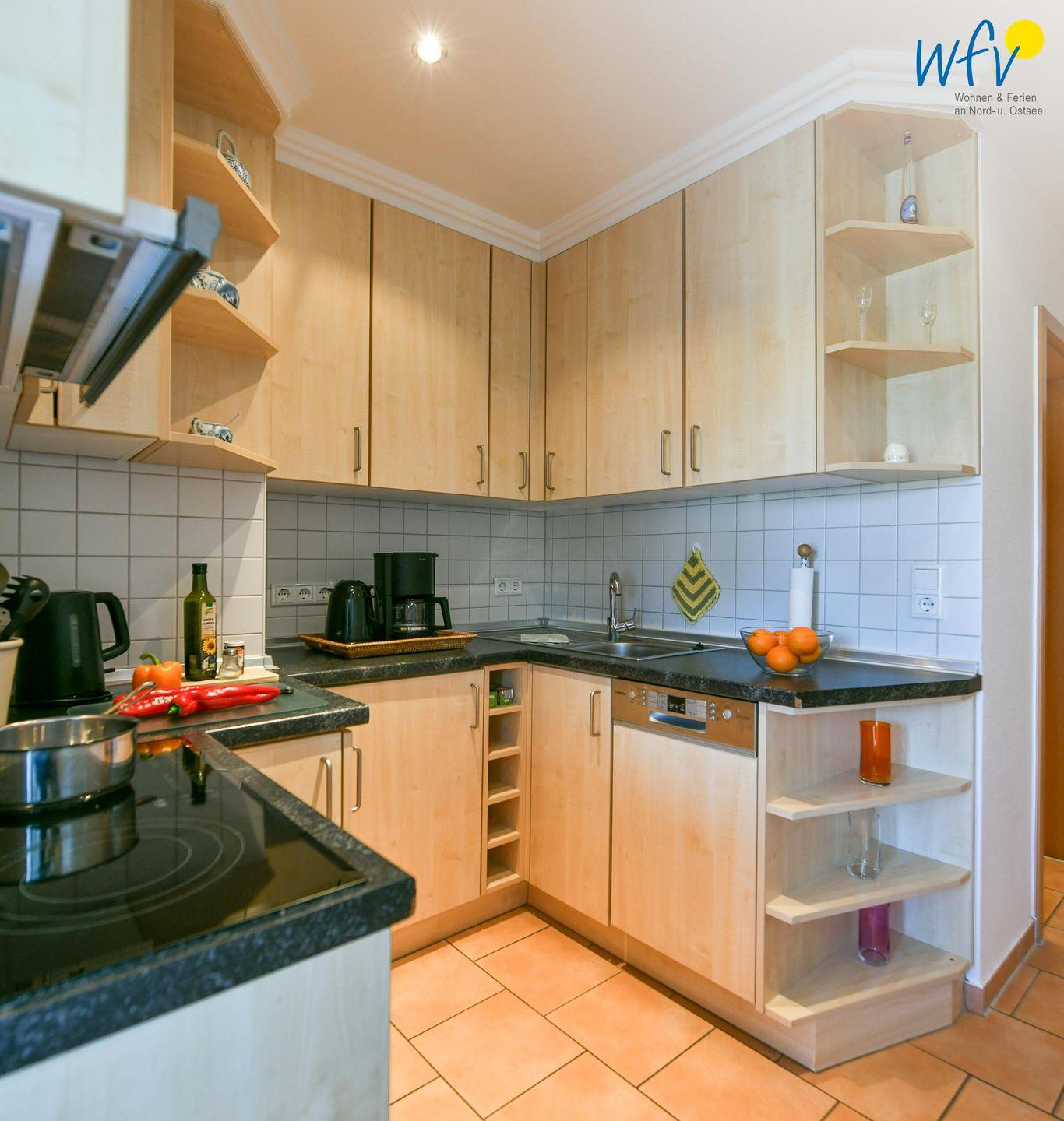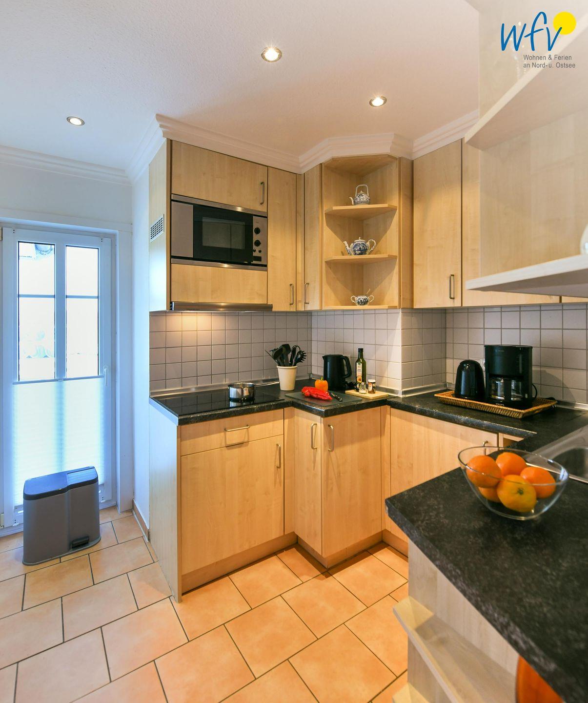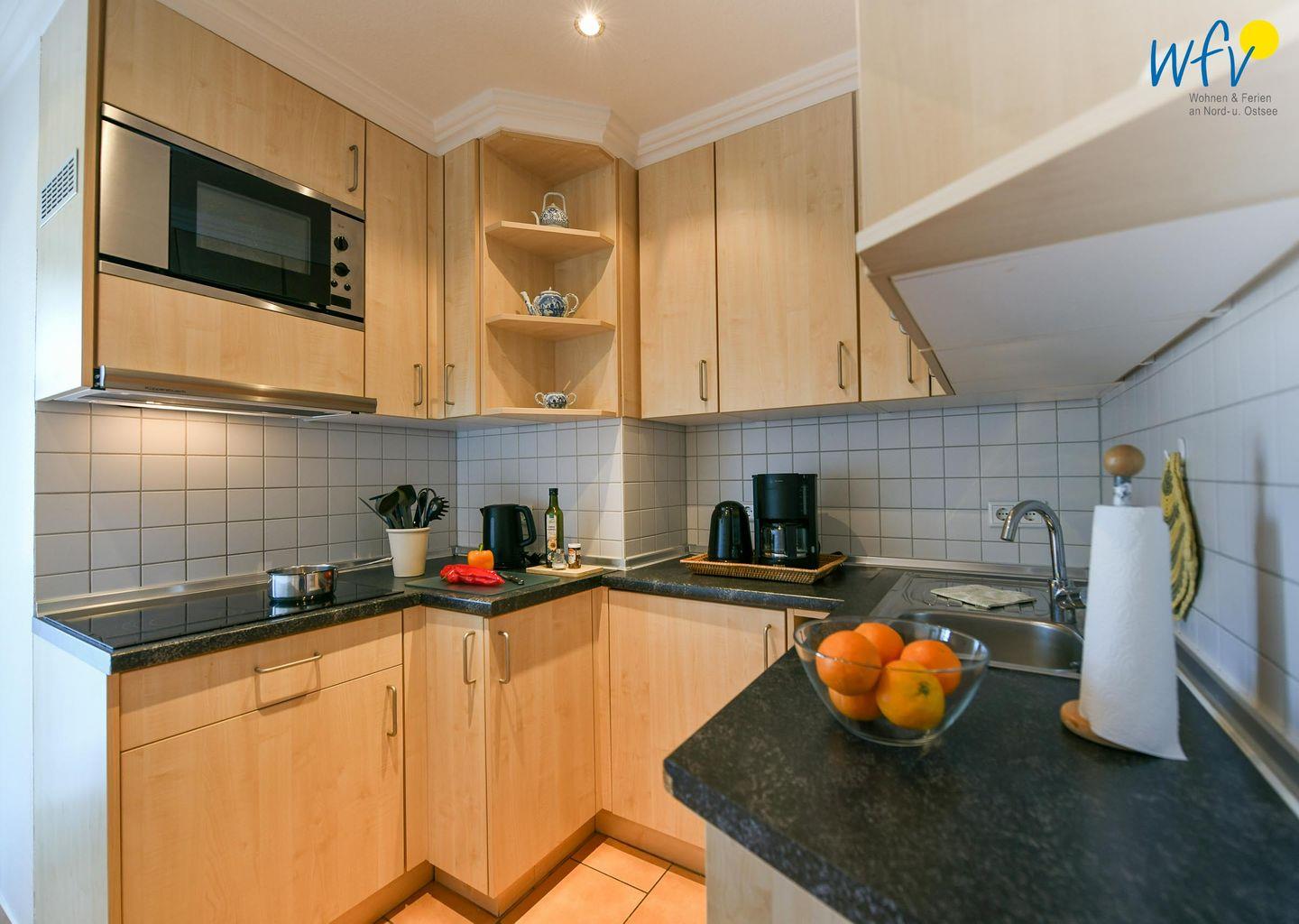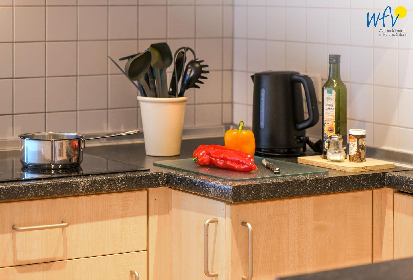 Das Ferienfrühstück, Snacks für den Ausflug oder das Dinner lassen sich bequem in der separaten Küche zubereiten, die u.a. mit einem Cerankochfeld, Mikrowelle, Spülmaschine, Spüle, Toaster und Kaffeemaschine ausgestattet ist.