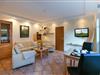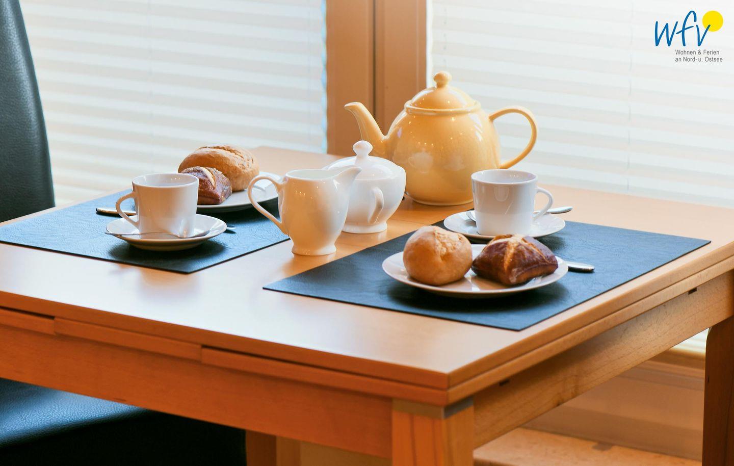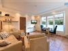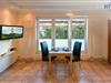 Nach der Fahrradtour oder dem Strandspaziergang lädt der gemütliche Wohnbereich mit Couch, Sesseln und Esstisch zu gemeinsamen Stunden zu zweit ein. Bodentiefe Fenster sorgen hier und auch im Schlafzimmer für eine helle und freundliche Atmosphäre.