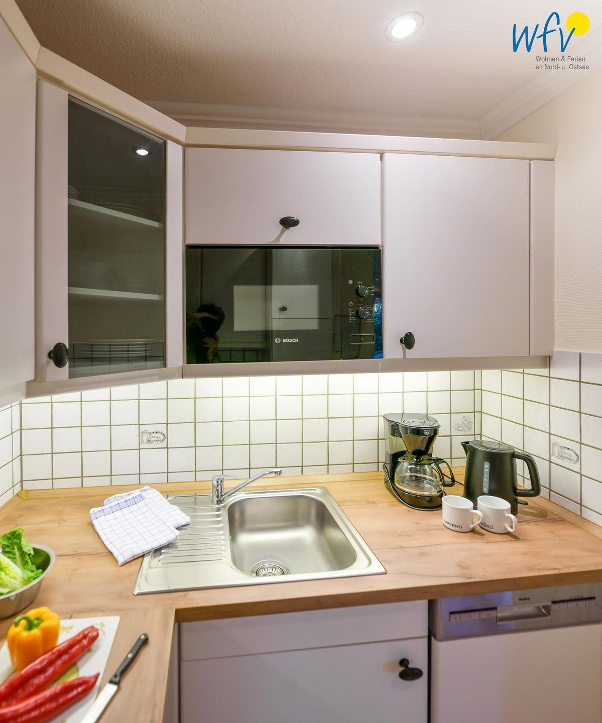 Snacks für den Ausflug, das Ferienfrühstück oder das Dinner lassen sich bequem in der komplett eingerichteten Küchennische zubereiten. Sie verfügt u.a. über Induktionsherd, Mikrowelle, Spülmaschine, Spüle, Toaster, Kaffeemaschine und Kühlschrank mit Eisfach.