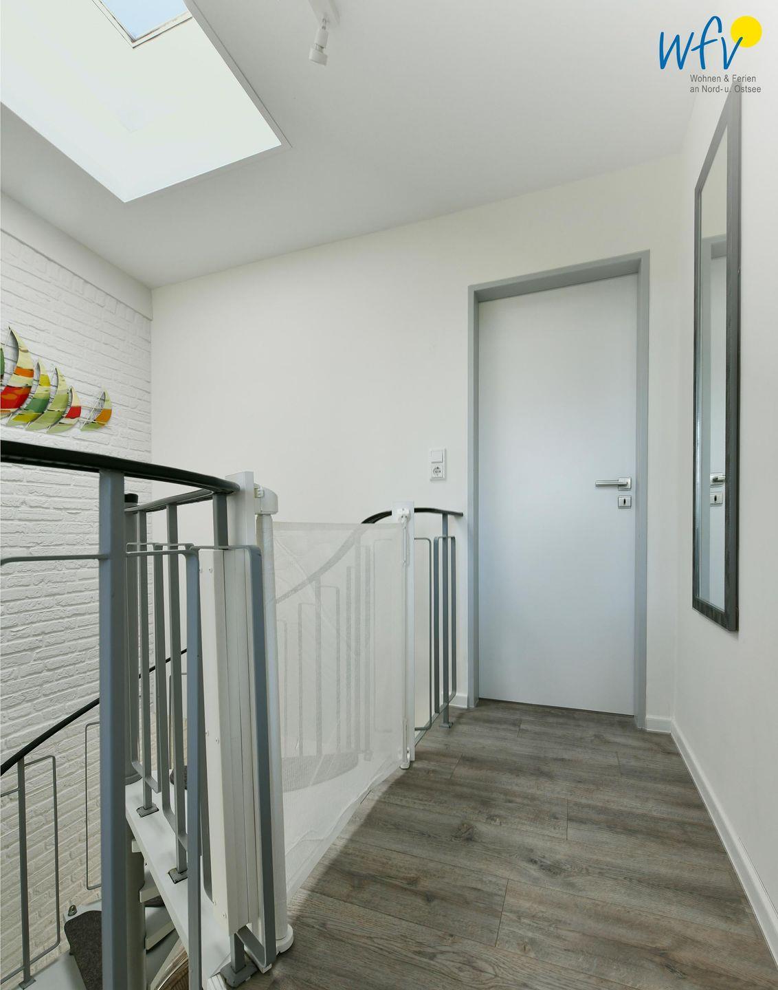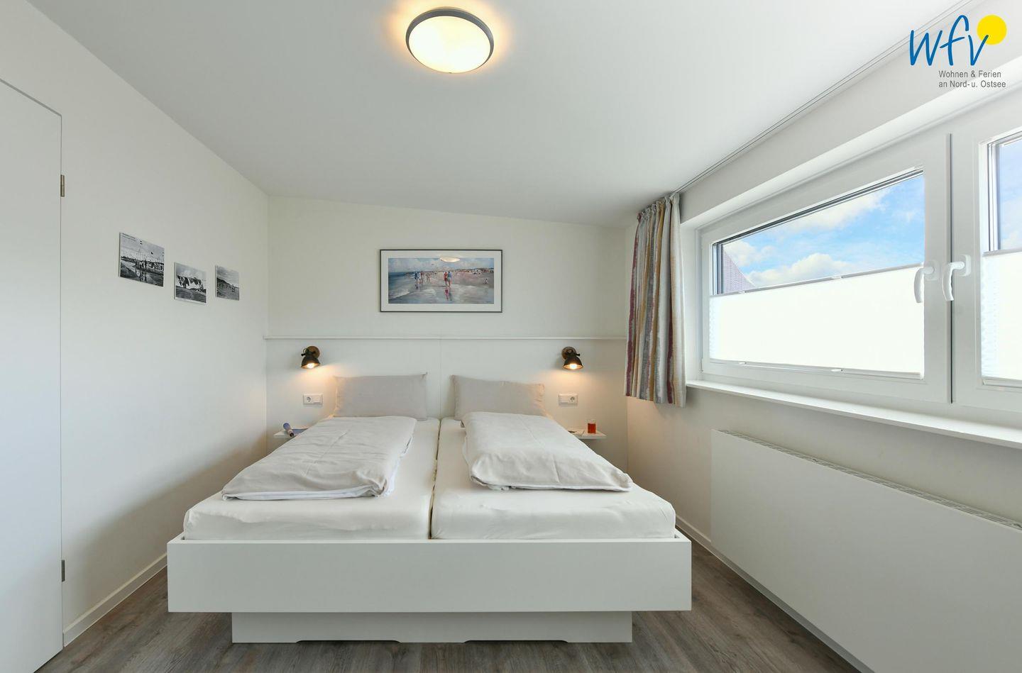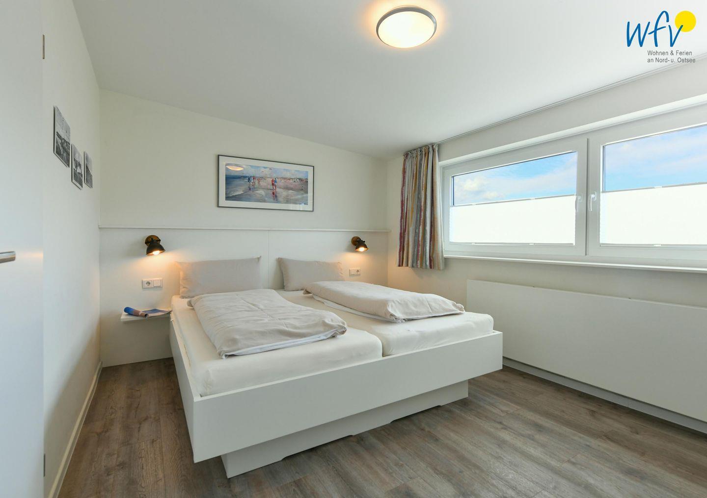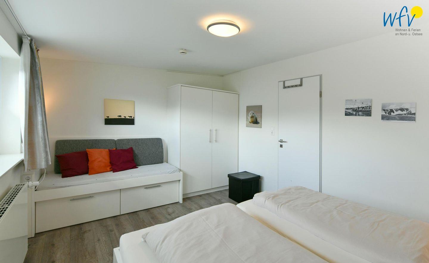 Eine Wendeltreppe führt zu den zwei separaten Schlafzimmern im Obergeschoss. Eines der Zimmer ist mit Doppelbett (180 x 200 cm) und kleiner Sitzecke ausgestattet. Dieser Raum besticht durch seine Panoramafensterfront mit einem traumhaften Blick in die Langeooger Dünenwelt. Genießen Sie vom angrenzenden möblierten Balkon die Luft und die Landschaft samt wunderschönen Sonnenaufgängen - sogar das Meer hören Sie hier rauschen! In dem anderen Schlafzimmer zur Gartenseite hin befindet sich neben dem Doppelbett (180 x 200 cm) ein Kinderbett für unsere kleinen Nordseeurlauber (120 x 70 cm). Die Schlafcouch im Wohnzimmer kann zu einem komfortablen kleinen Doppelbett umfunktioniert werden (160 x 200 cm).