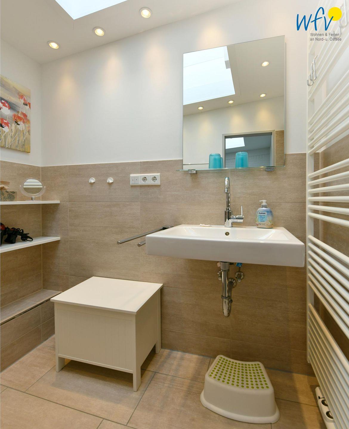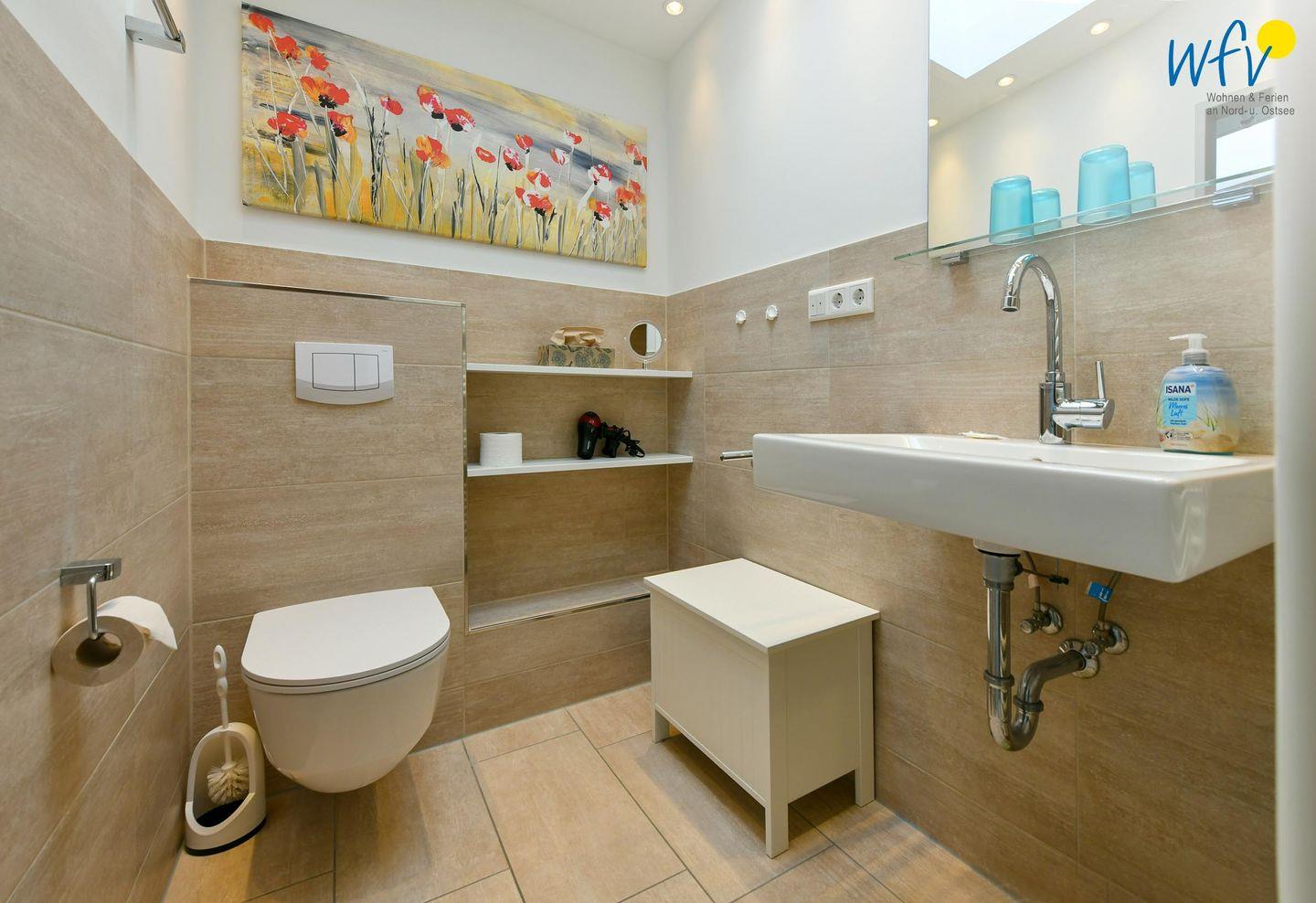 Das großzügige Tageslichtbad im OG mit geräumiger bodengleicher Dusche, WC und Waschtisch sowie die zusätzliche Gästetoilette im EG sorgen für weiteren Wohnkomfort und entspannen die täglichen Badezimmerroutinen.