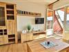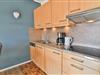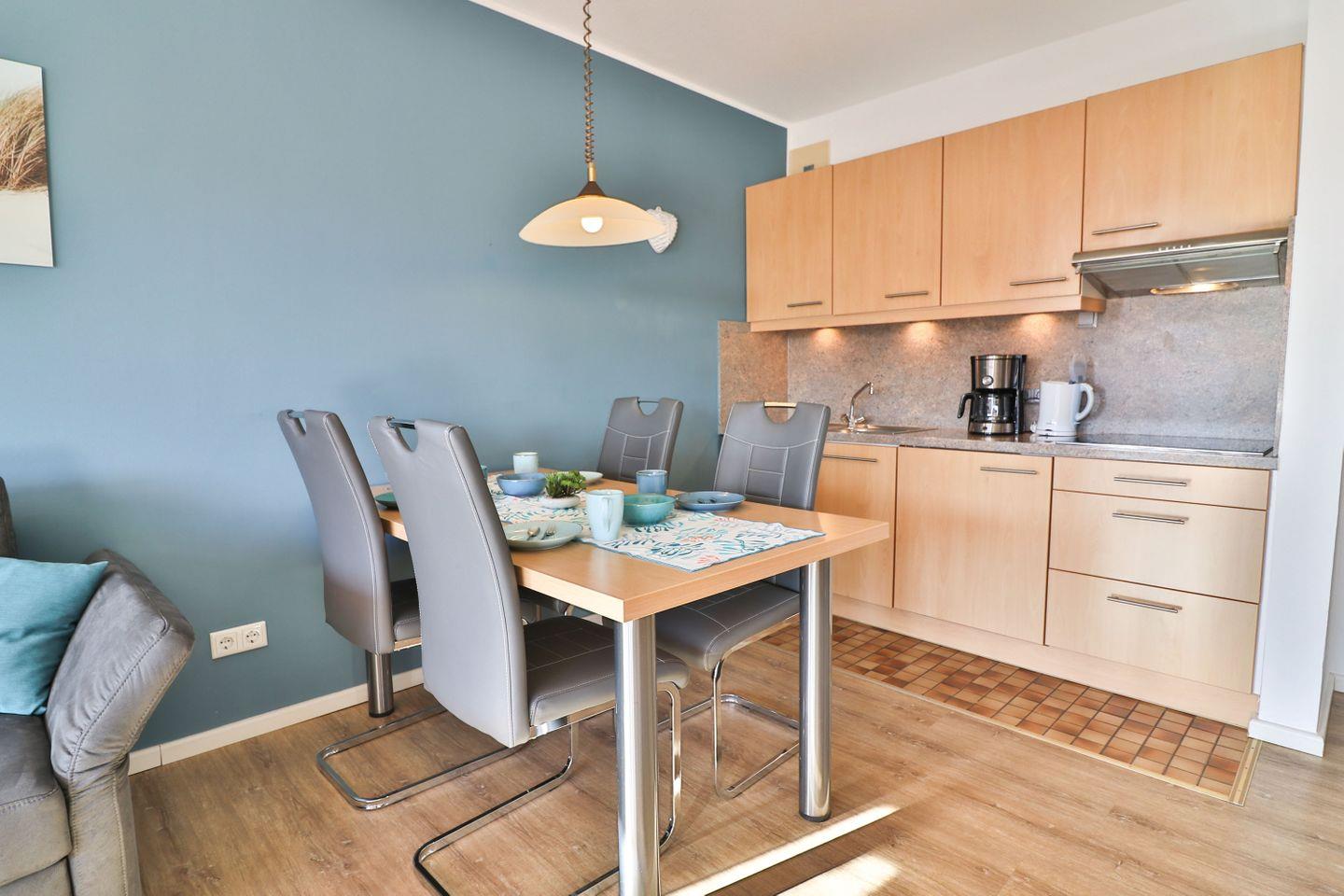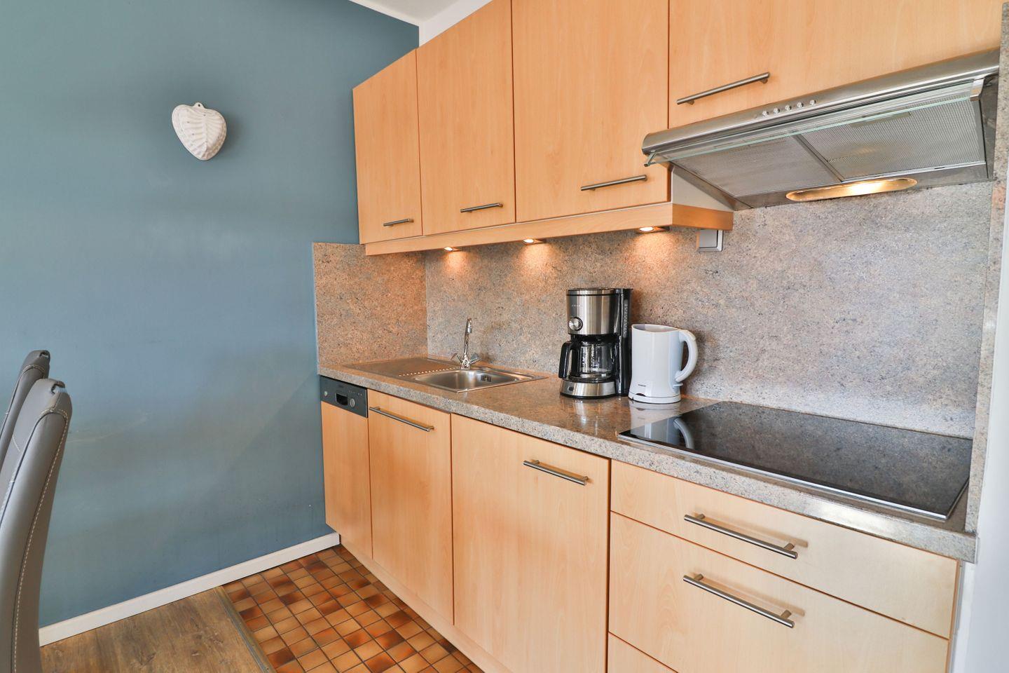Die offene Küche ist funktional in den Wohnraum integriert und bietet mit 4-Platten-Ceran-Herd, Mikrowelle, Kühlschrank mit Gefrierfach, Spülmaschine, Kaffeemaschine, Toaster und Wasserkocher eine komfortable Grundlage für Ihre Selbstversorgung. Ein kleiner Backofen im Abstellraum ermöglicht Ihnen die Zubereitung zusätzlicher Speisen, die Sie am Esstisch genießen können.