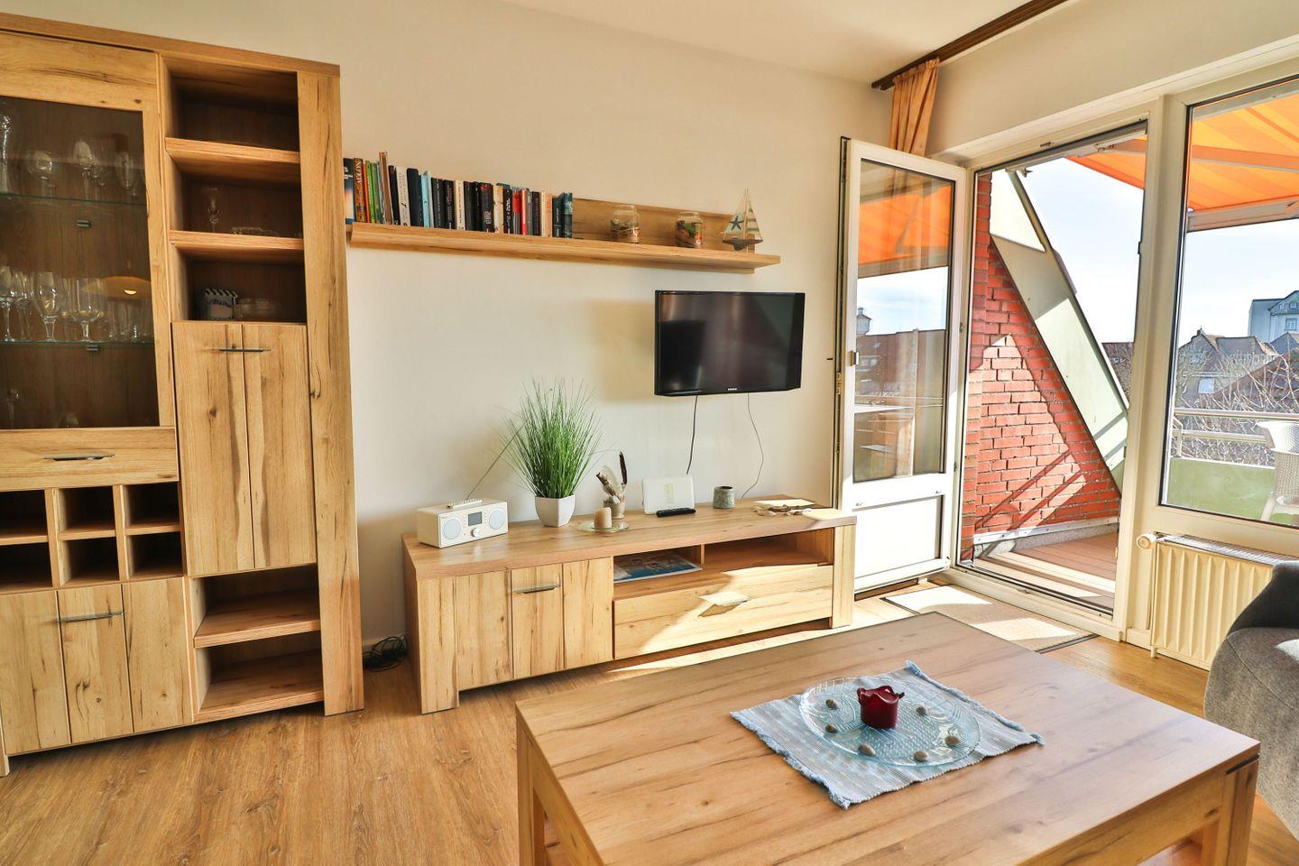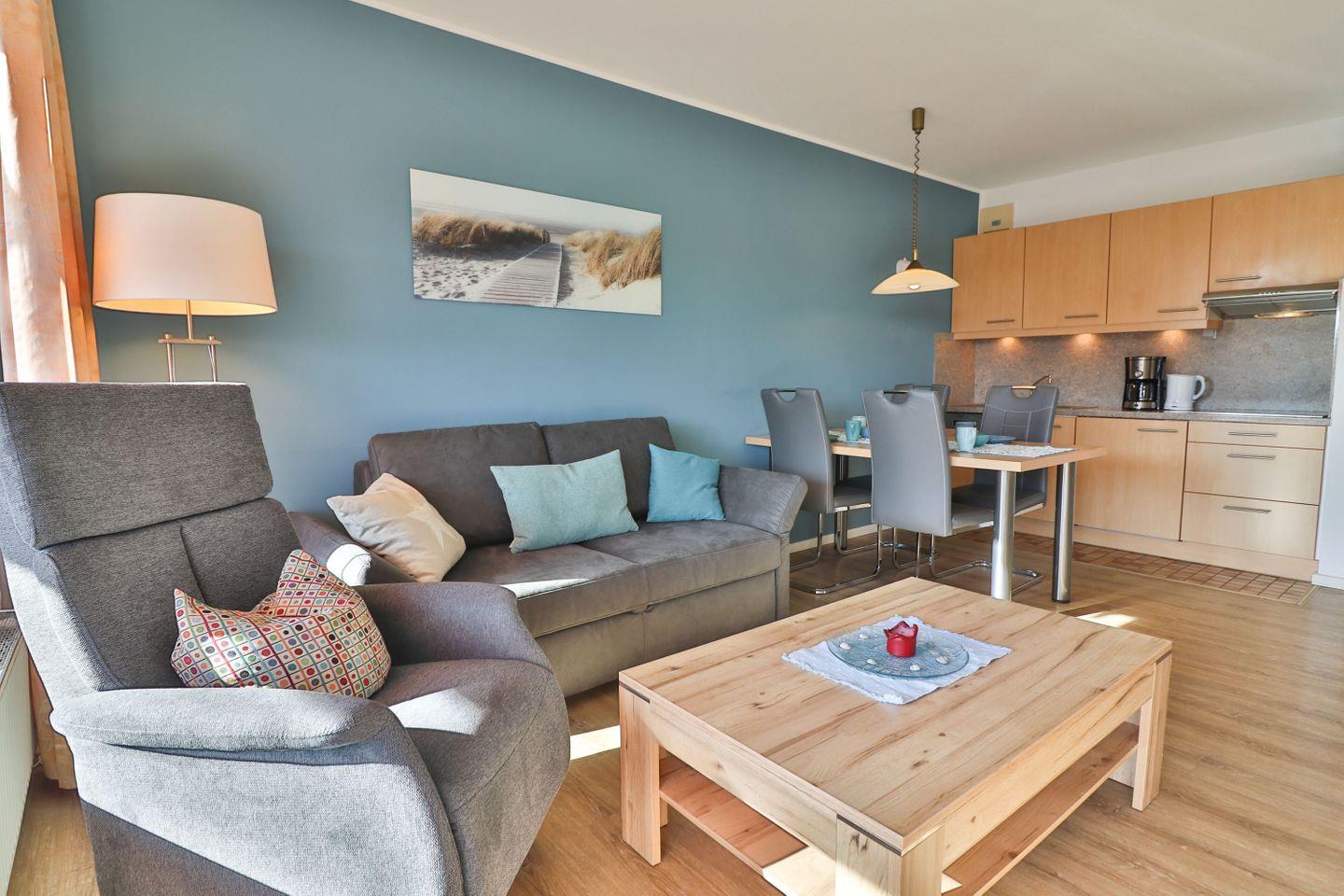 Der Wohn- und Essbereich ist freundlich und offen gestaltet und verfügt über ein Schlafsofa (Liegefläche ca. 140 x 195 cm) und einen bequemen Sessel, TV, sowie eine kleine Musikanlage mit Radio. Bücher und Spiele ergänzen die Ausstattung und sorgen auch an nordseetypischen Schietwetter-Tagen dafür, dass keine Langeweile aufkommt. Kostenloses WLAN sorgt auch während des Urlaubs für eine gute Vernetzung.