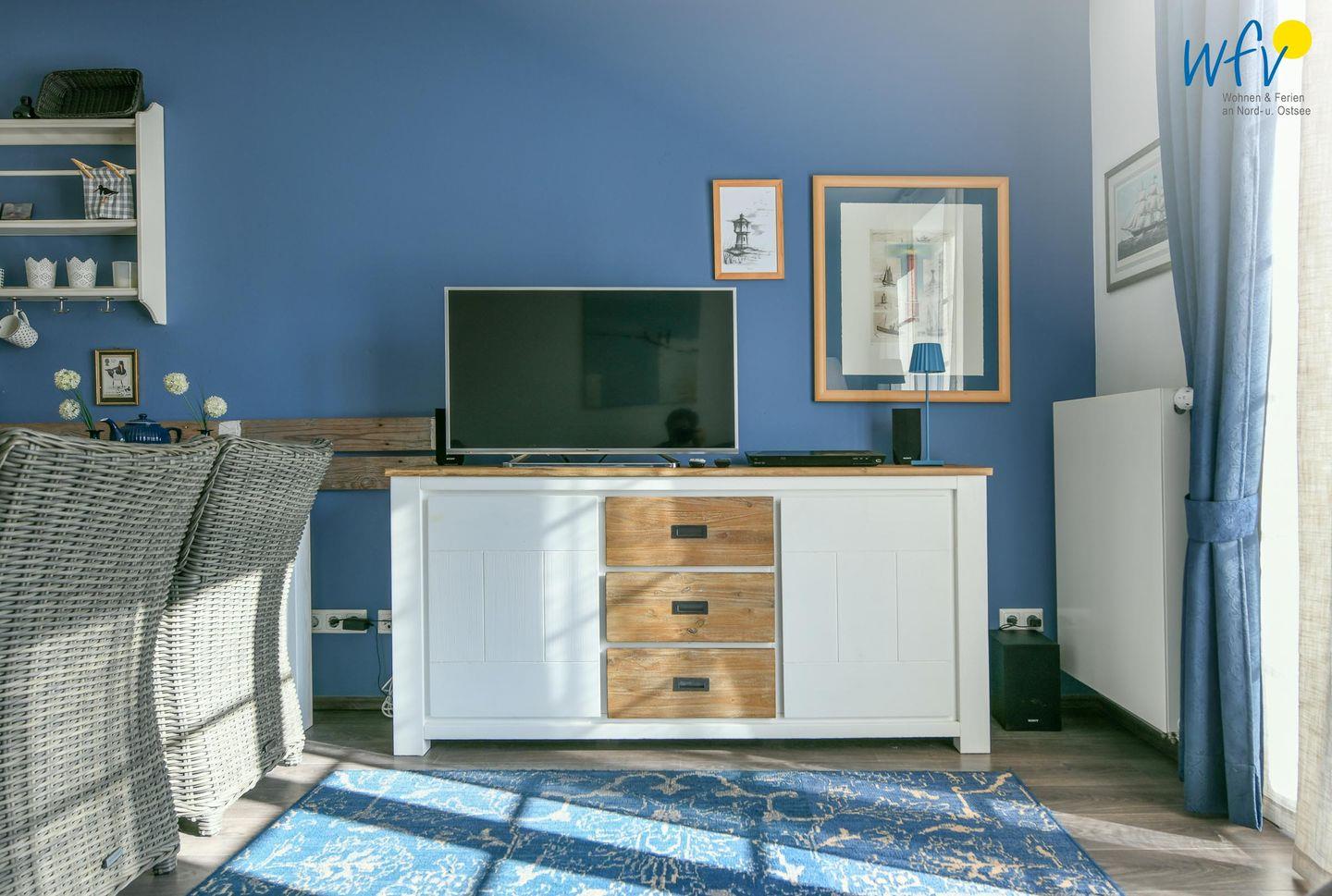 In dem hellen Wohnbereich empfängt Sie ein gemütliches Ensemble aus großem Esstisch und bequemer Sitzecke mit Couch und Sessel - ideal für gemeinsame Stunden. Ein modernes TV, freies WLAN sowie ein DVD-Player, eine HiFi-Anlage und einige Spiele sorgen für Unterhaltung.