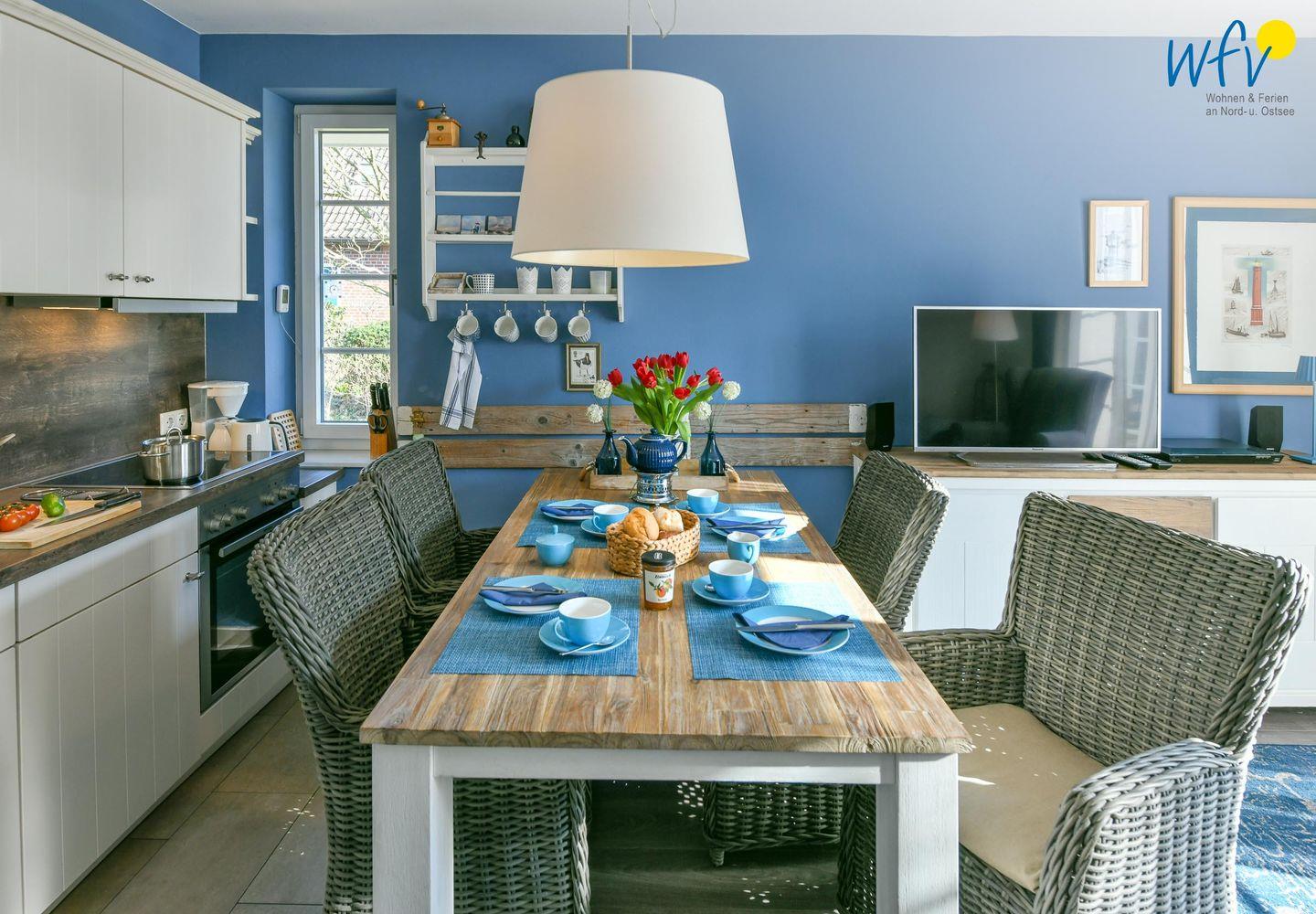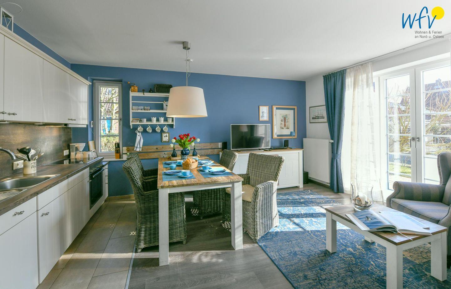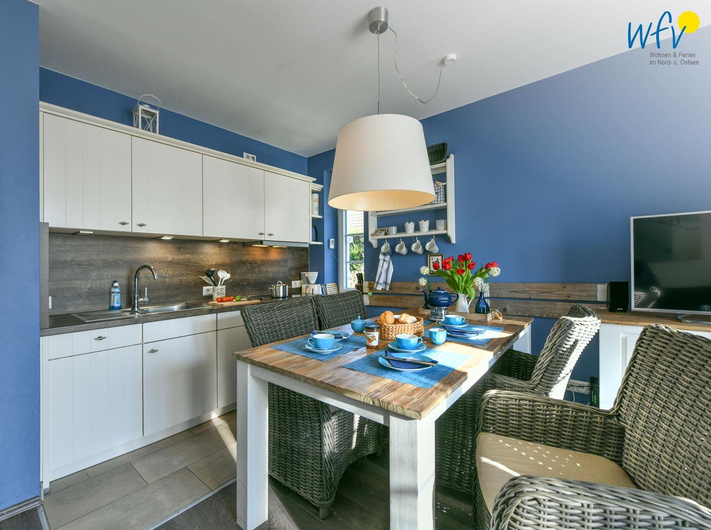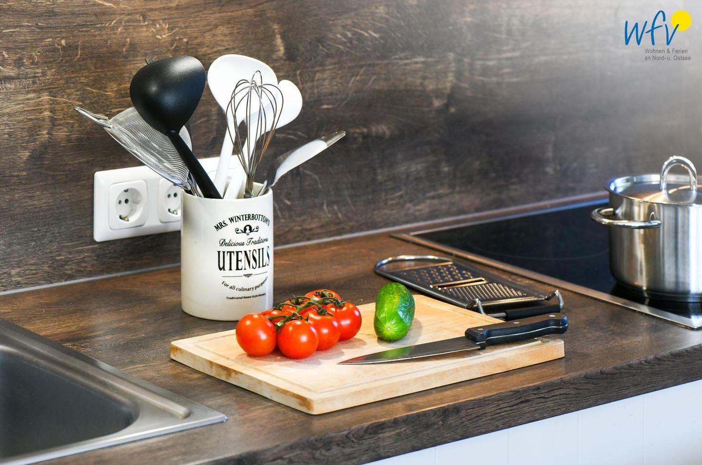 Snacks für den Ausflug oder leckere Gerichte lassen sich schnell und einfach in der modernen offenen Küche zubereiten. Sie ist u.a. mit Cerankochfeld, Backofen, Kühlschrank mit Gefrierfach und Spülmaschine sowie Kaffeemaschine, Wasserkocher, Toaster und Mixer ausgestattet. So können Sie Ihre Mahlzeiten flexibel planen und bequem am Esstisch genießen.