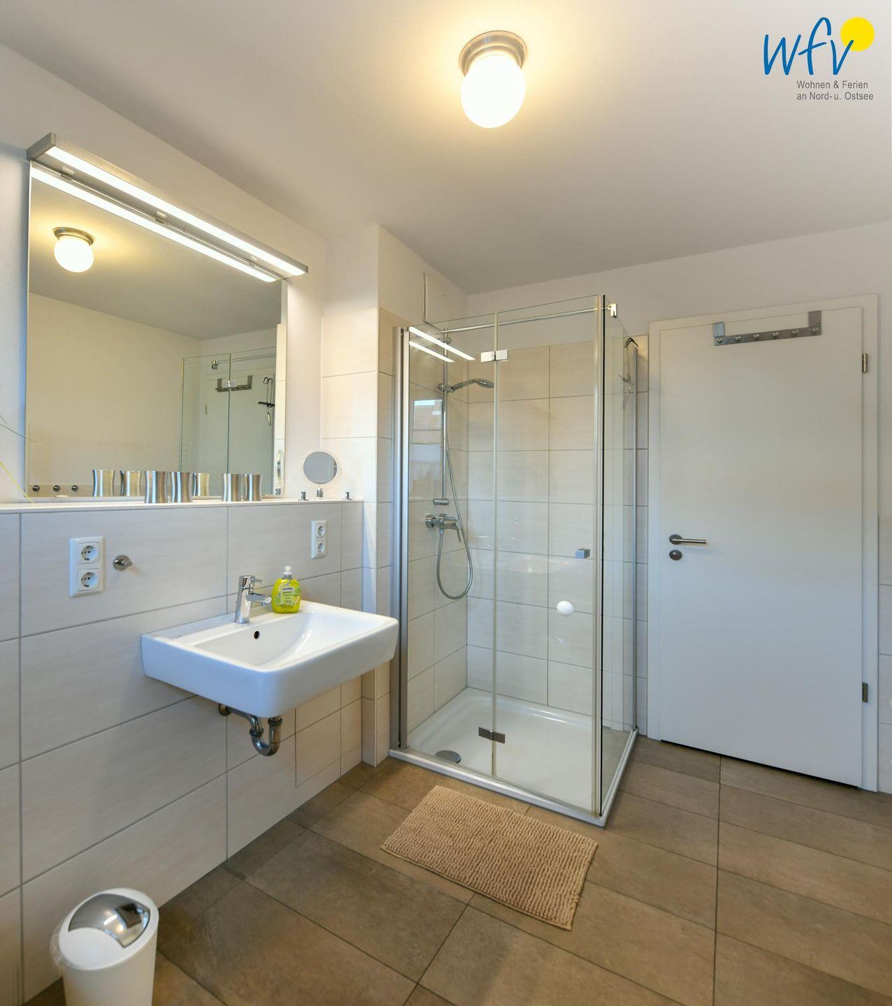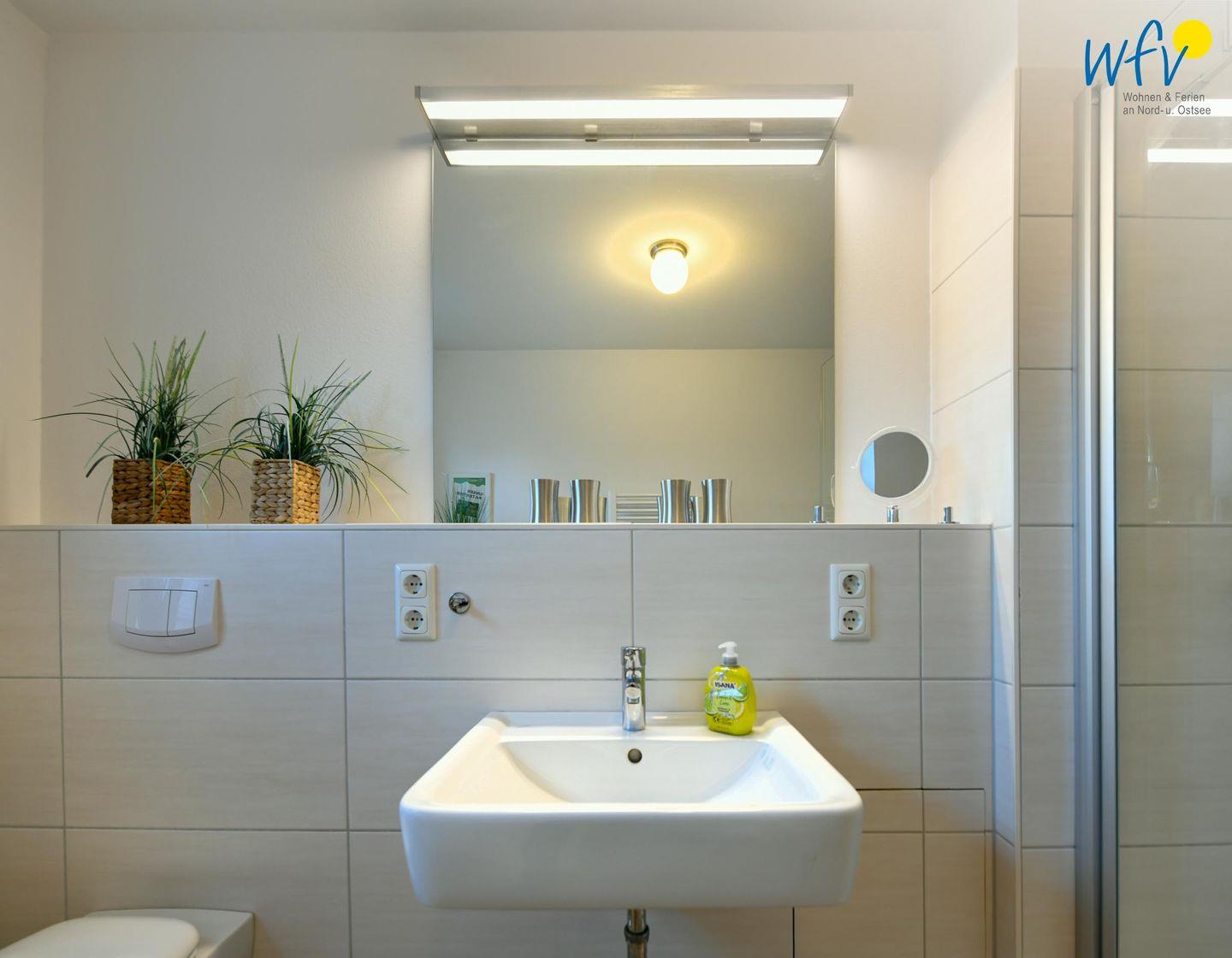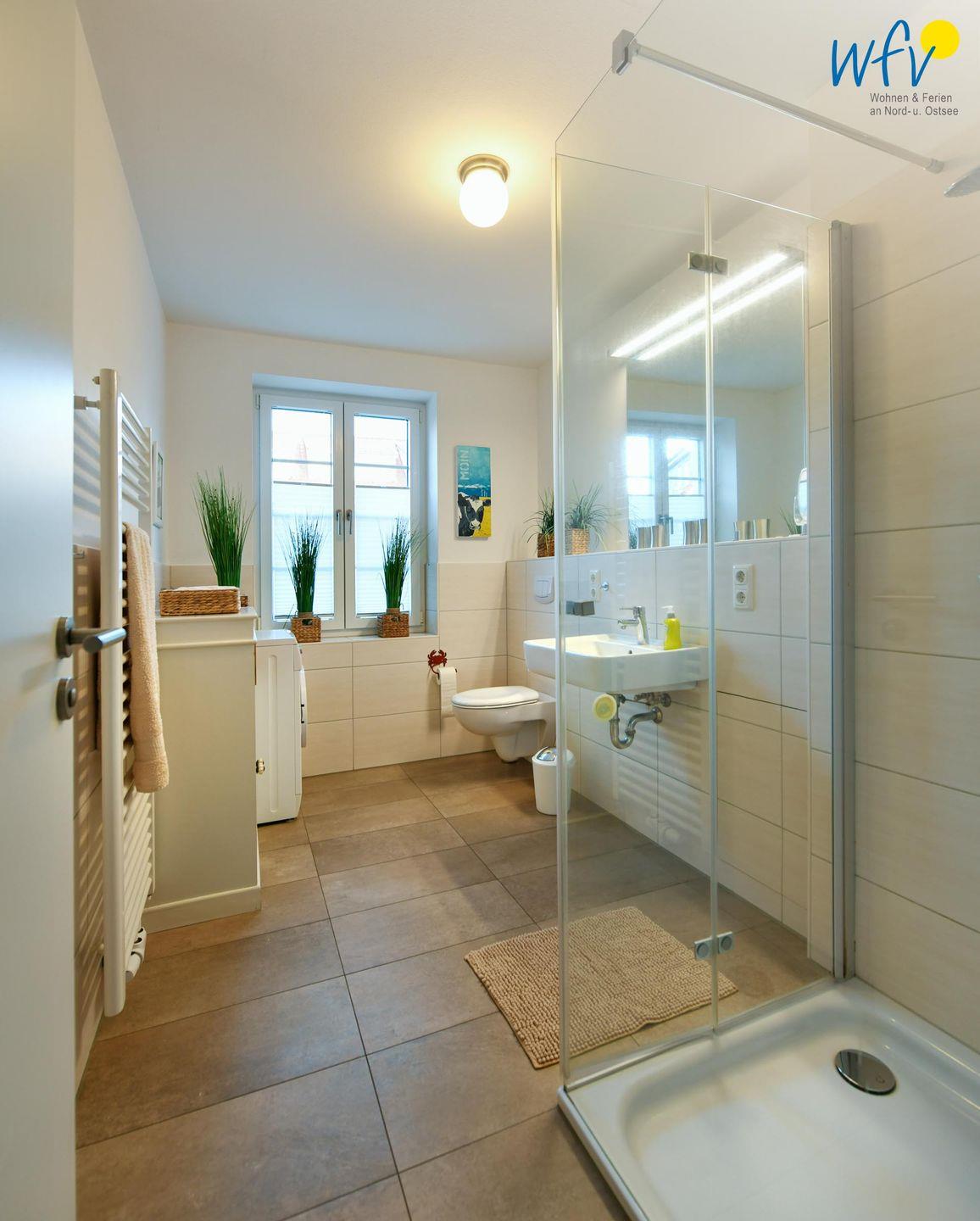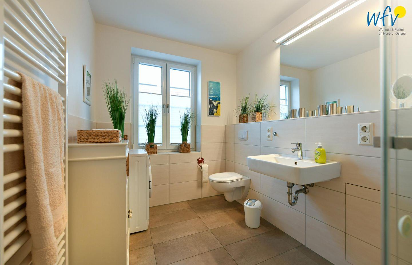Das großzügige moderne Tageslichtbad sorgt für weiteren Wohnkomfort. Eine bodengleiche Dusche, ein breiter Spiegel und ein Handtuchheizkörper sowie hübsche Badaccessoires machen auch diesen Raum zum Wohlfühlort. Ein Kosmetikspiegel und ein Föhn gehören zum festen Inventar.
