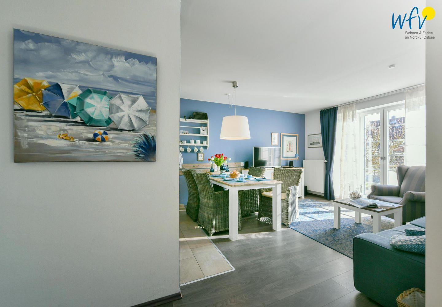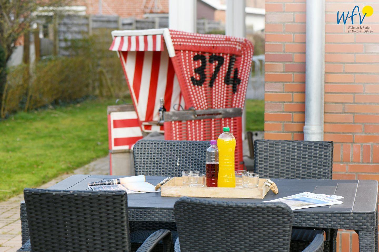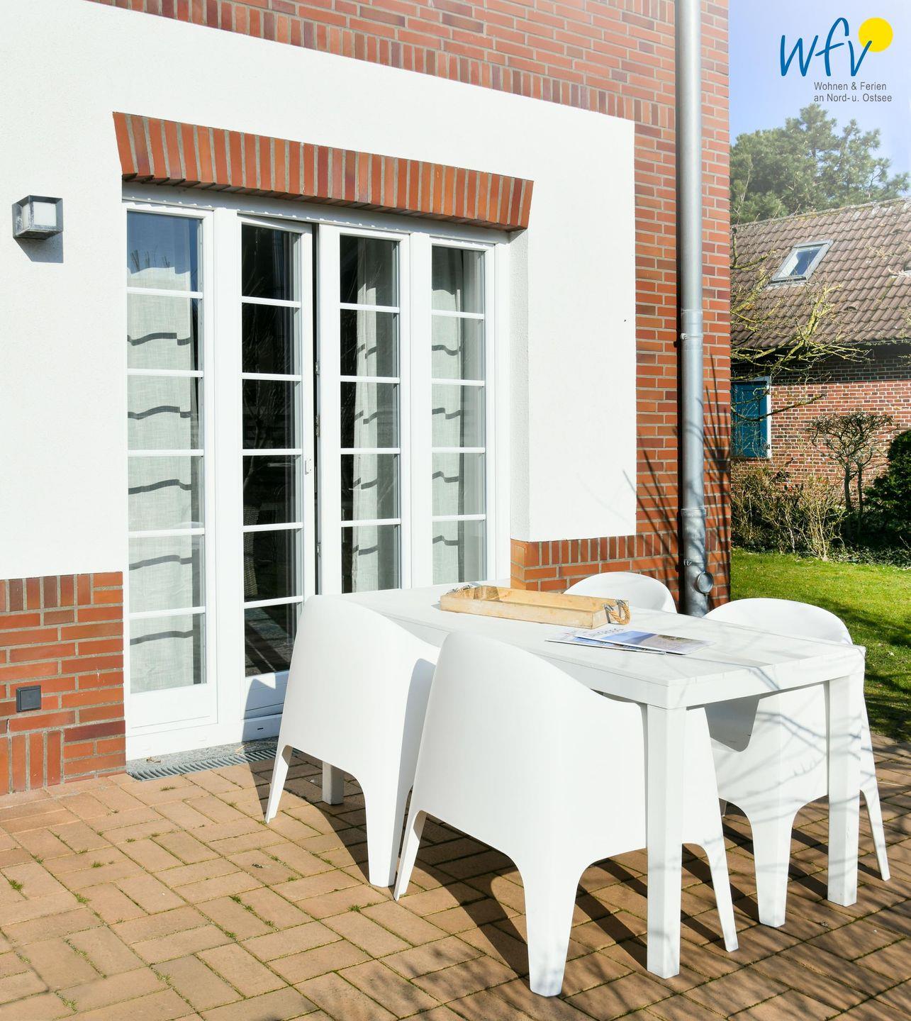 Die Parterrewohnung verfügt über insgesamt drei Zimmer, darunter ein Wohnraum und zwei separate Schlafzimmer, und eignet sich besonders für Paare und Familien. Wohltuende Nordseeluft buchen Sie bei uns inklusive: Drei sehr schöne wohnungseigene Terrassen in verschiedene Himmelsrichtungen laden zum ausgiebigen Entspannen ein. Mit Gartenmöbeln, Sonnenliegen und Strandkorb können Sie hier wunderbar beisammen sitzen, gemütlich essen, lesen und den Urlaubtag genießen. Teilweise sind die Terrassen überdacht, sodass auch ein Aufenthalt bei leicht regnerischem Wetter möglich ist. Ein angrenzender großer und exklusiver Gartenbereich von 190 m² bietet Platz zum Spielen und zum Verweilen im Freien.