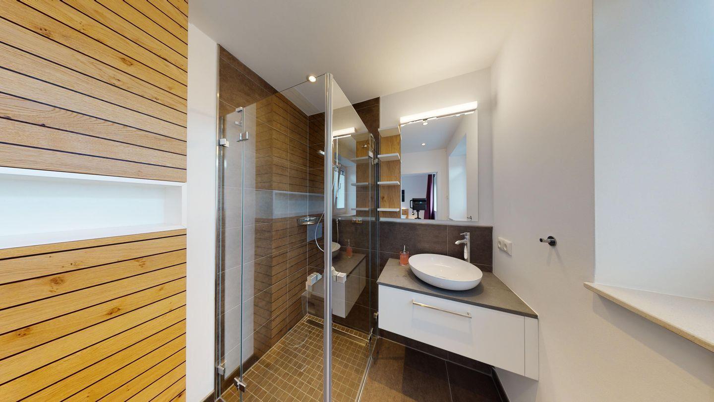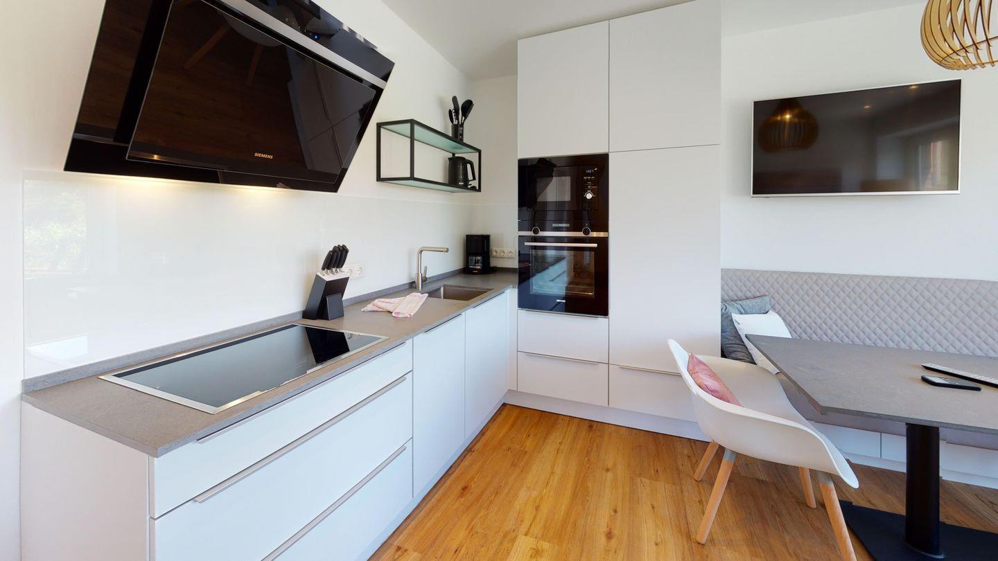 Die Wohnung verfügt über einen einladenden offenen Wohnbereich mit Terrassenzugang, Kaminofen und Essbereich. Die voll ausgestattete Einbauküche ist in den Wohnbereich integriert. In der Küche finden Sie Backofen, Mikrowelle, Kühlschrank, Herd, Spülmaschine, Kaffeemaschine, Wasserkocher, Mixer, Toaster und viele weitere Küchenutensilien. Es gibt zwei Schlafzimmer, die direkten Zugang zu jeweils einem modernen Badezimmer mit großer Dusche bieten. Ein zusätzliches Gäste-WC sowie ein Abstellraum ergänzen die Annehmlichkeiten.