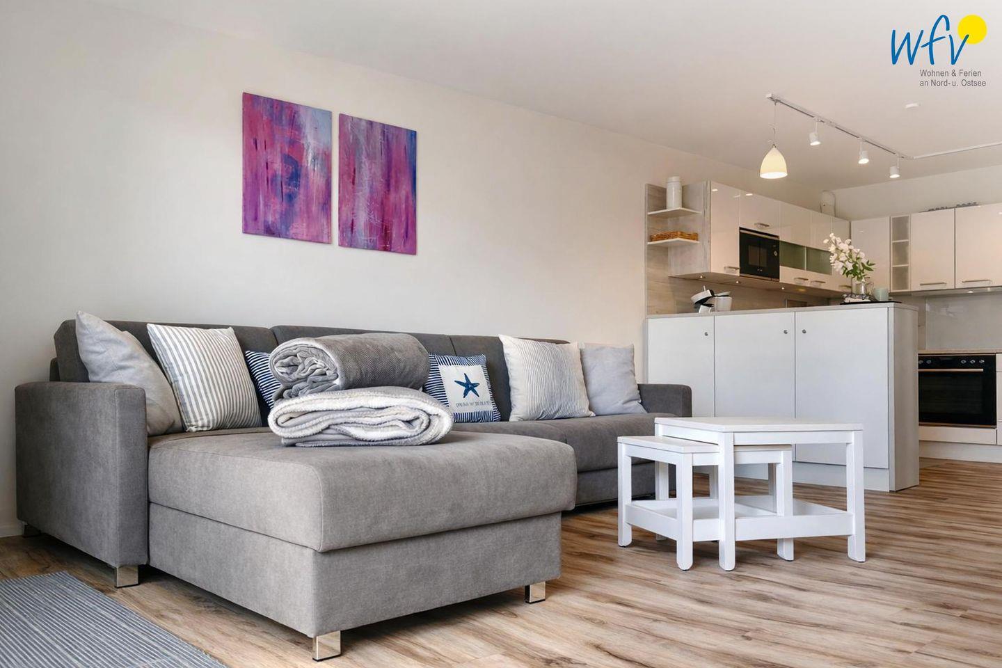 Die moderne Maisonettewohnung verfügt über 75 m² und erstreckt sich über zwei Etagen (EG und OG). In der unteren Etage empfängt Sie ein offener Wohnraum mit gemütlicher Couchecke und TV. Auch die offene moderne Küche sowie ein Essplatz bieten Platz für gemeinsame Stunden. Zur Ausstattung gehören hochwertige Küchengeräte - u.a. ein Ceranherd, ein Backofen, eine Mikrowelle und ein Geschirrspüler sowie drei Kaffeemaschinen (Filter/Kapsel/Pad) und ein Raclette.
