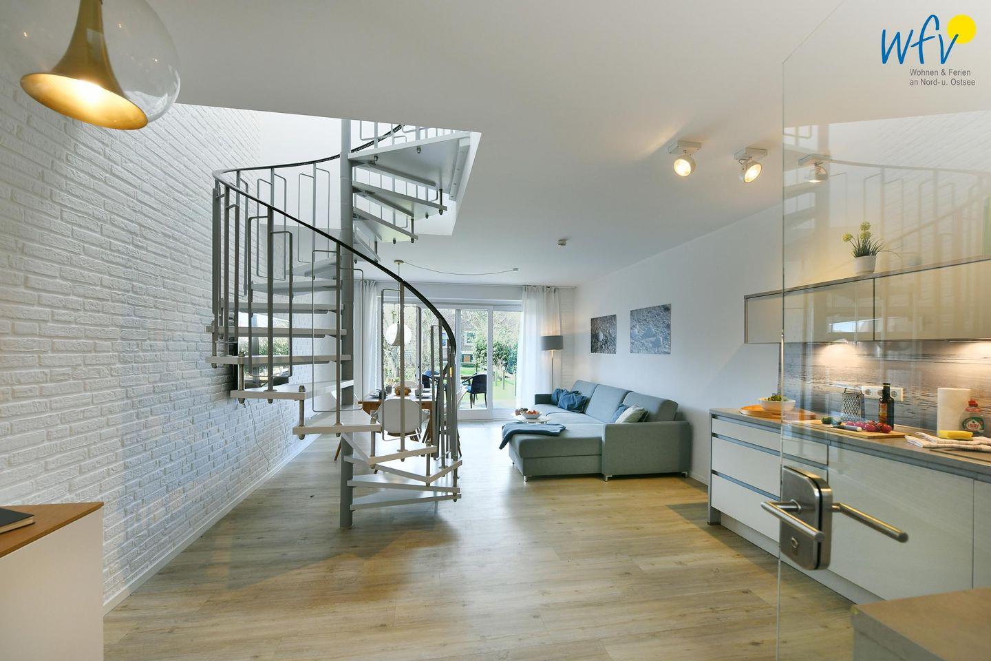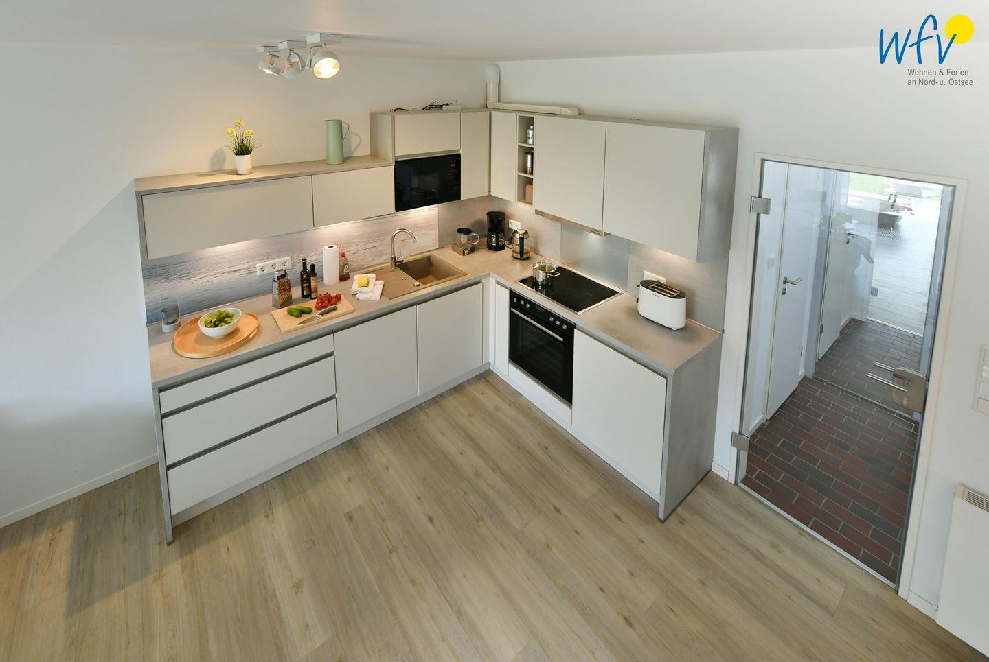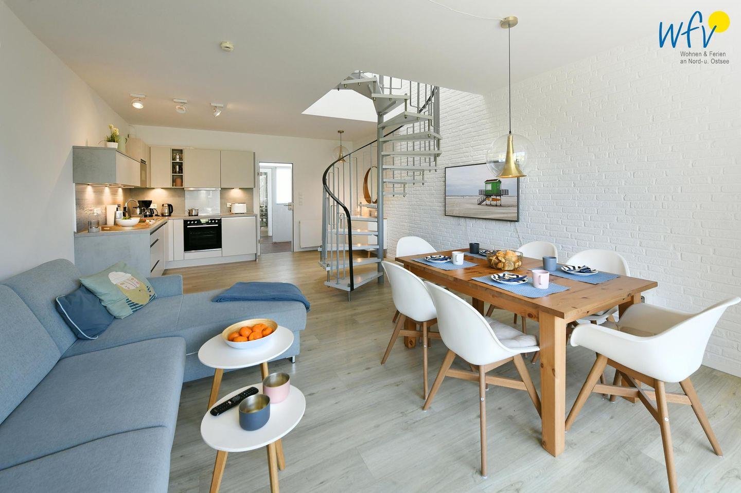 Die moderne Maisonettewohnung verfügt über 75 m² und erstreckt sich über zwei Etagen (EG und OG). In der unteren Etage empfängt Sie ein offener Wohnraum mit gemütlicher Couchecke und TV. Auch die offene moderne Küche sowie ein Essplatz mit Gartenblick tragen zum Wohlfühlambiente bei. Zur Ausstattung gehören hochwertige Küchengeräte - u.a. ein Induktionsherd, ein Backofen, eine Mikrowelle und ein Geschirrspüler. Kaffeegourmets können zwischen einer klassischen Filterkaffeemaschine und einem Espressokocher wählen. Nach einem Strandspaziergang macht ein Waffeleisen eine spontane Kaffeetafel ohne viel Aufwand möglich.