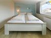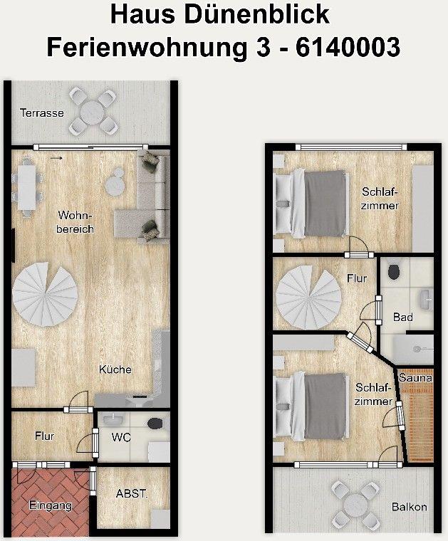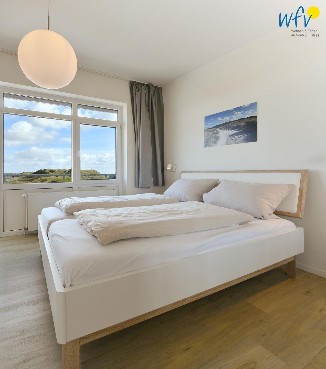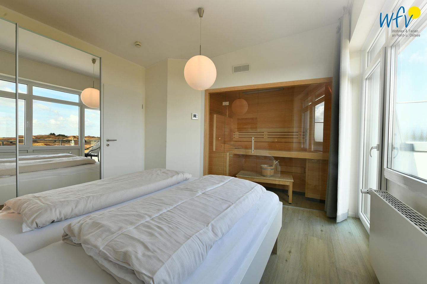 Eine Wendeltreppe führt zu den zwei separaten Schlafzimmern im Obergeschoss. Beide Zimmer sind mit einem komfortablen Doppelbett ausgestattet (180 x 200 cm bzw. 160 x 200 cm) und großzügigen Kleiderschränken für die Urlaubsgarderobe. Im nach Osten und zum Sonnenaufgang ausgerichteten Raum erwartet Sie bei breiter Fensterfront und verspiegeltem Schrank ein traumhafter Blick auf die Dünenlandschaft. Eine zusätzliche Besonderheit dieses Raumes ist die Sauna en suite, die mit offener Glasfront für ein weites Raumgefühl sorgt und Ihnen ebenso mit Blick in die Dünenlandschaft exklusiven Wellness-Komfort bietet. Das Highlight ist sicherlich der angrenzende windgeschützte und zur Dünenlandschaft ausgerichtete Balkon - sogar das Meer hören Sie hier bei Brandung rauschen! Perfekt, um den ersten Morgenkaffee oder ein ausgiebiges Frühstück zu genießen oder bei Dunkelheit den reichen Sternenhimmel zu beobachten.