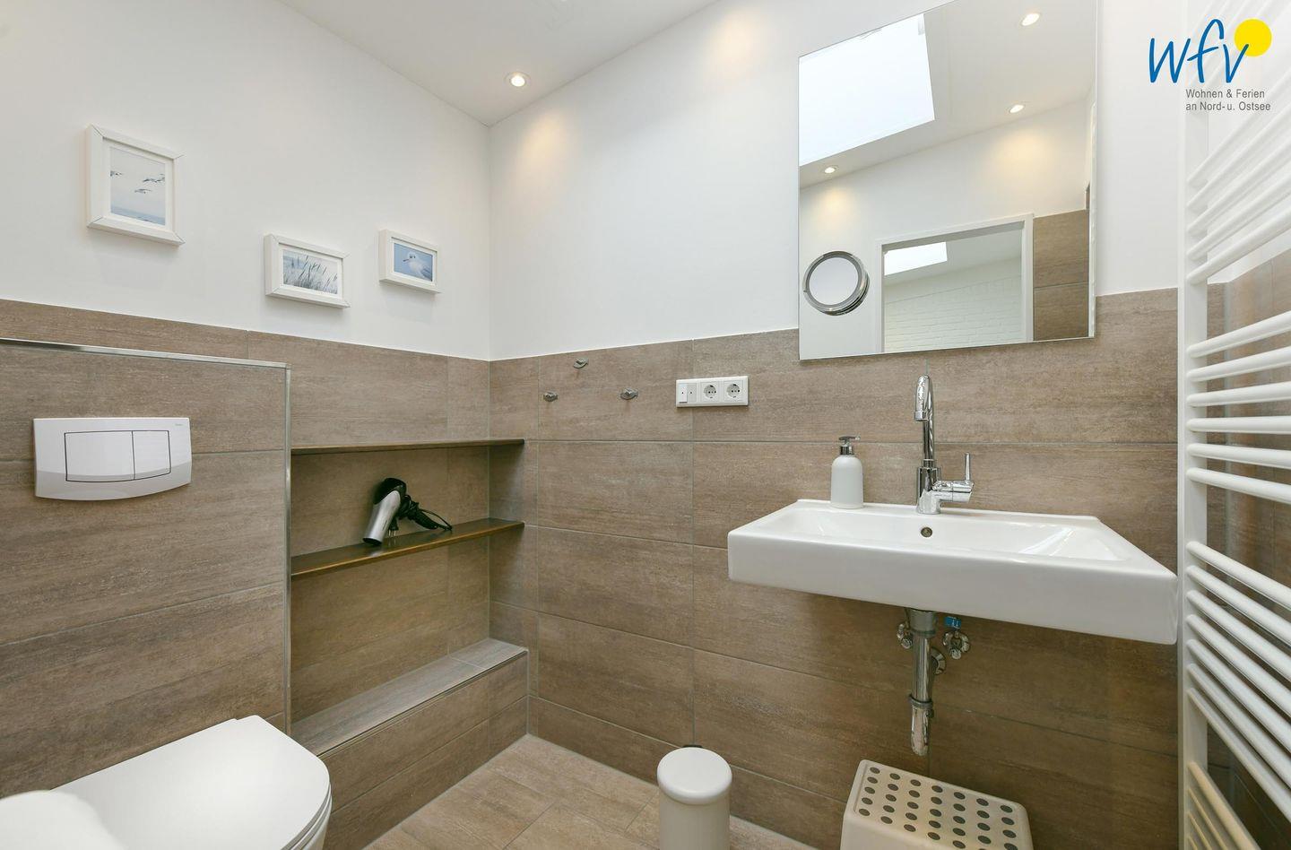 Das großzügige Tageslichtbad im OG mit geräumiger bodengleicher Dusche, WC, Waschtisch, Kosmetikspiegel und Föhn sowie die zusätzliche Gästetoilette im EG sorgen für weiteren Wohnkomfort und entspannen die täglichen Badezimmerroutinen.