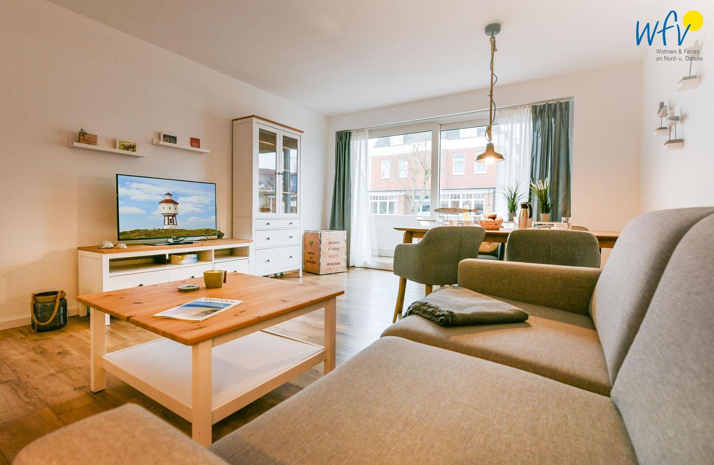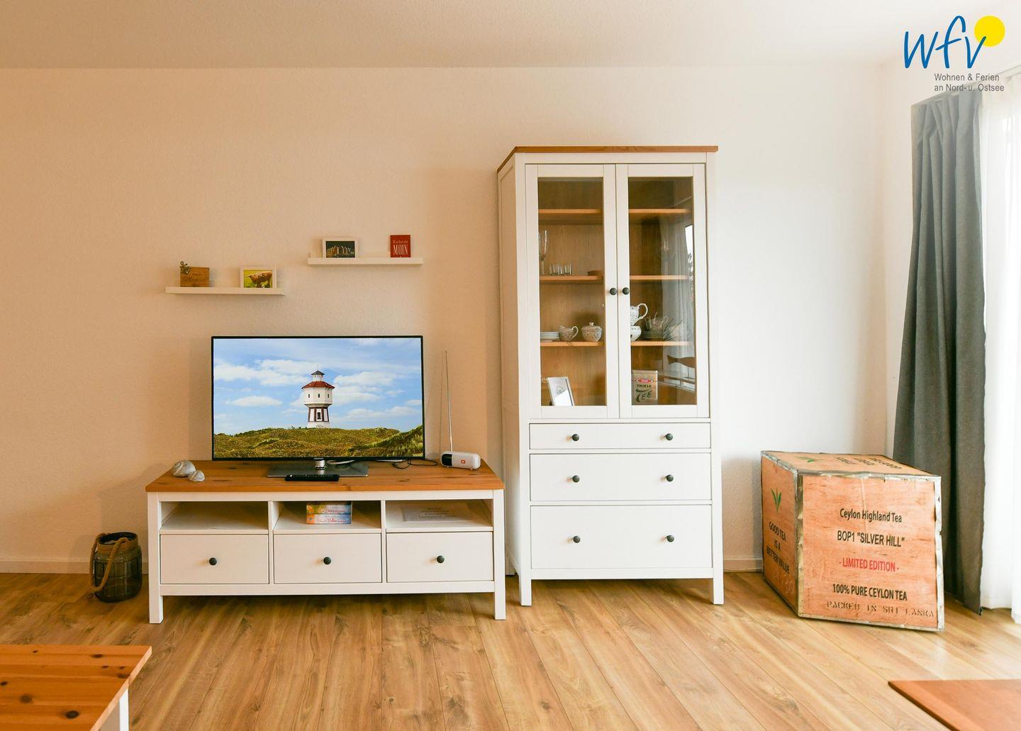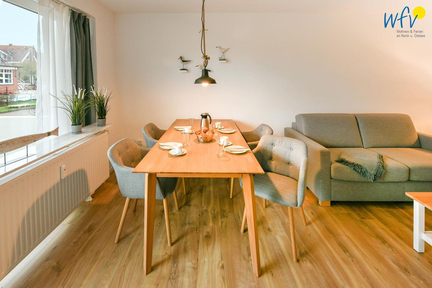 Es empfängt Sie ein geräumiger Flur mit Garderobe, der in ein helles Wohnzimmer mit Sofaecke und Essbereich führt. Hier können Sie nach dem Strandtag oder der Fahrradtour ruhige Stunden verbringen - fernsehen und lesen oder beisammen sitzen, klönen und gemeinsame Mahlzeiten genießen.