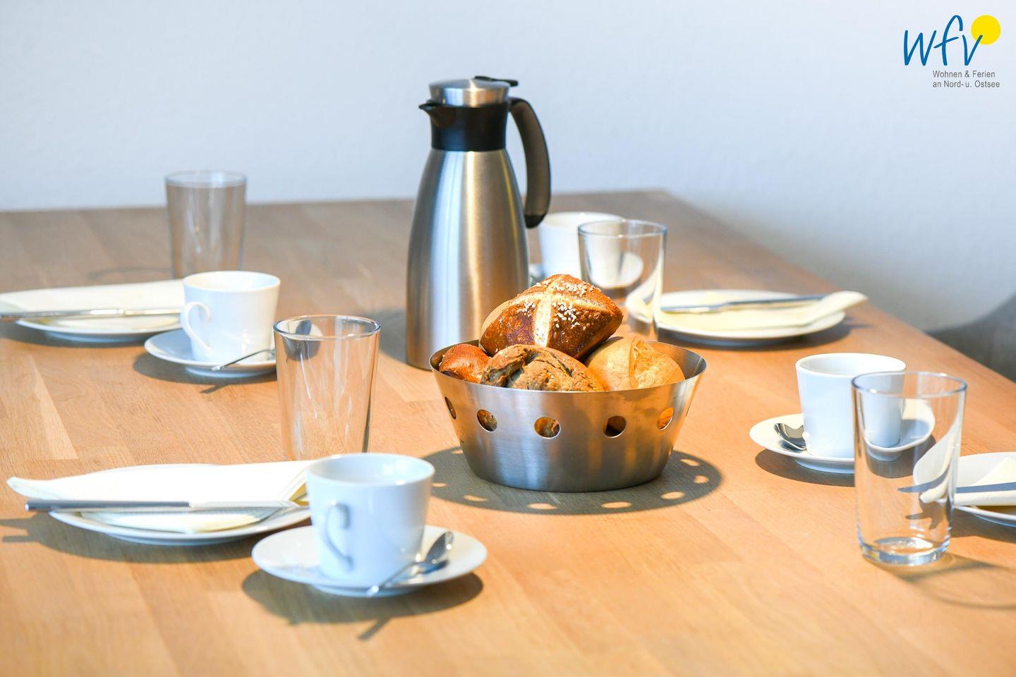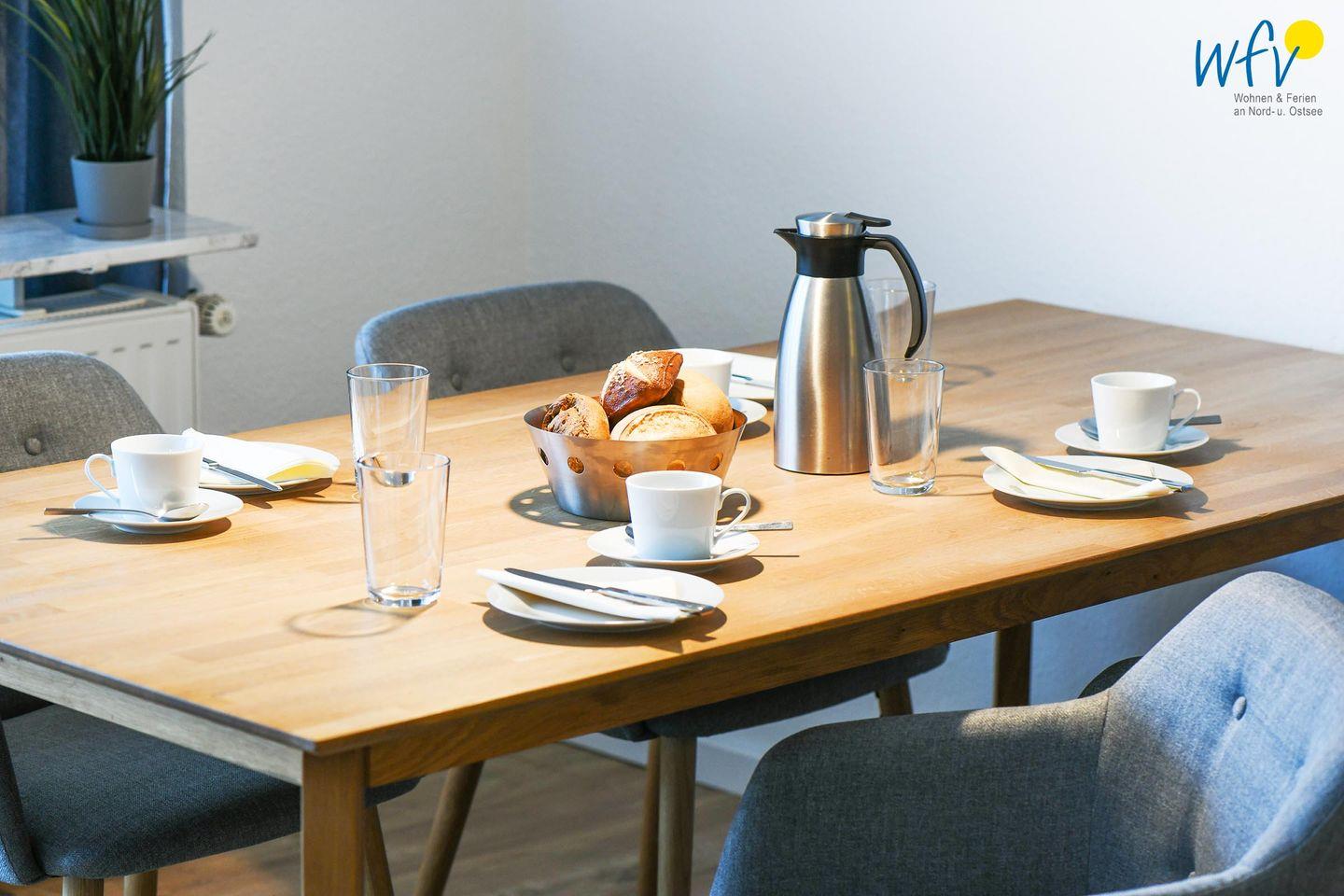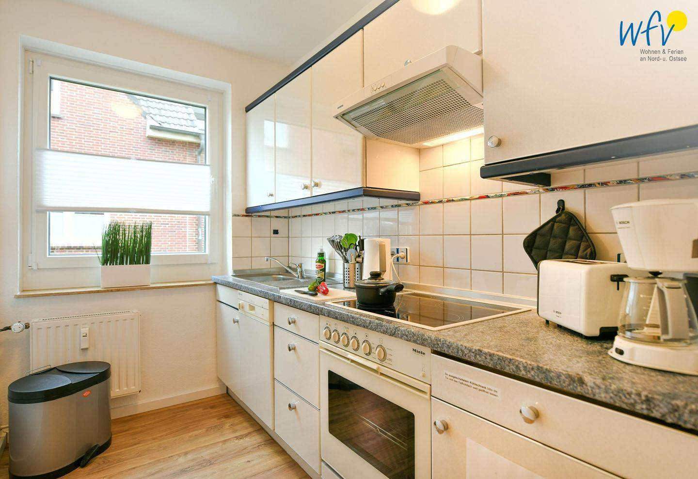 Es empfängt Sie ein geräumiger Flur mit Garderobe, der in ein helles Wohnzimmer mit Sofaecke und Essbereich führt. Hier können Sie nach dem Strandtag oder der Fahrradtour ruhige Stunden verbringen - fernsehen und lesen oder beisammen sitzen, klönen und gemeinsame Mahlzeiten genießen.