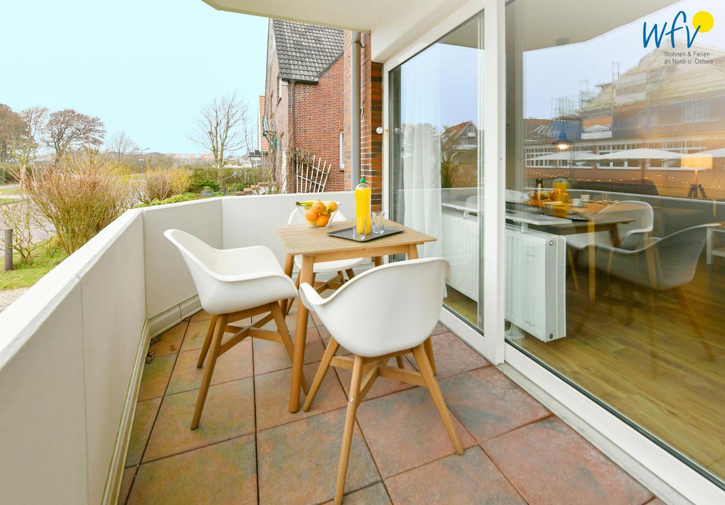 Oder Sie verbringen Ihre Auszeit auf dem hübsch möblierten Balkon der "Ferienwohnung Dörpnüst": Bequeme Gartenmöbel laden zum Wohlfühlen und Ausspannen im Freien ein. Ein schöner Blick auf das Geschehen der Barkhausenstraße und zum Kurviertel bietet ein herrliches Urlaubsgefühl!