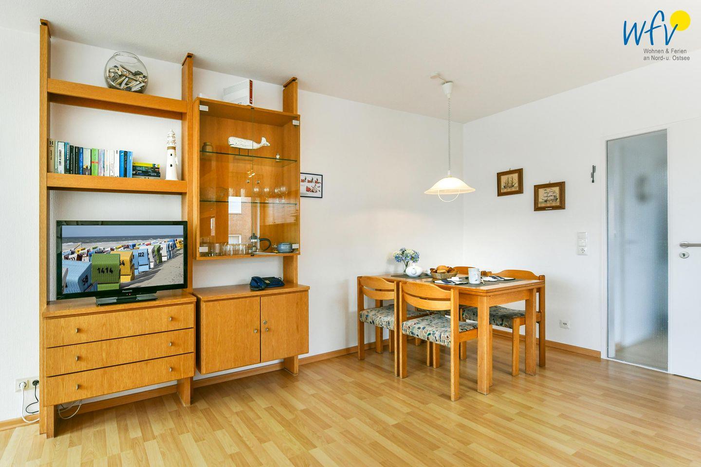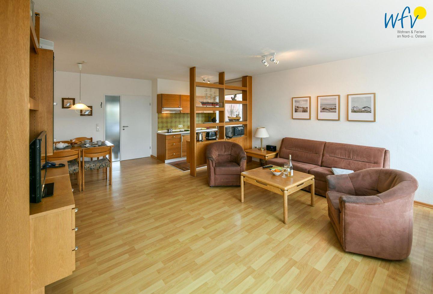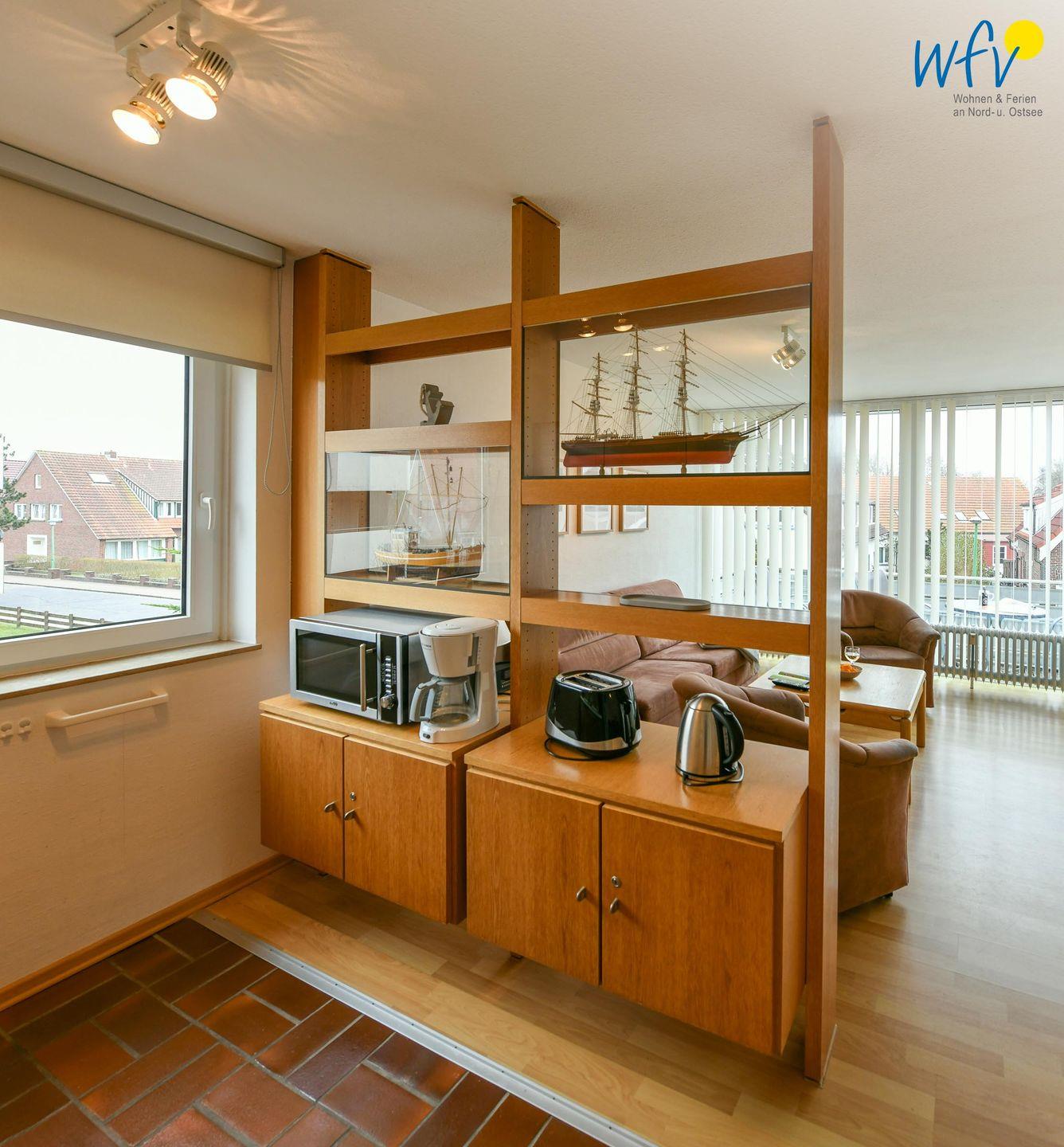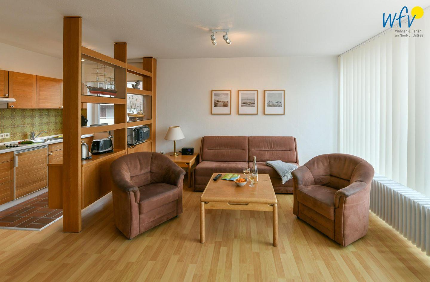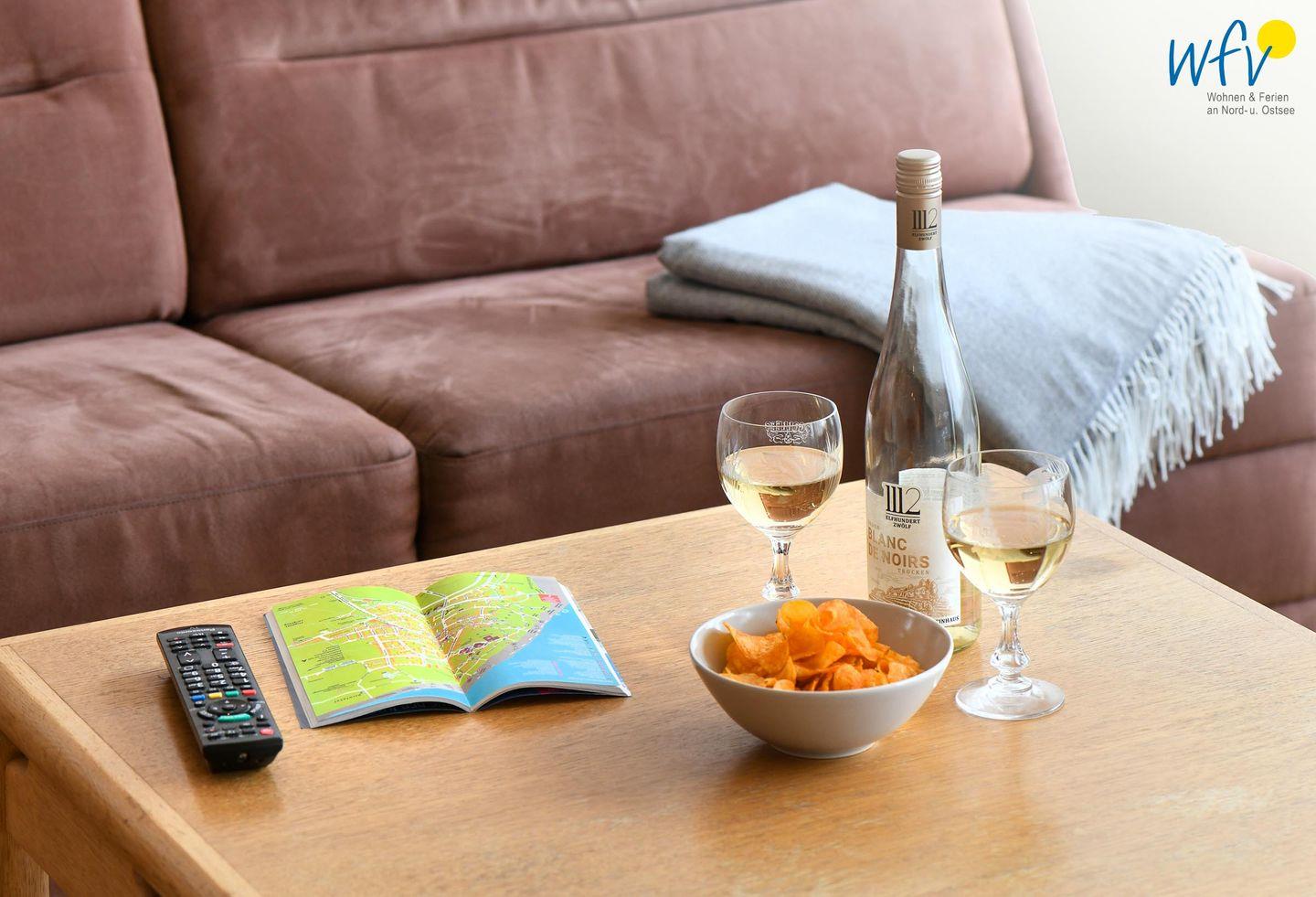 In dem hellen Wohnraum empfängt Sie eine sehr freundliche Atmosphäre. Große Fenster sorgen für viel Tageslicht, bequeme Möbel für Gemütlichkeit und maritime Accessoires für das entsprechende Nordseeflair. Die Couchecke mit TV bietet nach dem Strandtag oder der Inselwanderung Gelegenheit zum Fernsehen und Entspannen. Einige Gesellschaftsspiele sorgen für weitere Abwechslung. Zum Surfen vom Smartphone empfangen Sie freies WLAN; auch ein Telefon ist vorhanden.