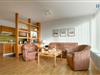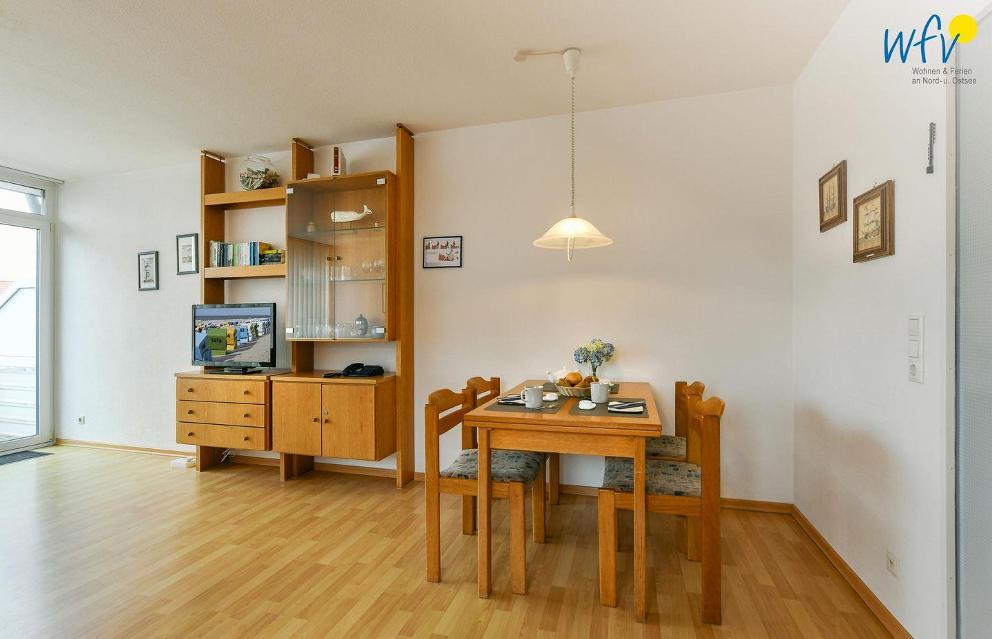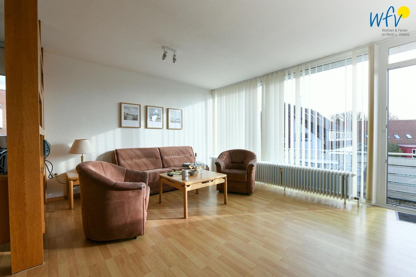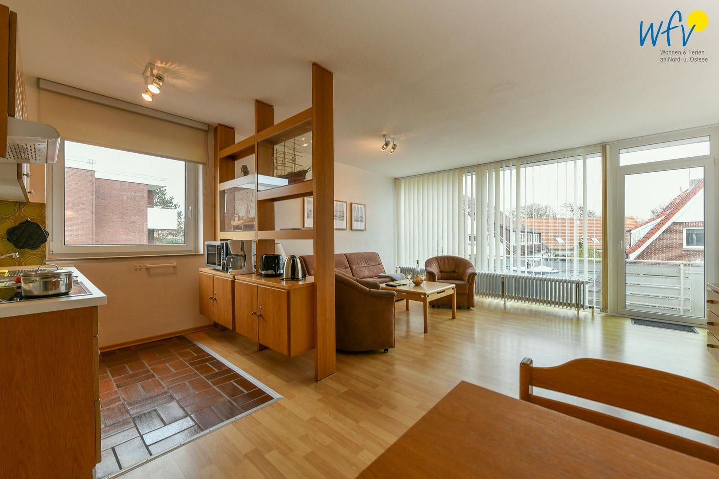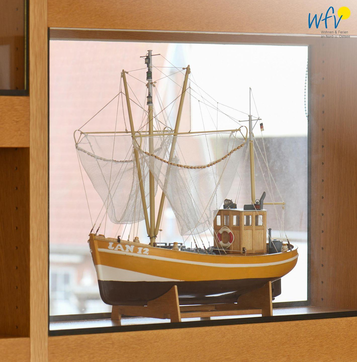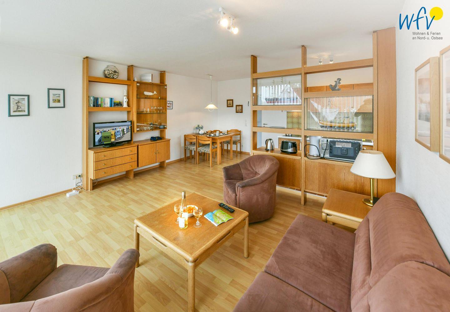 In dem hellen Wohnraum empfängt Sie eine sehr freundliche Atmosphäre. Große Fenster sorgen für viel Tageslicht, bequeme Möbel für Gemütlichkeit und maritime Accessoires für das entsprechende Nordseeflair. Die Couchecke mit TV bietet nach dem Strandtag oder der Inselwanderung Gelegenheit zum Fernsehen und Entspannen. Einige Gesellschaftsspiele sorgen für weitere Abwechslung. Zum Surfen vom Smartphone empfangen Sie freies WLAN; auch ein Telefon ist vorhanden.