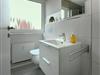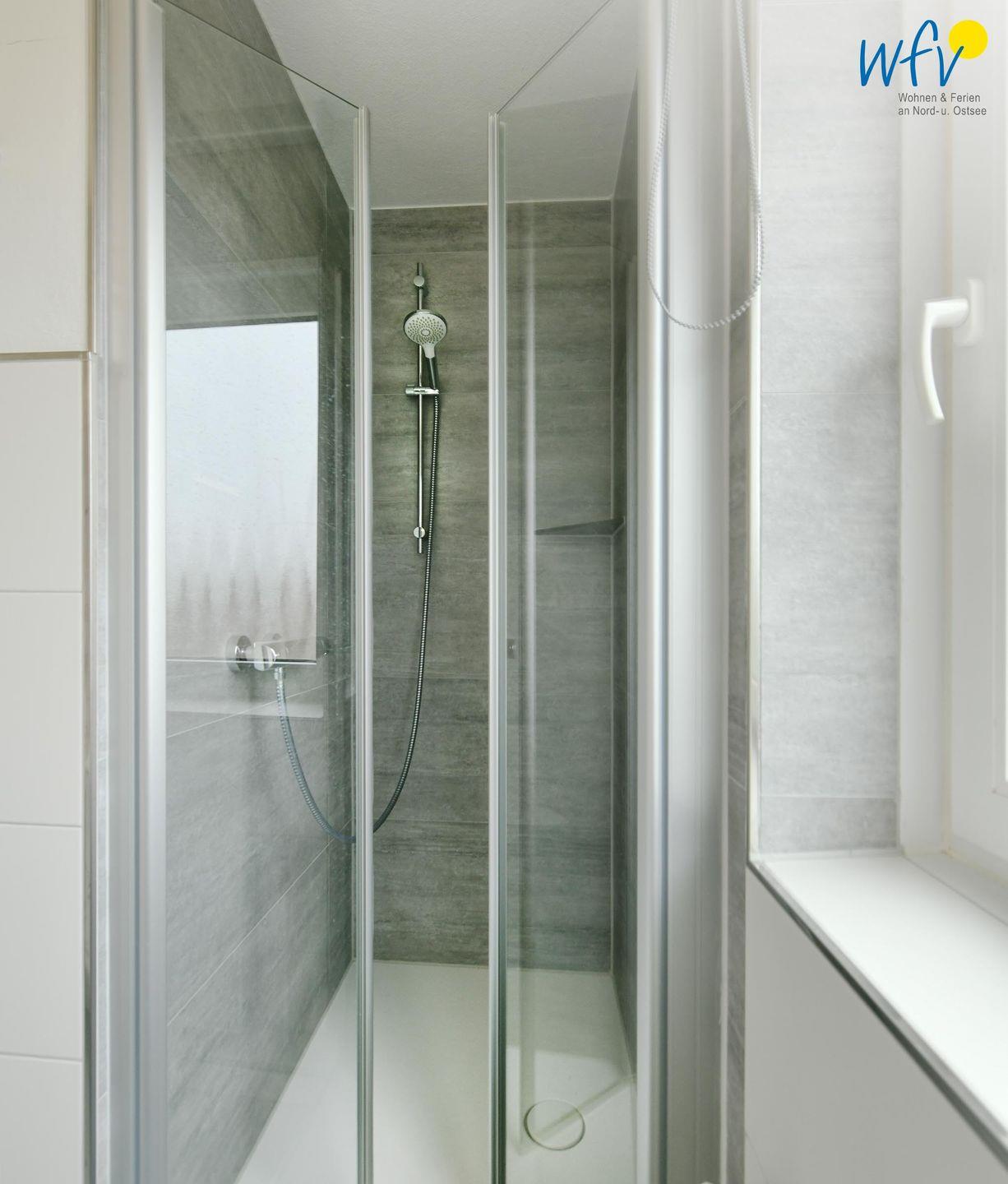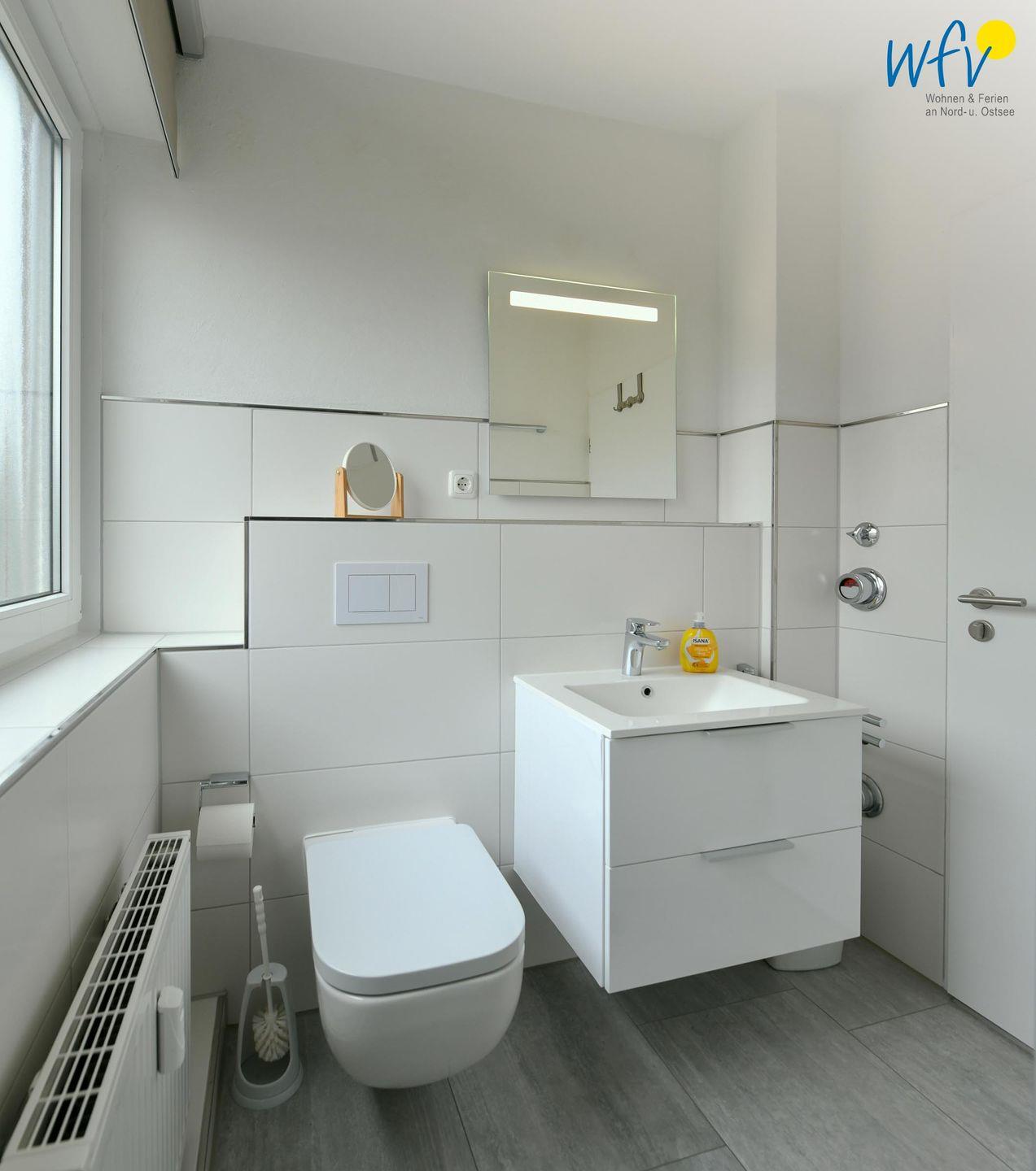 Das moderne Tageslichtbad mit bodengleicher Dusche, WC, Waschbecken mit Spiegel sowie Föhn und Kosmetikspiegel sorgt für weiteren Komfort.