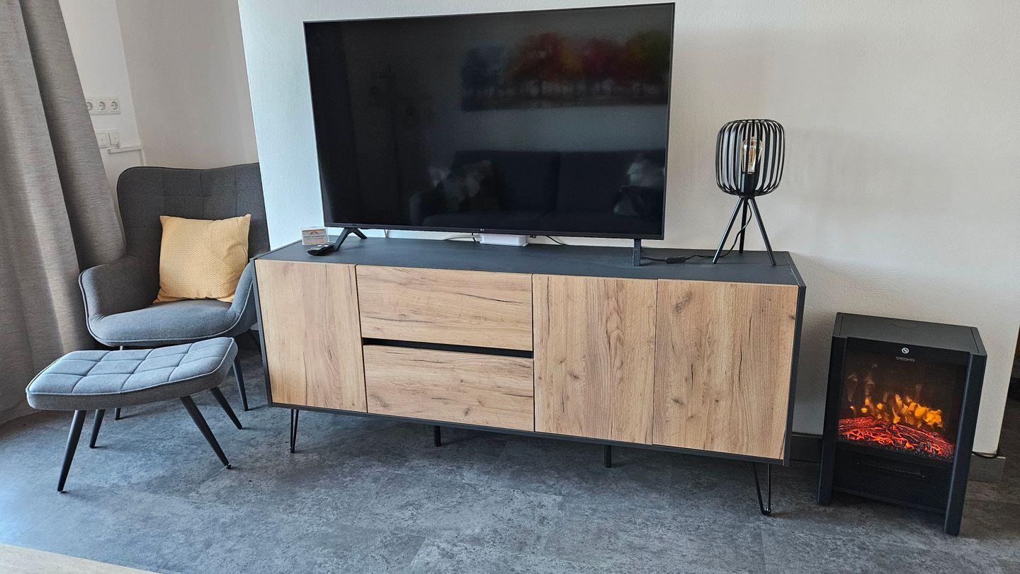 Die helle und geschmackvoll eingerichtete Ferienwohnung verfügt über ein separates Schlafzimmer (klein aber fein!) mit zwei komfortablen Einzelbetten und einem großzügigen Wohnbereich, der in einen offenen Küchenbereich übergeht. Die voll ausgestattete Küche lässt keine Wünsche offen – sie ist mit Cerankochfeld, Kühlschrank mit Gefrierfach, Spülmaschine, SenseoSwitch (Filter-Kaffeemaschine und Padmaschine in einem) und weiteren Küchenutensilien ausgestattet, sodass Sie ganz nach Belieben Ihr Lieblingsessen zubereiten können. Im Mini Backofen-Grill lassen sich Kleinigkeiten aufbacken. Der Essbereich lädt zu gemeinsamen Mahlzeiten ein, während das Sofa und der Lesesessel im Wohnzimmer für entspannte Stunden sorgen. Hier können Sie sich gemütlich zurücklehnen und einen Film auf dem digitalen Fernseher genießen oder durch das kostenfreie WLAN im Internet surfen. Ein elektrischer Kaminofen sorgt für Wohlfühlathmosphäre und wärmt zusätzlich. Das Sofa ist zu einem hochwertigem Bett ausklappbar (Liegefläche 140 x 200, max. 160 kg belastbar)), so dass insgesamt drei Gäste hier bequem urlauben können.