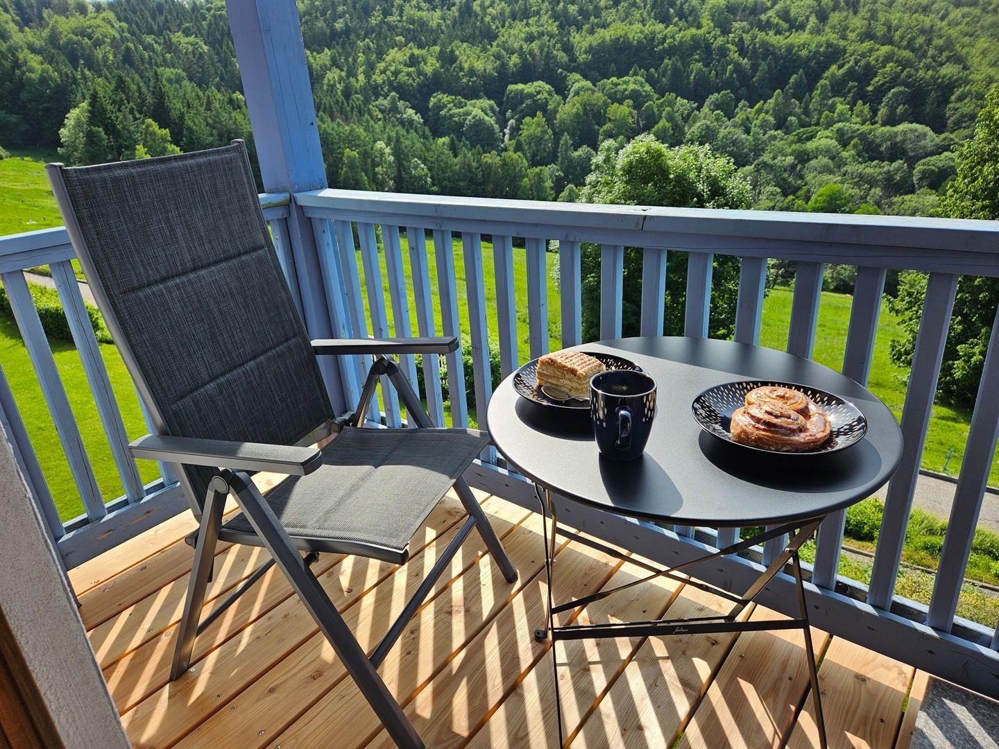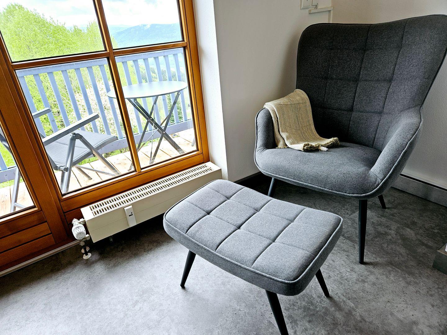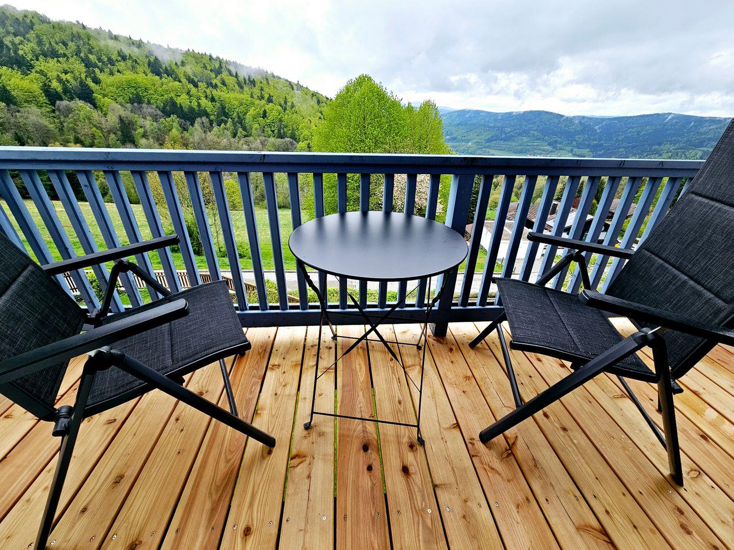 Ein echtes Highlight dieser Ferienwohnung ist der überdachte Balkon, der nicht nur einen atemberaubenden Blick auf die umliegende Berglandschaft bietet, sondern auch der ideale Ort ist, um den Tag bei einer Tasse Kaffee oder einem Glas Wein ausklingen zu lassen. Die ruhige Lage verspricht erholsame Stunden in der Natur, perfekt für Spaziergänge und entspannende Momente im Garten. Für die kleinen Gäste gibt es einen Spielplatz im Freien mit Schaukel sowie einen Grillplatz für die Großen für gesellige Abende mit der Familie oder Freunden.