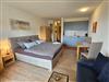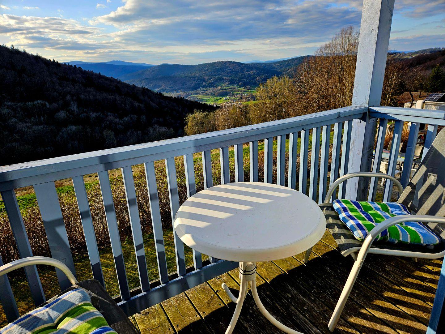 In einem gemütlichen Wohnzimmer, das mit Vinylboden ausgelegt ist, finden Sie eine Sofaecke sowie einen Fernseher, um entspannte Abende zu verbringen. Die Couch bi8etet eine zusätzliche Schlafmöglichkeit für ein Kind. Der Balkon der Wohnung ist überdacht und lädt dazu ein, das zarte Plätschern von Naturgeräuschen bei einem guten Buch oder einer Tasse Kaffee zu genießen, während Sie den herrlichen Blick auf die umliegenden Berge und die idyllische Landschaft schweifen lassen.