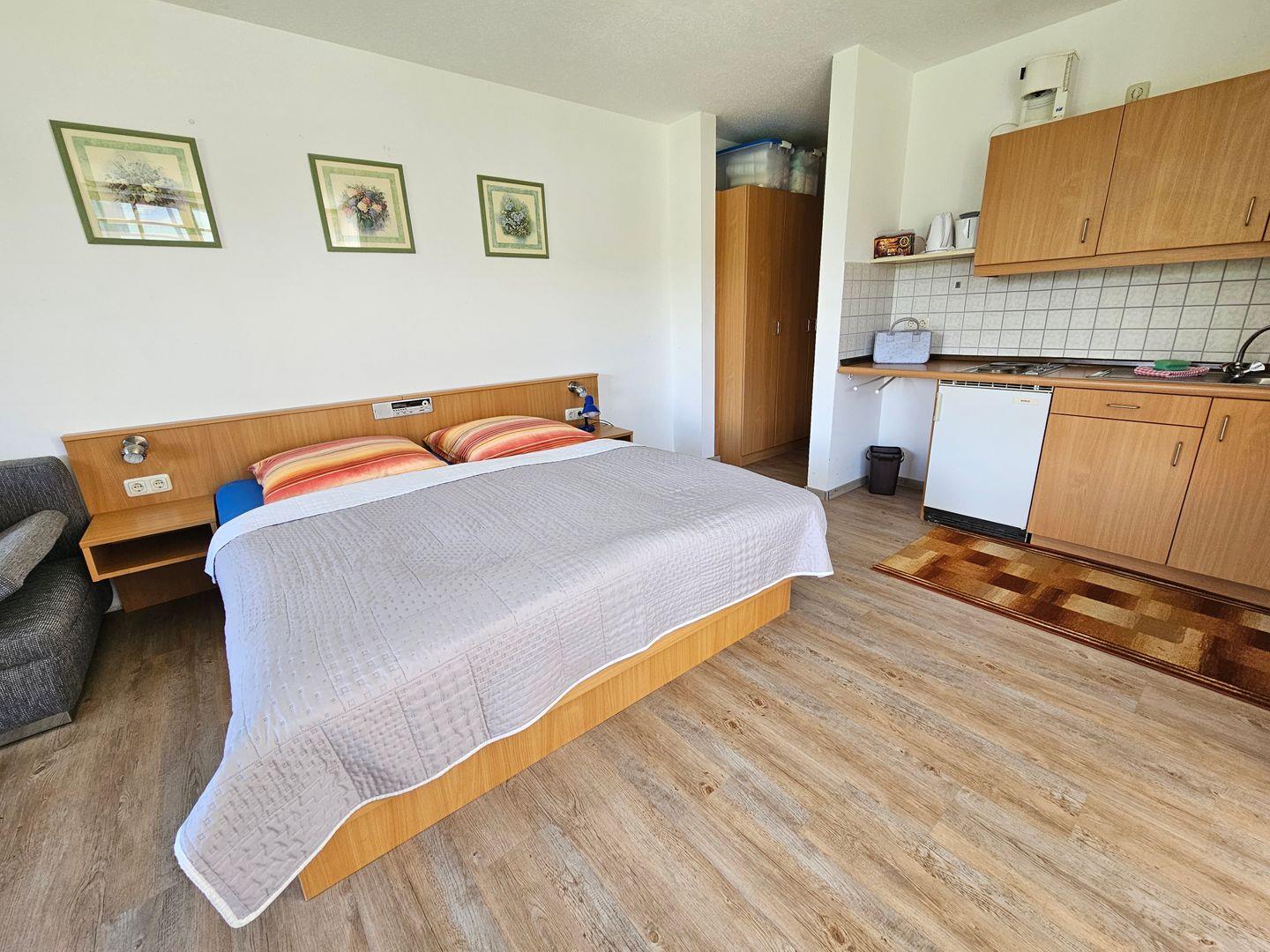Die Ferienwohnung bietet auf 33 m² Platz für bis zu drei Personen und ist als Nichtraucherunterkunft ausgewiesen. Die Ausstattung ist einfach und zweckmässig. Mit einem Wohnzimmer mit Sofaecke und Doppelbett. Der offen zum Wohnzimmer gestaltete Küchenbereich bietet Ihnen Kaffeemaschine, Wasserkocher, Kühlschrank sowie Geschirr und Besteck. Ein Esstisch rundet den Essbereich ab und bietet Gelegenheit für gemeinsame Mahlzeiten. Das Wohnzimmer verfügt zudem über einen Sessel und einen Fernseher mit Satellitenanschluss. WLAN ist in der gesamten Wohnung verfügbar und ermöglicht den Zugang zum Internet.