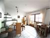 - Wohn-/Esszimmer mit einer gemütlichen Couch-Ecke mit Stereoanlage, LCD-TV, DVD Player und Leselampe. In der Essecke steht ein zentral beheizter Kachelofen mit gemütlicher Holzofenbank, ein Tisch und zwei Stühle.