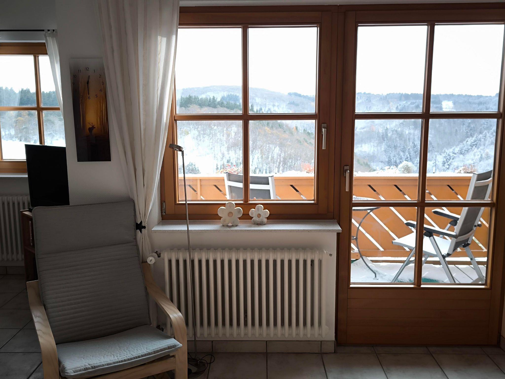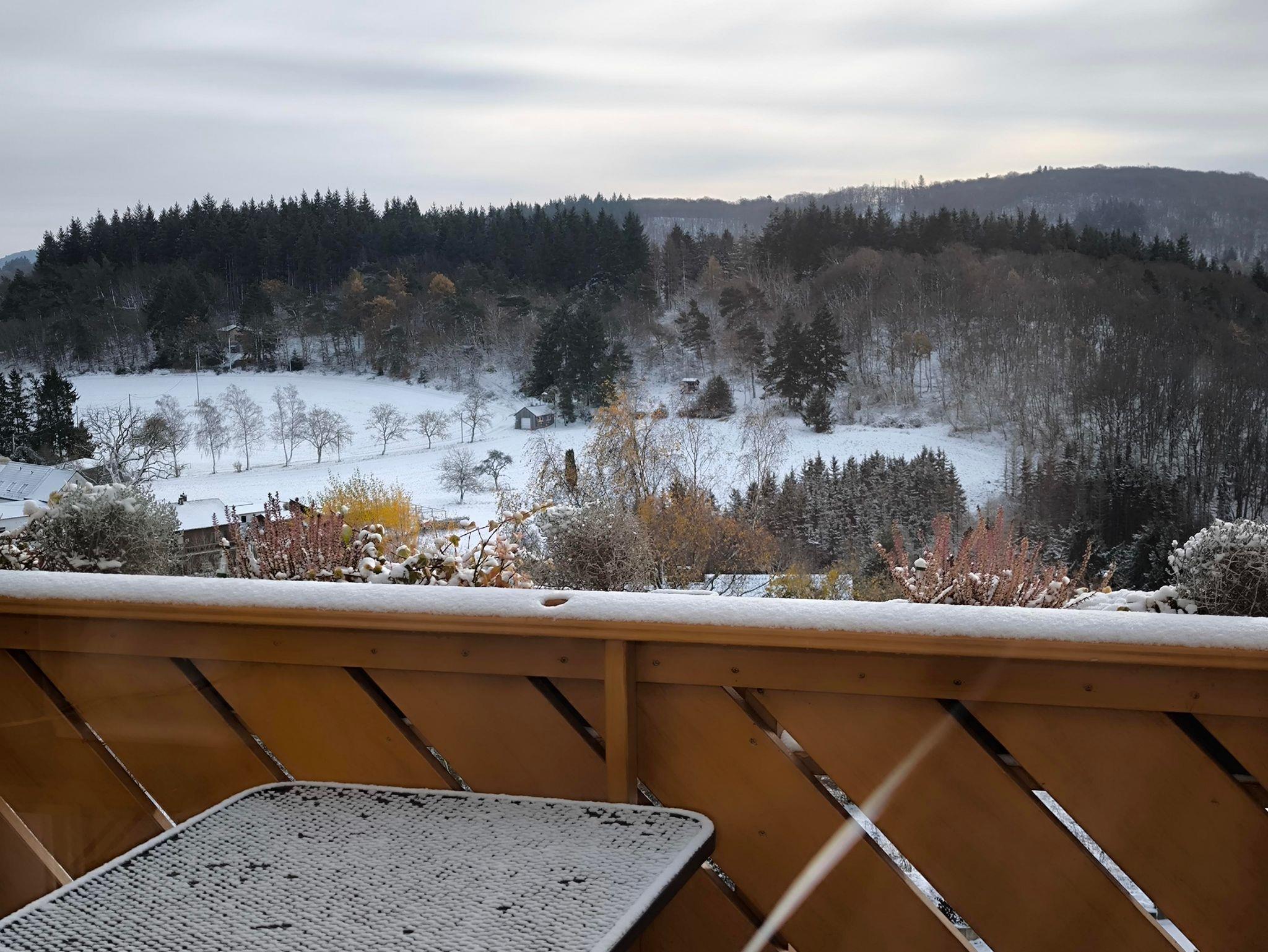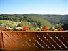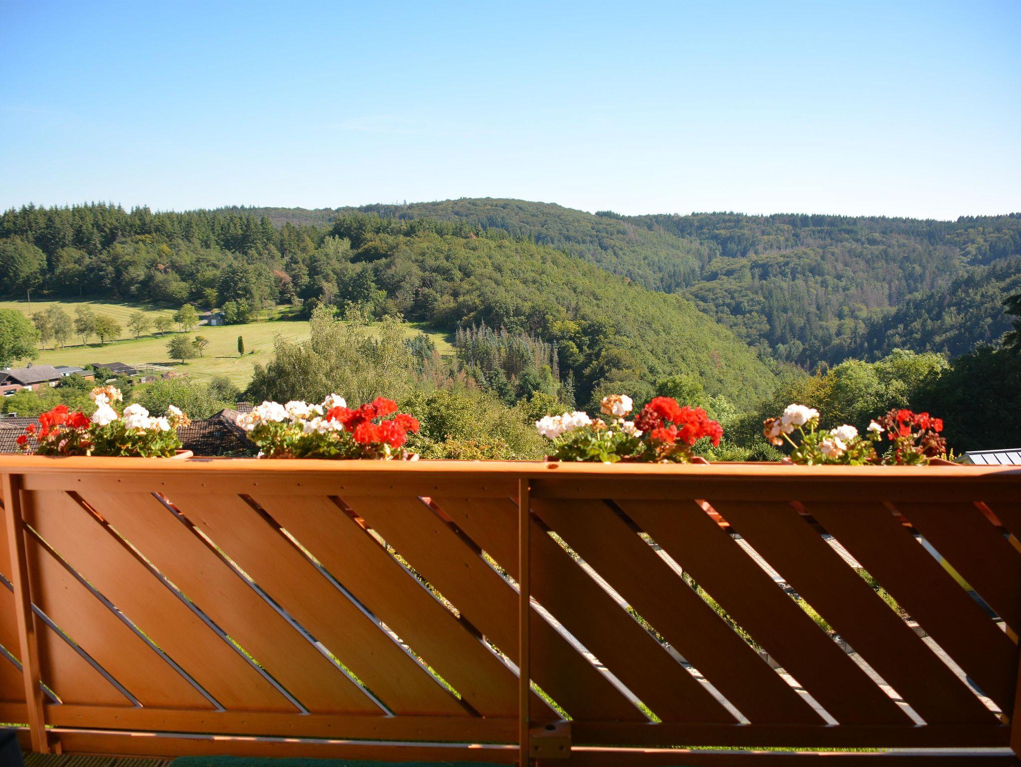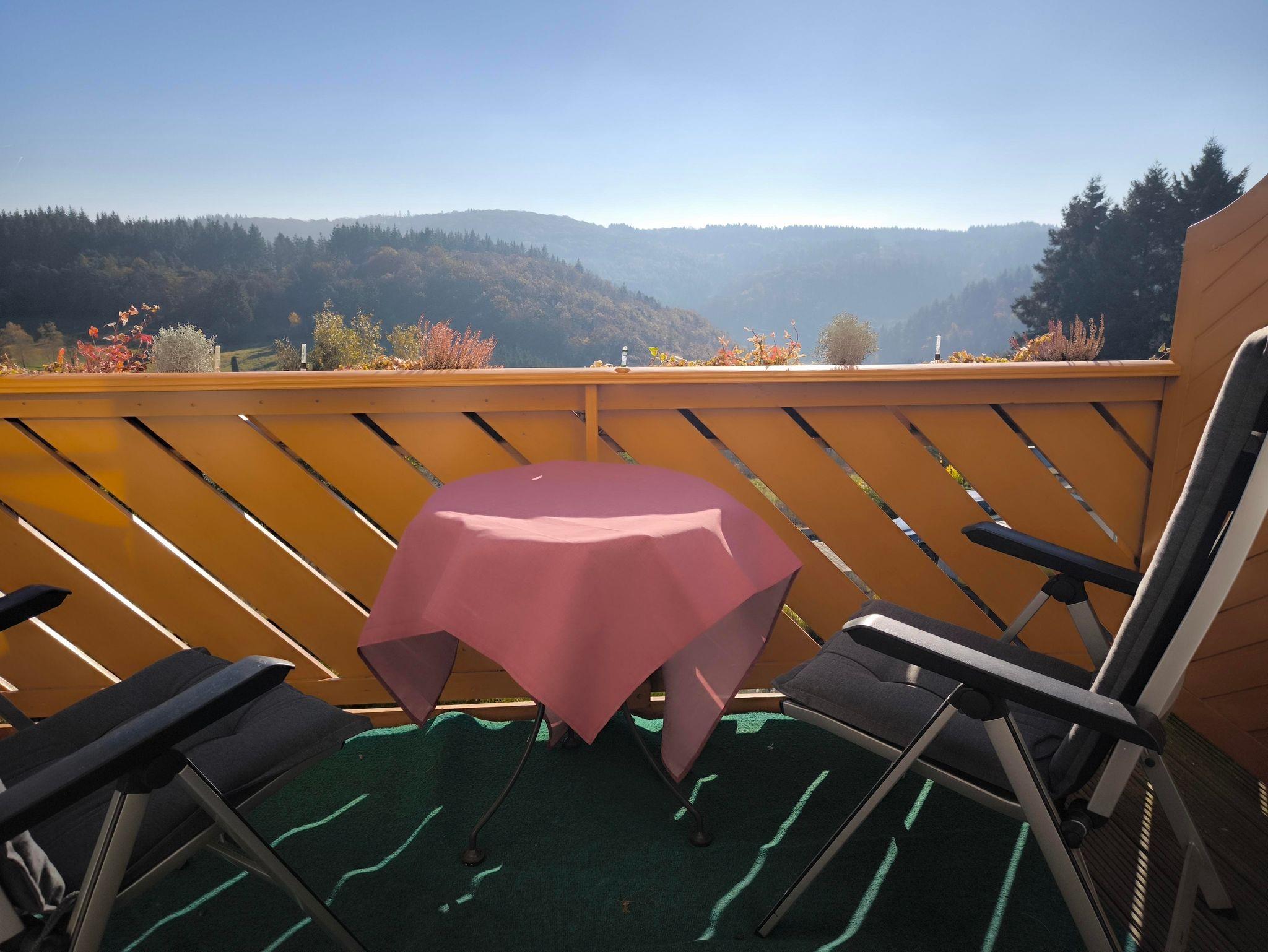 Der Balkon mit Süd-Ost Ausrichtung hat einen ungehinderten, weitschweifenden Blick über die wunderbare Eifellandschaft. Die Gartenstühle mit Auflagen, Tisch und Tischdecke und ein Sonnenschirm gehören auch zur Ausstattung.