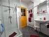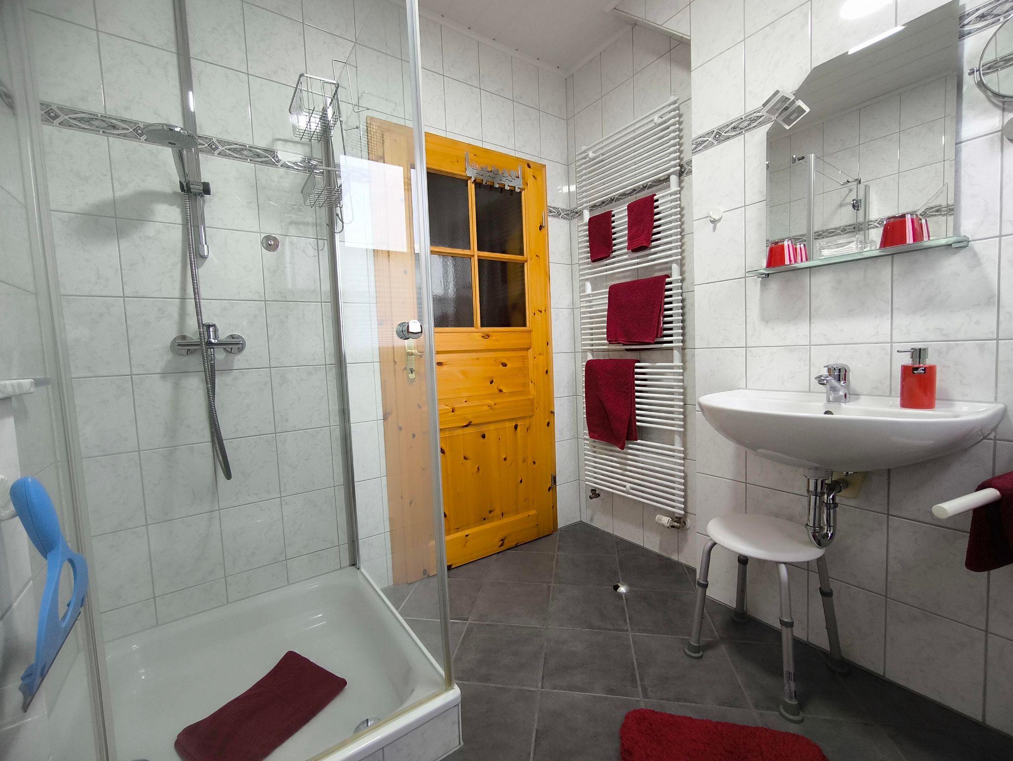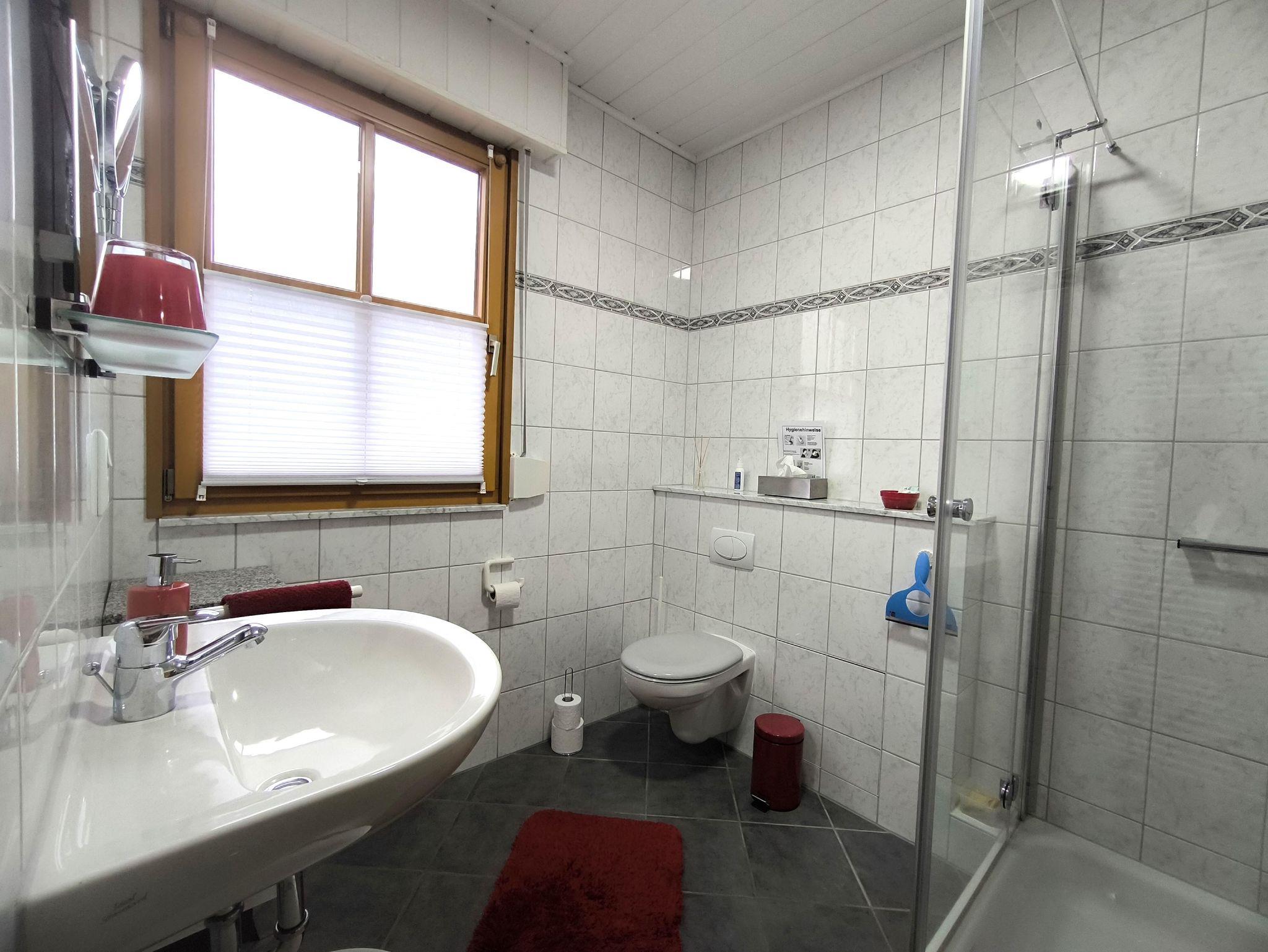 Das Badezimmer ist ein Duschbad mit Handwaschbecken und Toilette. Fön, Handtücher, eine Grundausstattung mit Toilettenpapier, Reinigungsmitteln und Seife gehören dazu.