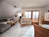 einem Wohn- und Esszimmer mit einer gemütlichen Couch-Ecke mit LCD-TV, Stereoanlage und DVD Player. In der Essecke steht ein zentral beheizter Kachelofen mit gemütlicher Holzofenbank, ein Tisch und zwei Stühle.