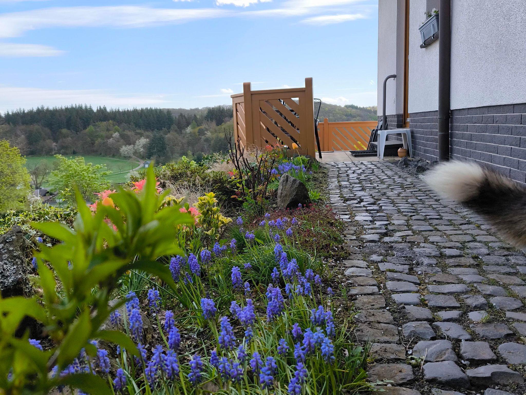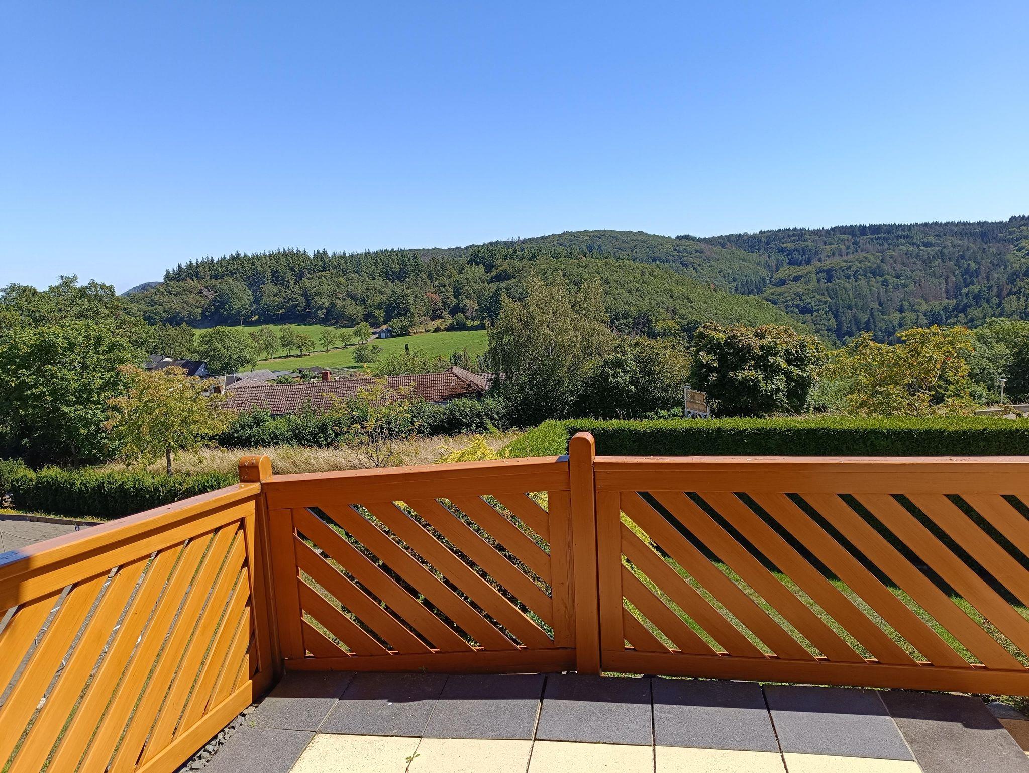 - einer Terrasse mit Süd-Ost Ausrichtung mit ungehindertem, weitschweifendem Blick über die wunderbare Eifellandschaft und den Brunnen im Vorgarten. Gartenstühle mit Auflagen und Tisch und einem Sonnenschirm.