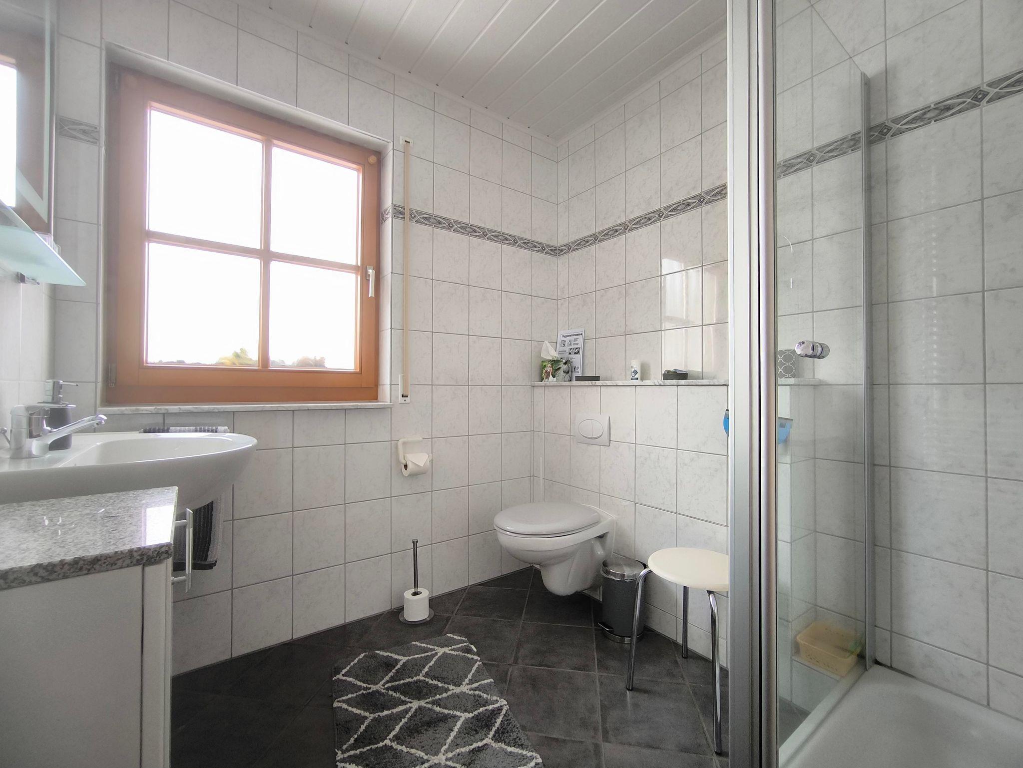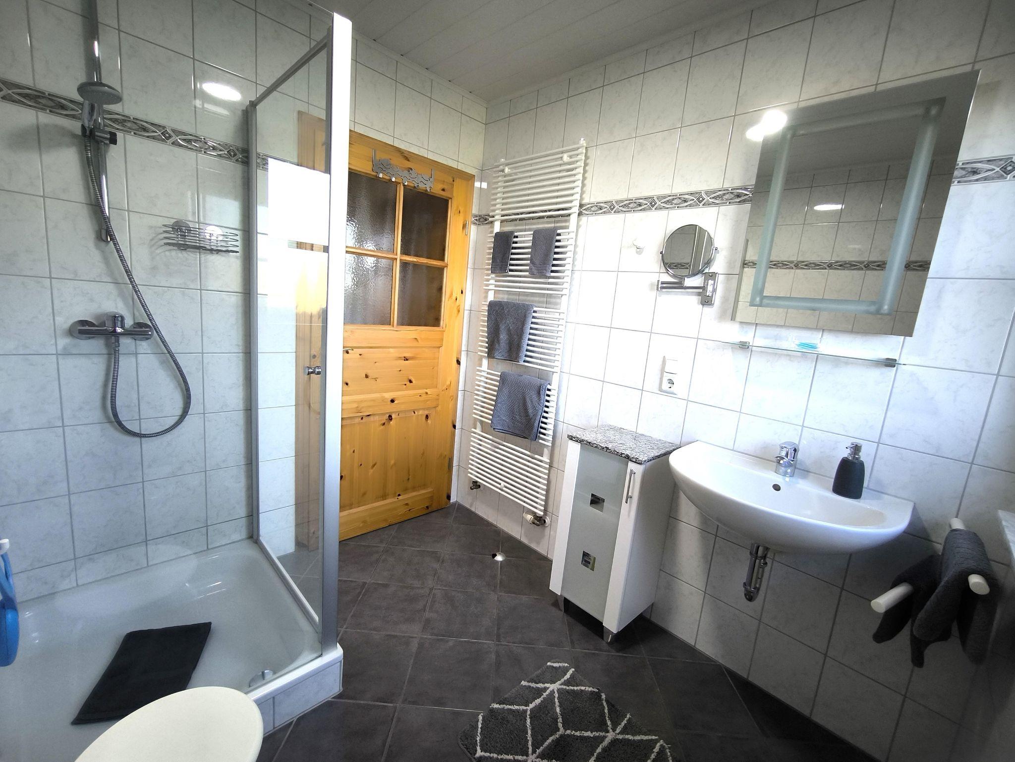 - Badezimmer mit Dusche, Fön, Handtüchern, Grundausstattung mit Toilettenpapier, Reinigungsmitteln und Seife.