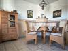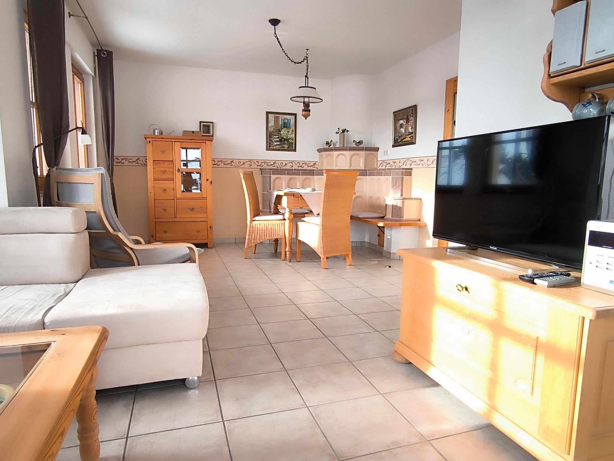 - Wohn-/Esszimmer mit einer gemütlichen Couch-Ecke mit Stereoanlage, LCD-TV, DVD Player und Leselampe. In der Essecke steht ein zentral beheizter Kachelofen mit gemütlicher Holzofenbank, ein Tisch und zwei Stühle.