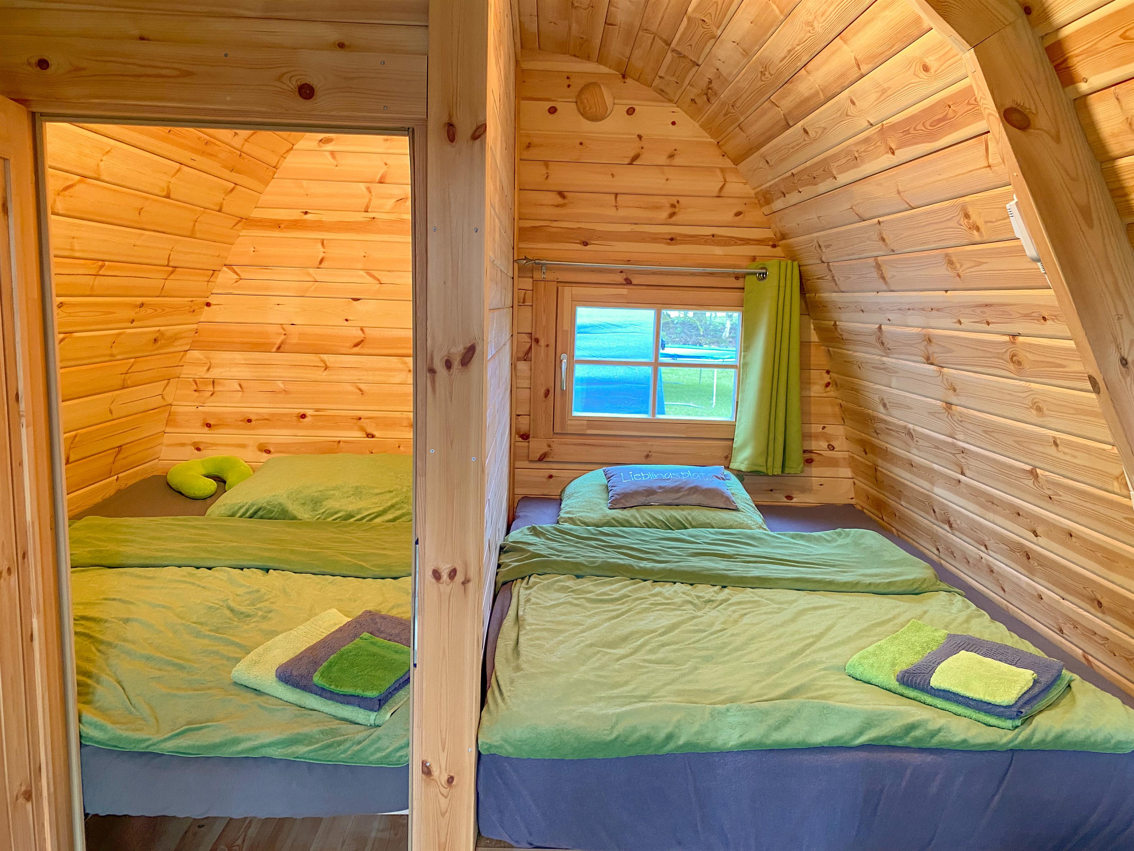 Der Glückspilz (er war als erstes Fass auf der Wiese), ist für max 4 Personen ausgestattet. 2 Schlafbereiche mit je 140 x 200 cm Matratzen können genutzt werden. Im vorderen Wohnbereich befindet sich ein kleiner, stabiler Tisch mit 4 Sitzmöglichkeiten.