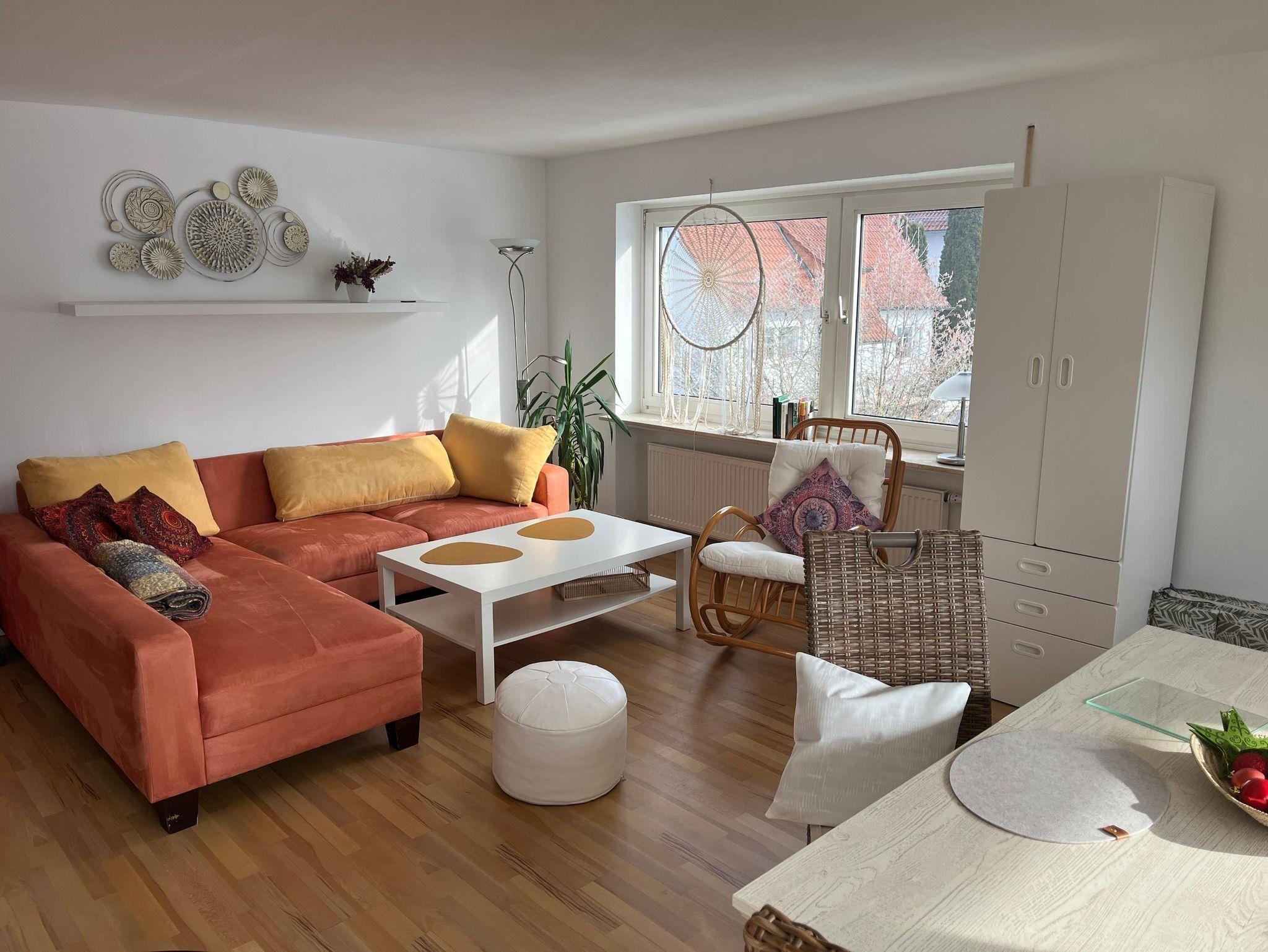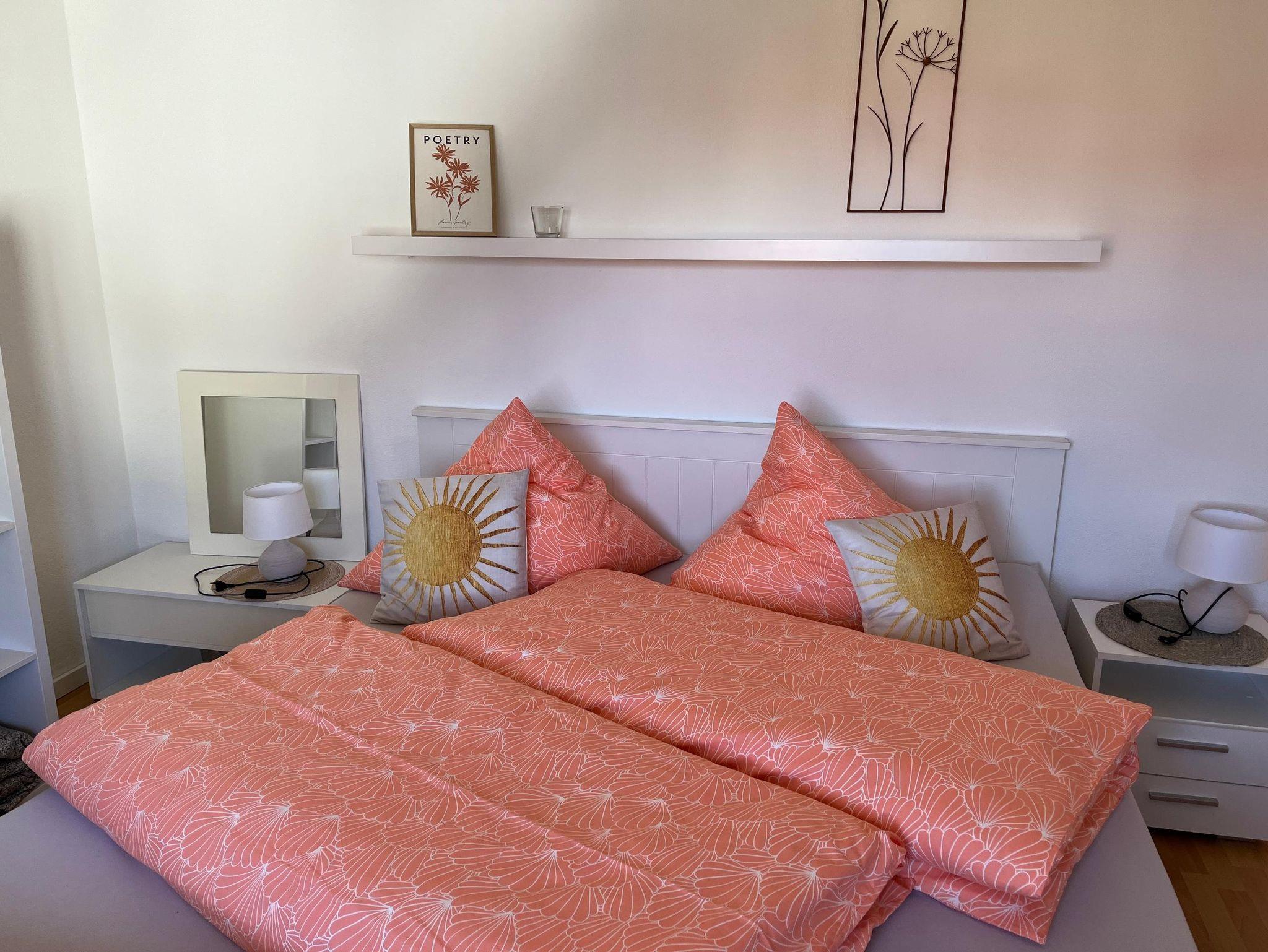 Die ca. 80–100 m² große Ferienwohnung ist für 2 bis 4 Personen ausgelegt und überzeugt durch großzügige, helle Räume. Das Wohnzimmer ist ausgestattet mit einem großen Sofa, TV und einem einladenden Essbereich, der zum Verweilen einlädt. Die Küche wurde modern eingerichtet und bietet Spülmaschine, Backofen, Mikrowelle, Kaffeemaschine, Wasserkocher und Toaster. Es gibt zwei Schlafzimmer: Schlafzimmer I mit Doppelbett (180 × 200 cm) und Kleiderschrank, Schlafzimmer II mit Bettgröße 140 × 200 cm kann auf Anfrage und gegen geringen Aufpreis hinzugebucht werden. Bettwäsche und Handtücher sind inklusive. Das Badezimmer verfügt über Waschbecken, Badewanne/Dusche, Kosmetikspiegel und Fön, das WC ist separat. Eine zusätzliche Waschmaschine im Keller steht ebenfalls zur Verfügung. Zwei Balkone mit Sitzmöbeln ermöglichen erholsame Stunden im Freien und bieten eine wunderbare Aussicht auf die Umgebung.