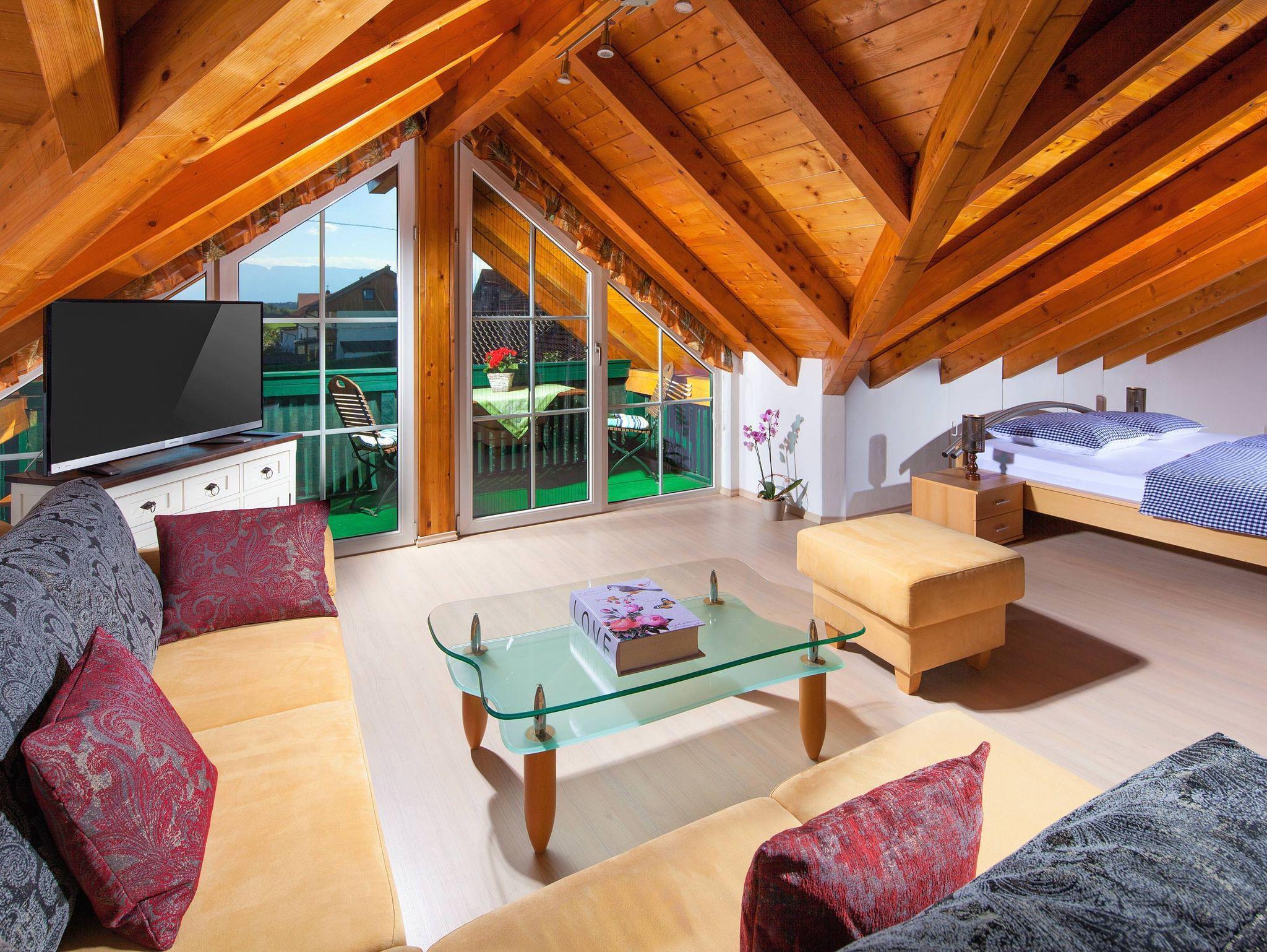 Sie wollten schon immer einmal im Dachgeschoss wohnen? Die Dachschräge und viel Holz sorgen für eine einzigartige Atmosphäre. Natürlich haben Sie auch dort einen sonnigen Südbalkon mit herrlichem Weitblick über die liebliche, bunte Landschaft zu den Bergen. Eine Einbauküche läd zum Kochen ein. Tisch, Eckbank und Bestuhlung wurden aus Naturholz angefertigt.
