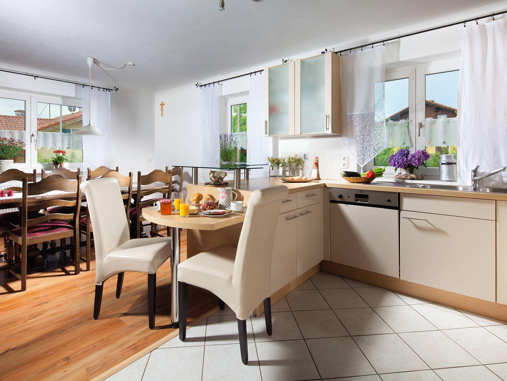 Die Ferienwohnung 2 verfügt über ca. 110m², befindet sich im 1. Stock mit einen sonnigen Südbalkon. Der Balkon ist mit Tisch, Stühle und Sonnenschirm ausgestattet. Die moderne großzügige Einbauküche mit elegantem Raumteiler lädt zum Kochen ein. Der große Esstisch mit zehn Bestuhlung sind aus rustikalem Altholz angefertigt. Die großzügige Wohnraum-Galerie vermittelt ein offenes gemütliches Wohlgefühl.