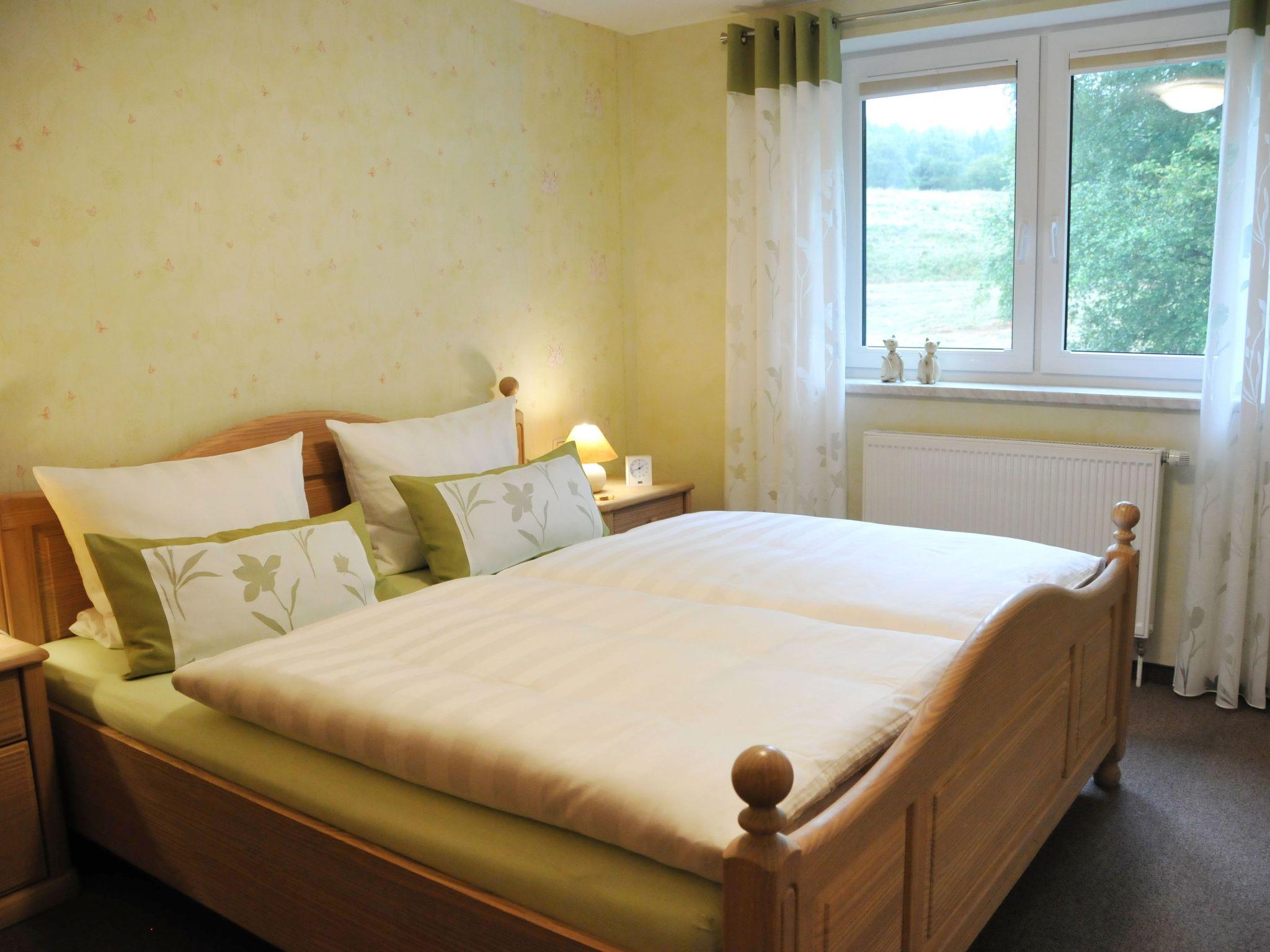 The 120m² holiday flat with separate entrance is spread over two floors. The ground floor consists of the following rooms: a living room with pull-out couch, a modern flat-screen TV with satellite TV, DVD player and stereo system, as well as access to a covered terrace with a view of the farm garden and pond, a bedroom with double bed and storage space for your textiles, an open, fully equipped fitted kitchen with hob, oven, microwave and dishwasher and an adjoining bathroom with shower and WC. In the basement there is another fully furnished bedroom with a double bed, a bathroom with WC and a separate shower. A well-stocked library and a sauna with relaxation room await you in bad weather.