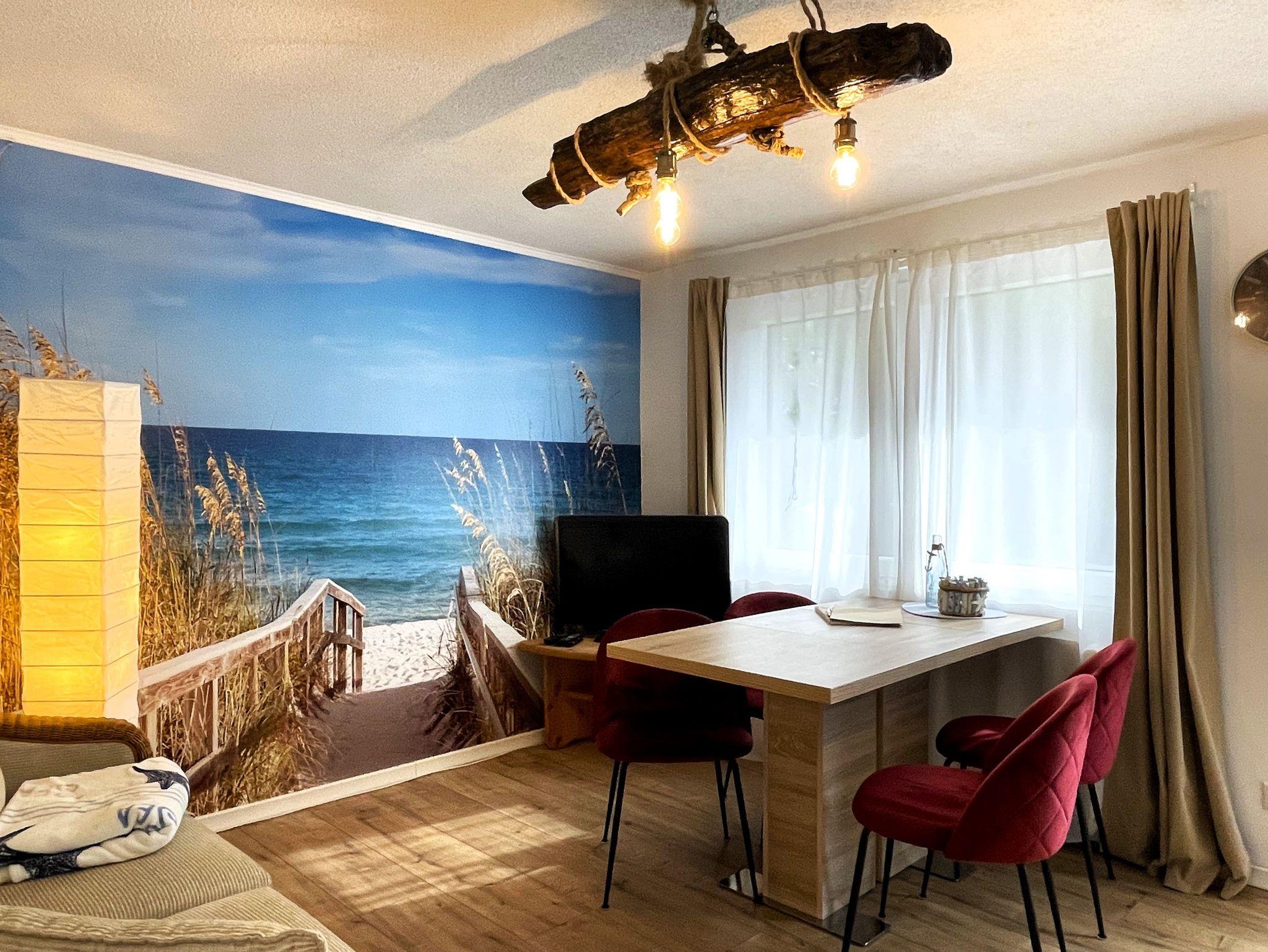 Im Erdgeschoss empfängt Sie ein gemütlicher Wohnbereich mit Sofa, Esstisch und Smart-TV. Die offene Küche ist komplett ausgestattet und lädt dazu ein, gemeinsame Mahlzeiten zuzubereiten. Im angrenzenden Schlafzimmer mit Doppelbett sorgt ein Dachfenster für einen Blick in den Sternenhimmel, während die kleine Terrasse direkt vor der Tür den perfekten Ort für den ersten Kaffee am Morgen bietet. Ein modernes Bad mit Dusche und WC rundet die Etage ab.