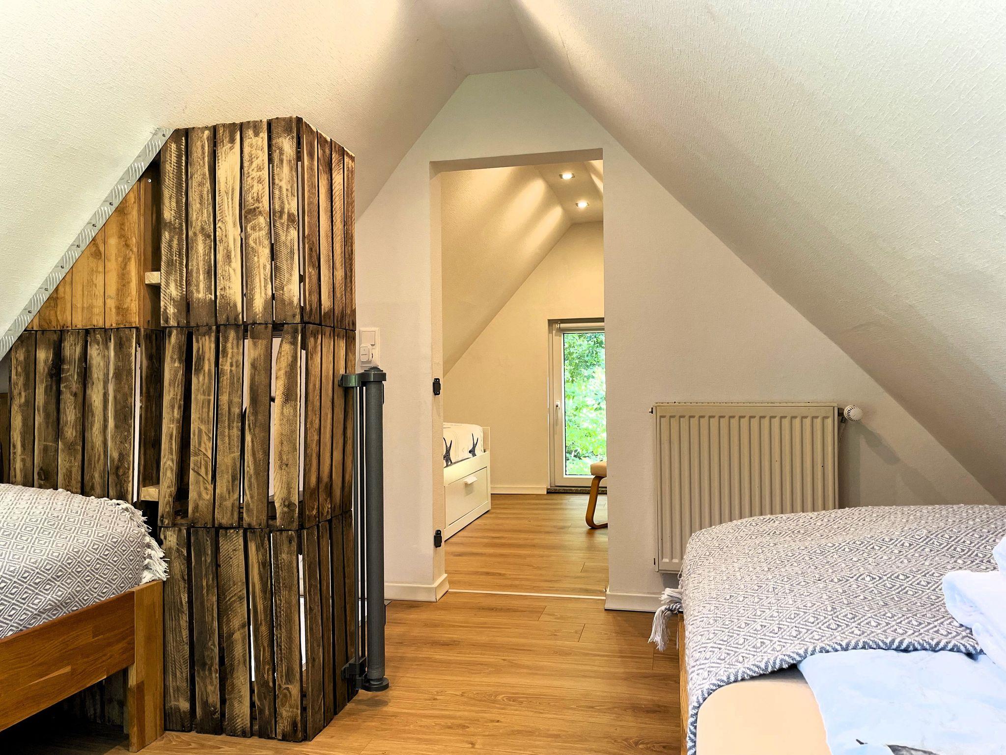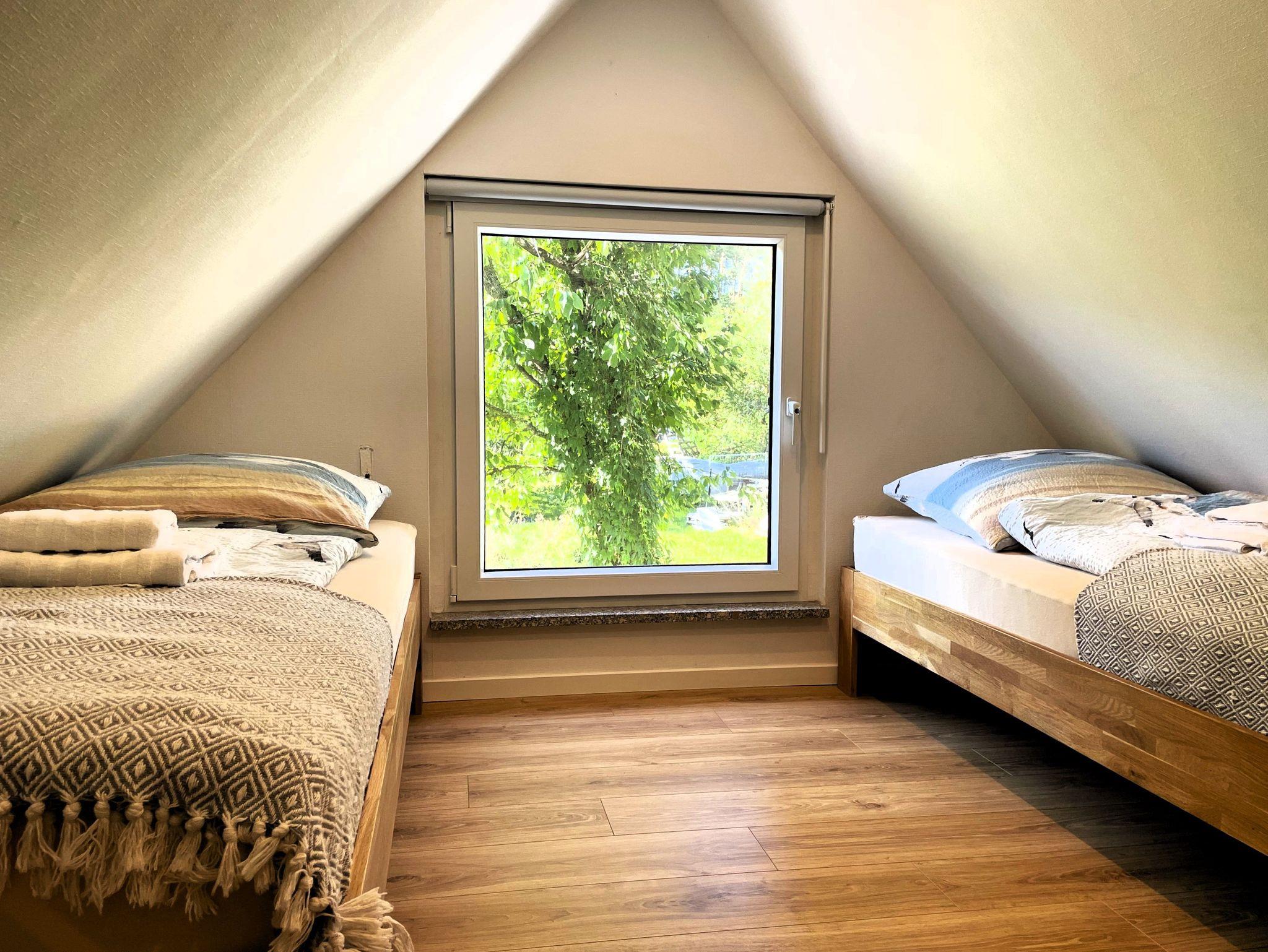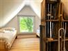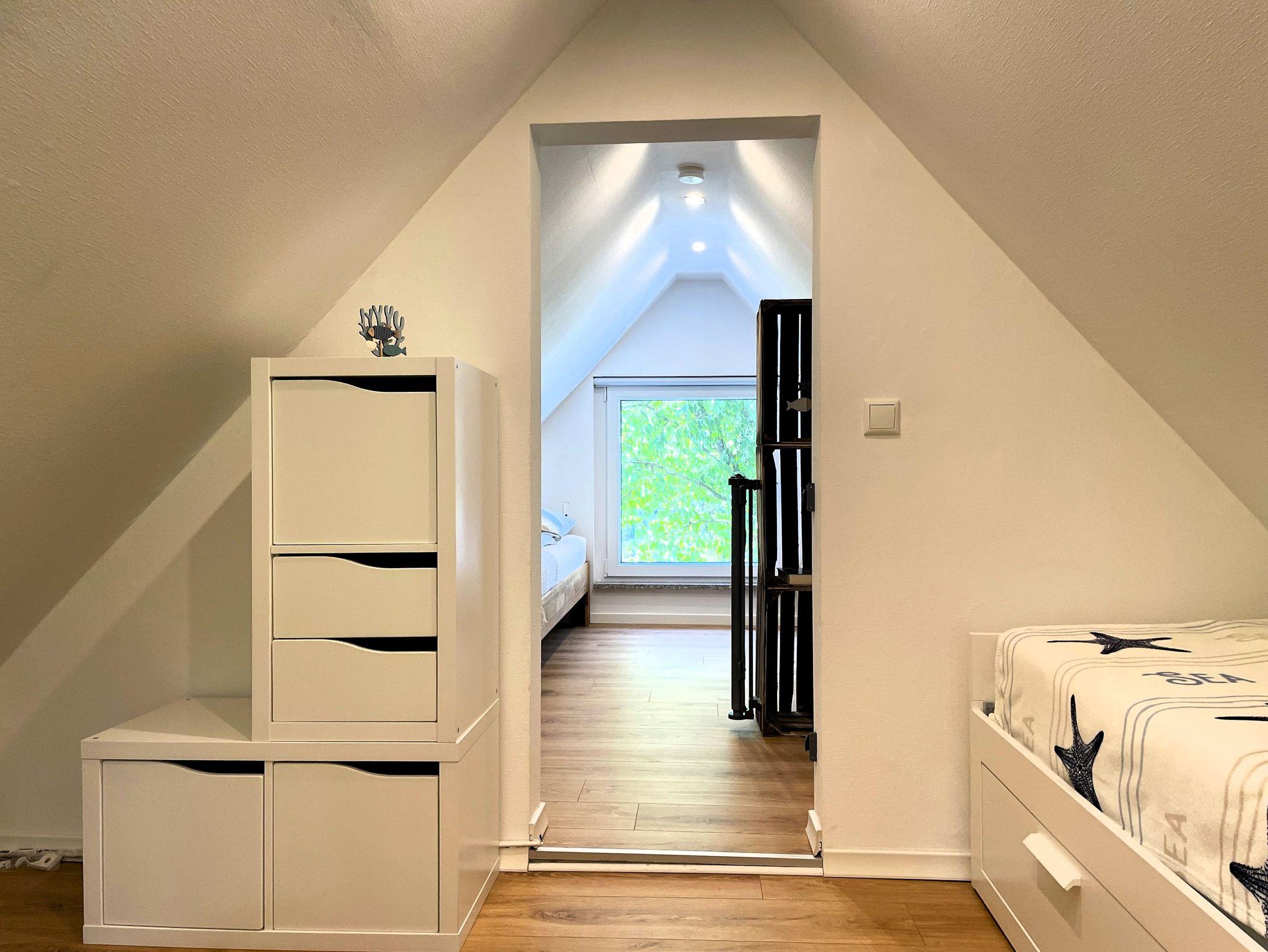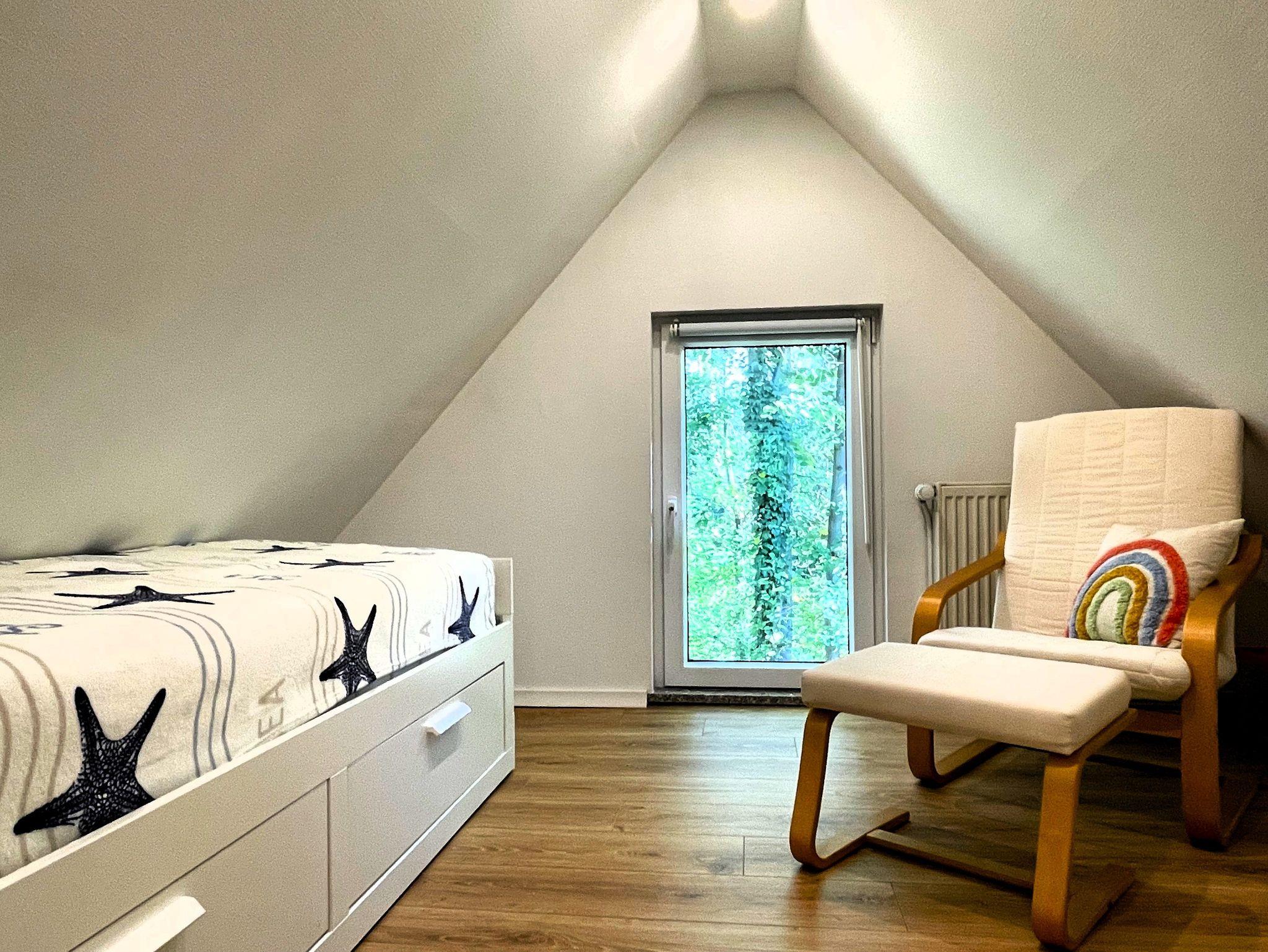 Eine Wendeltreppe führt ins Dachgeschoss, wo zwei getrennt stehende Betten sowie ein zusätzlicher Bereich auf Sie warten ob als Kinderzimmer, kleine Spielecke oder ruhiger Platz zum Lesen und Ausruhen.