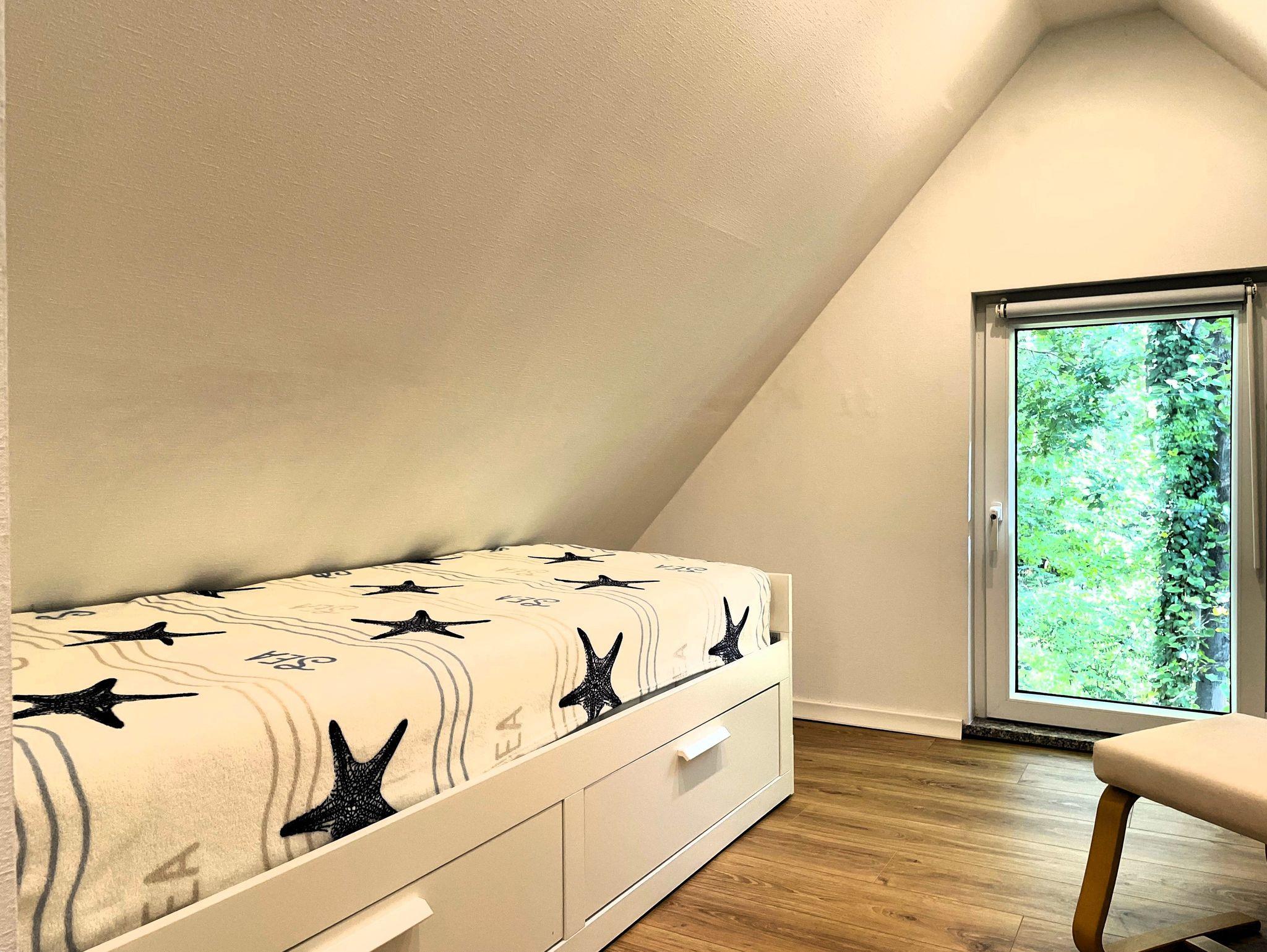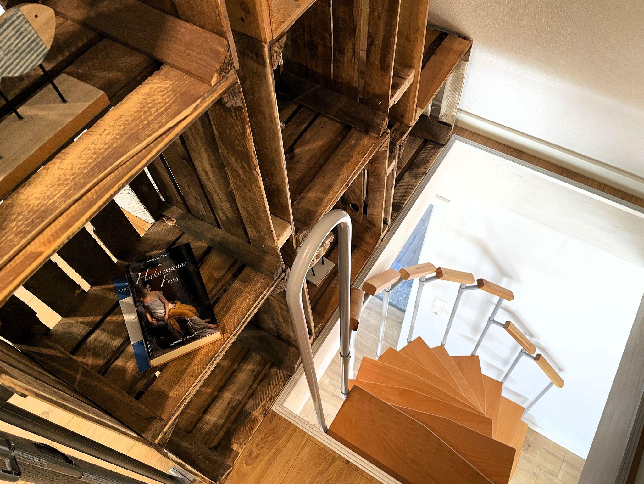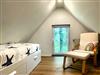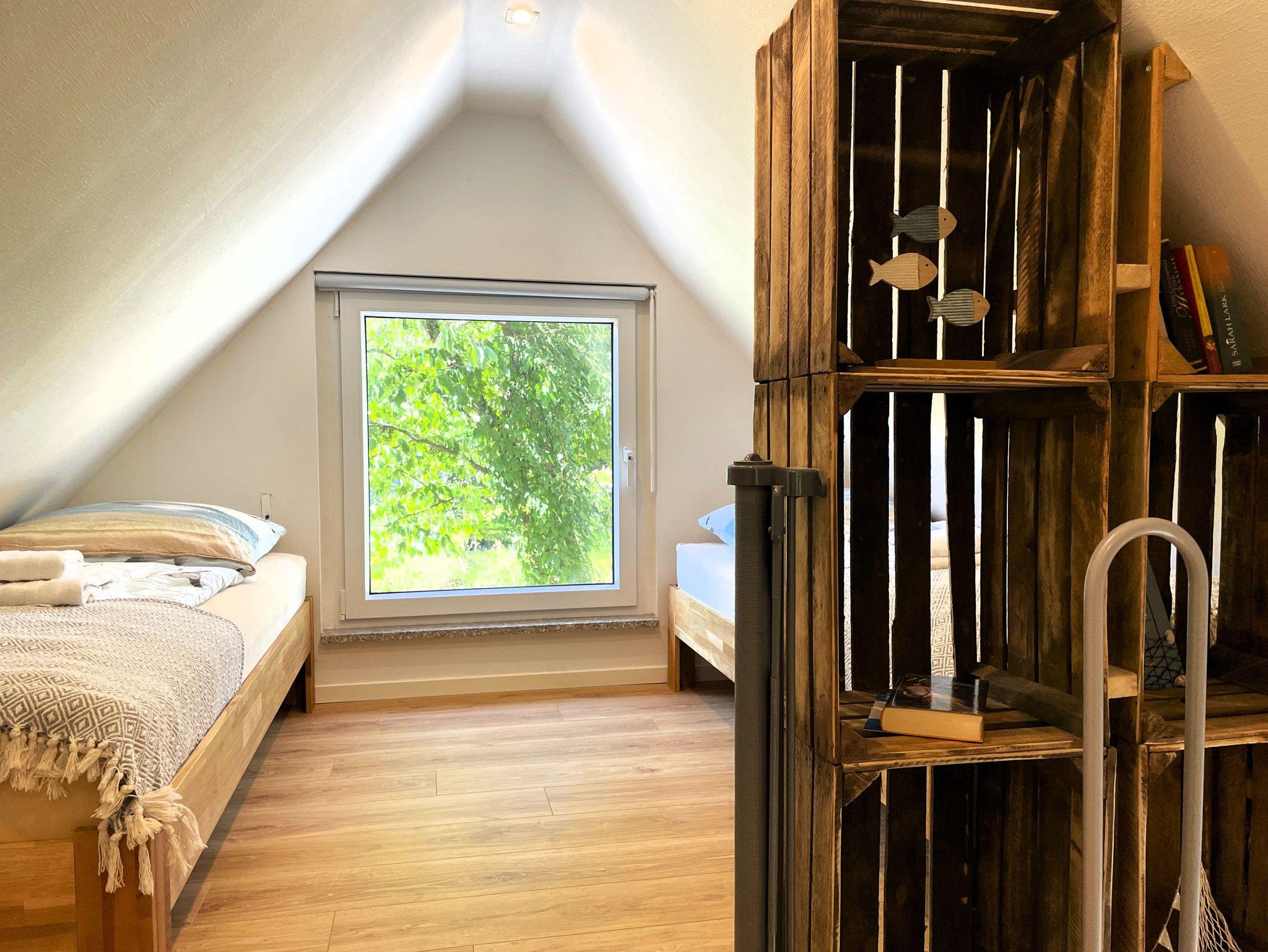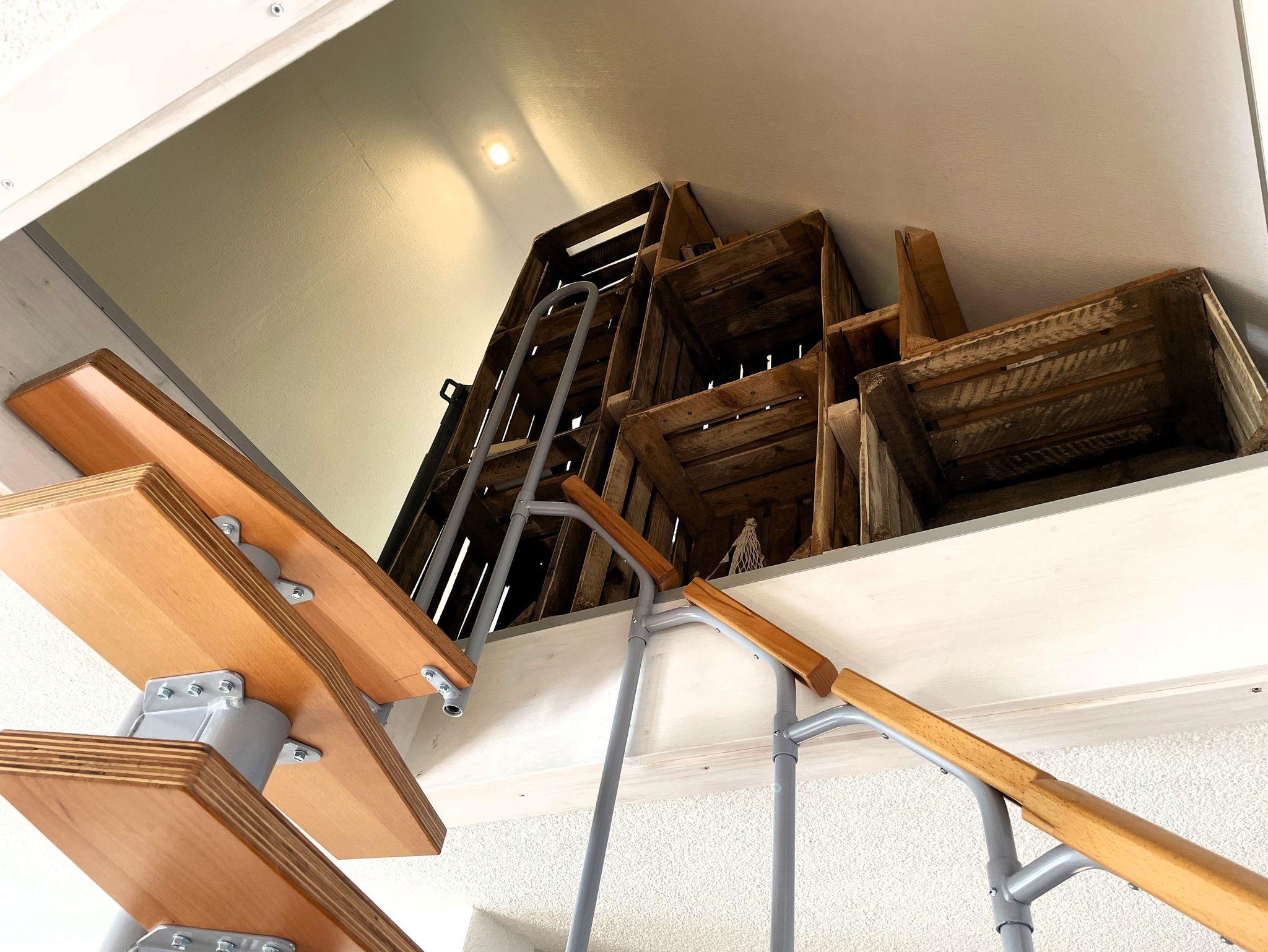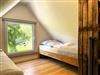 Eine Wendeltreppe führt ins Dachgeschoss, wo zwei getrennt stehende Betten sowie ein zusätzlicher Bereich auf Sie warten ob als Kinderzimmer, kleine Spielecke oder ruhiger Platz zum Lesen und Ausruhen.